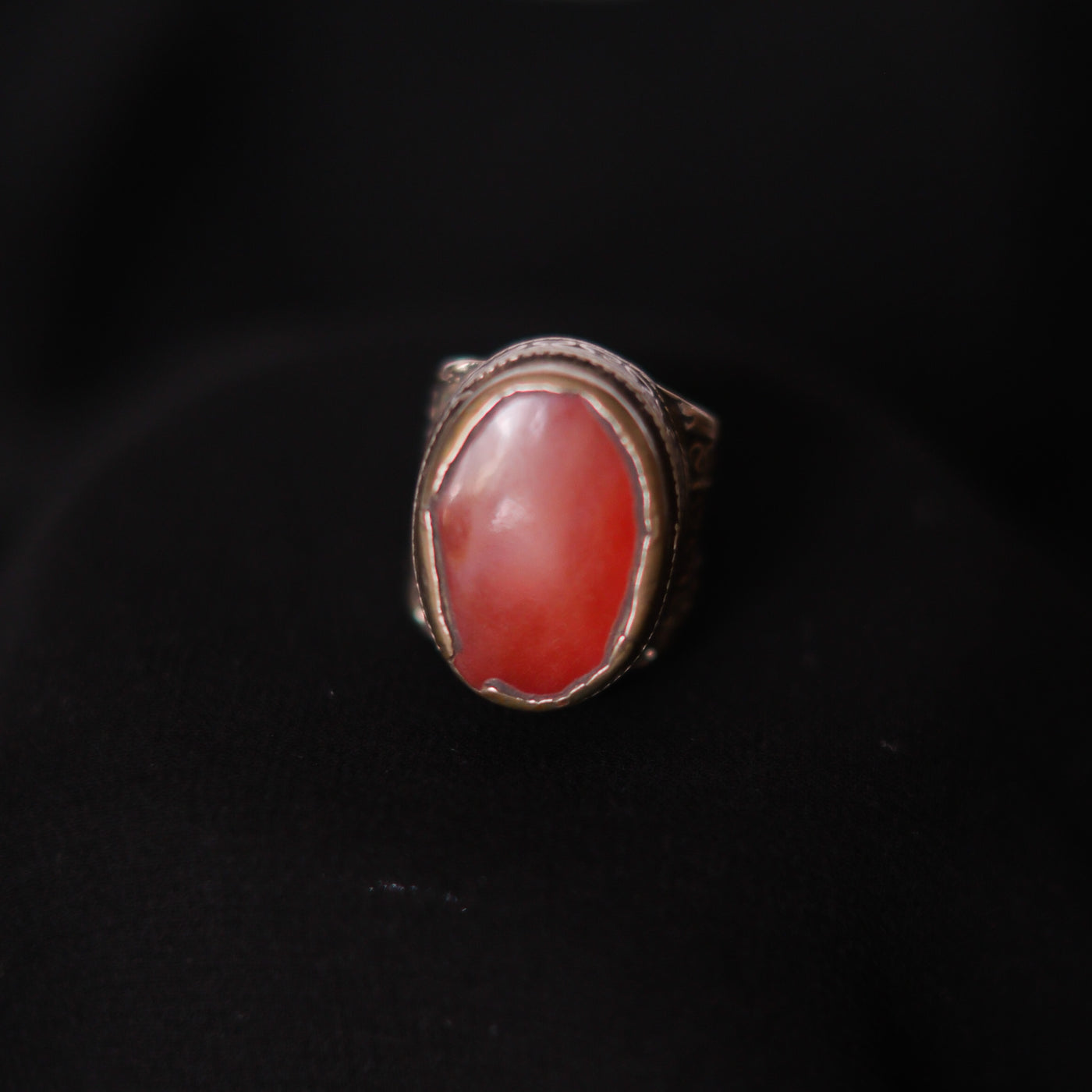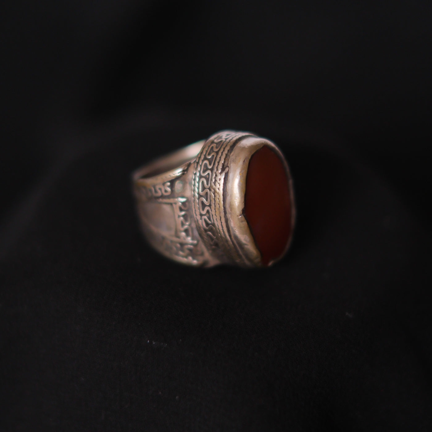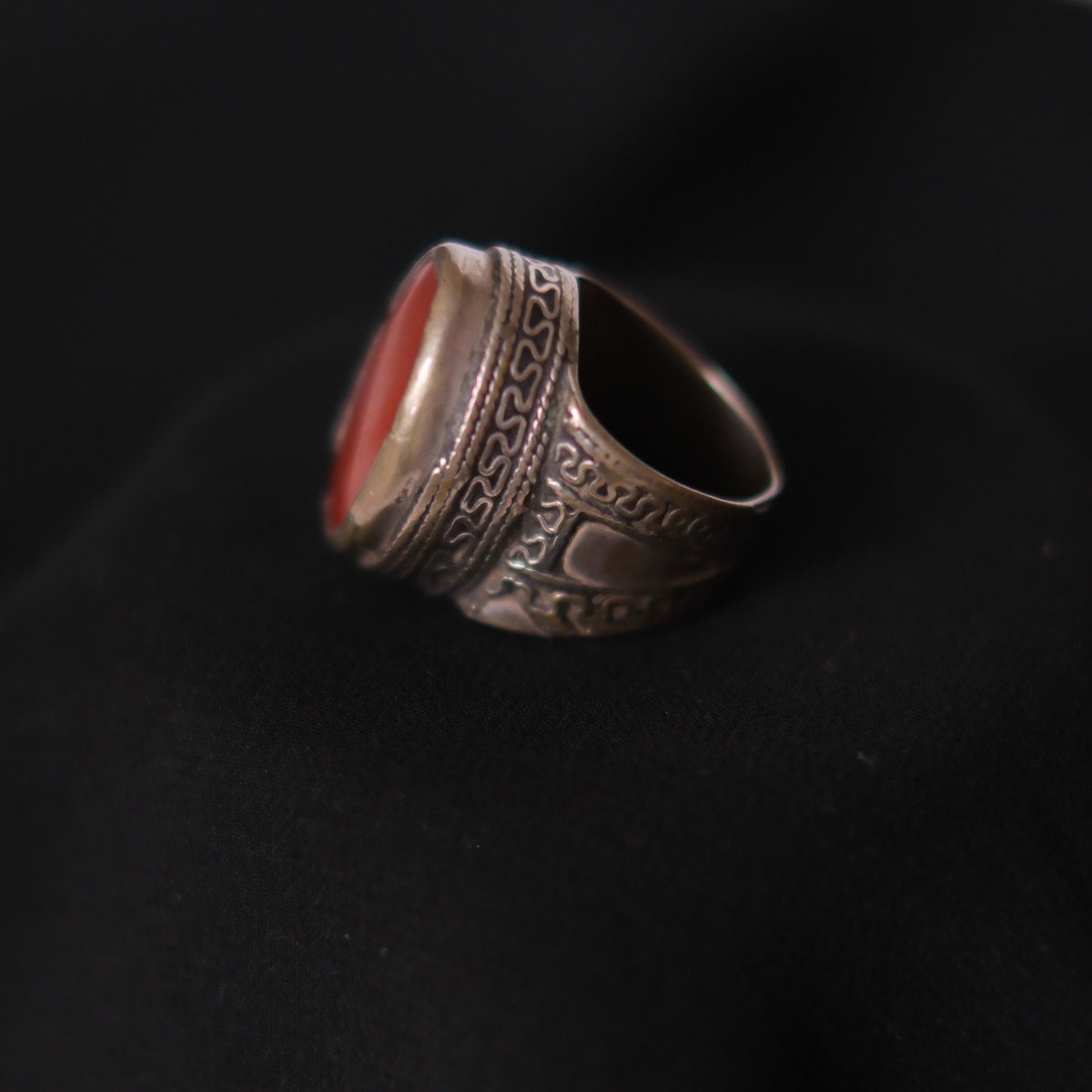 Anillo antiguo turcomano hecho a mano con plata y agata carneola. Tiene una excelente patina.