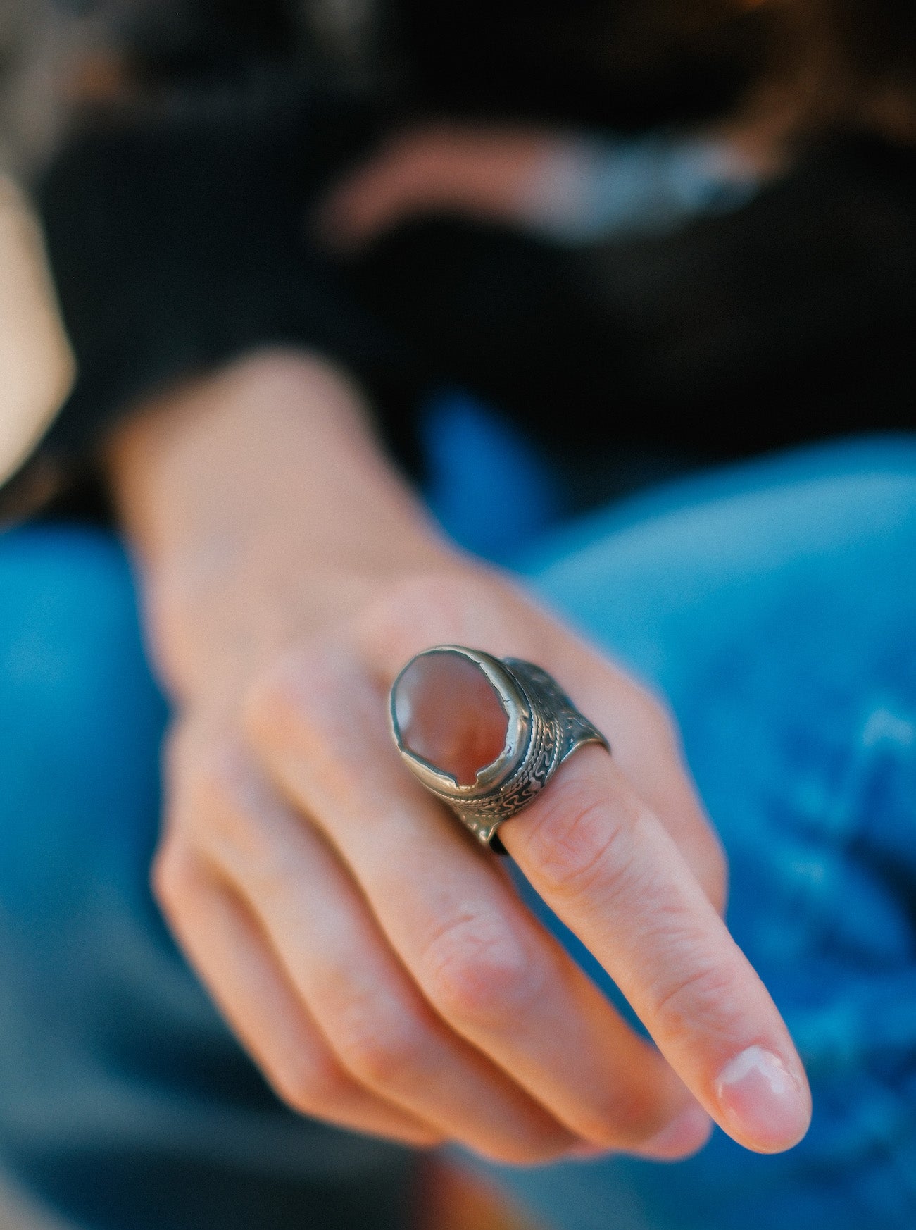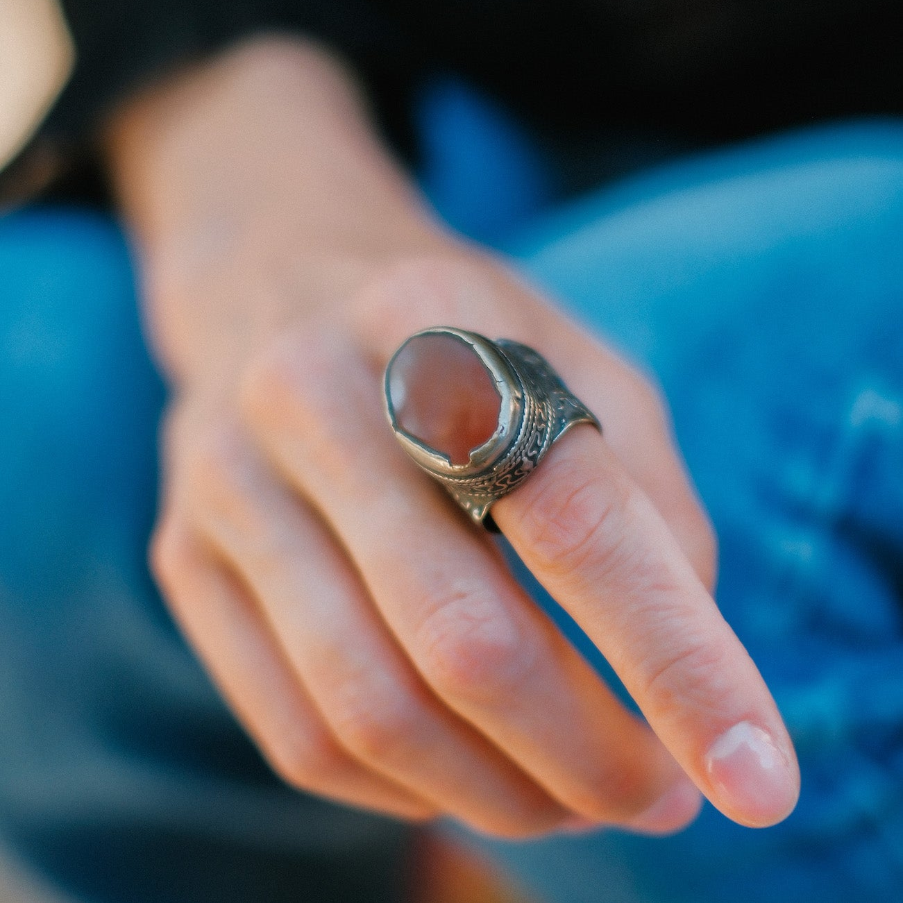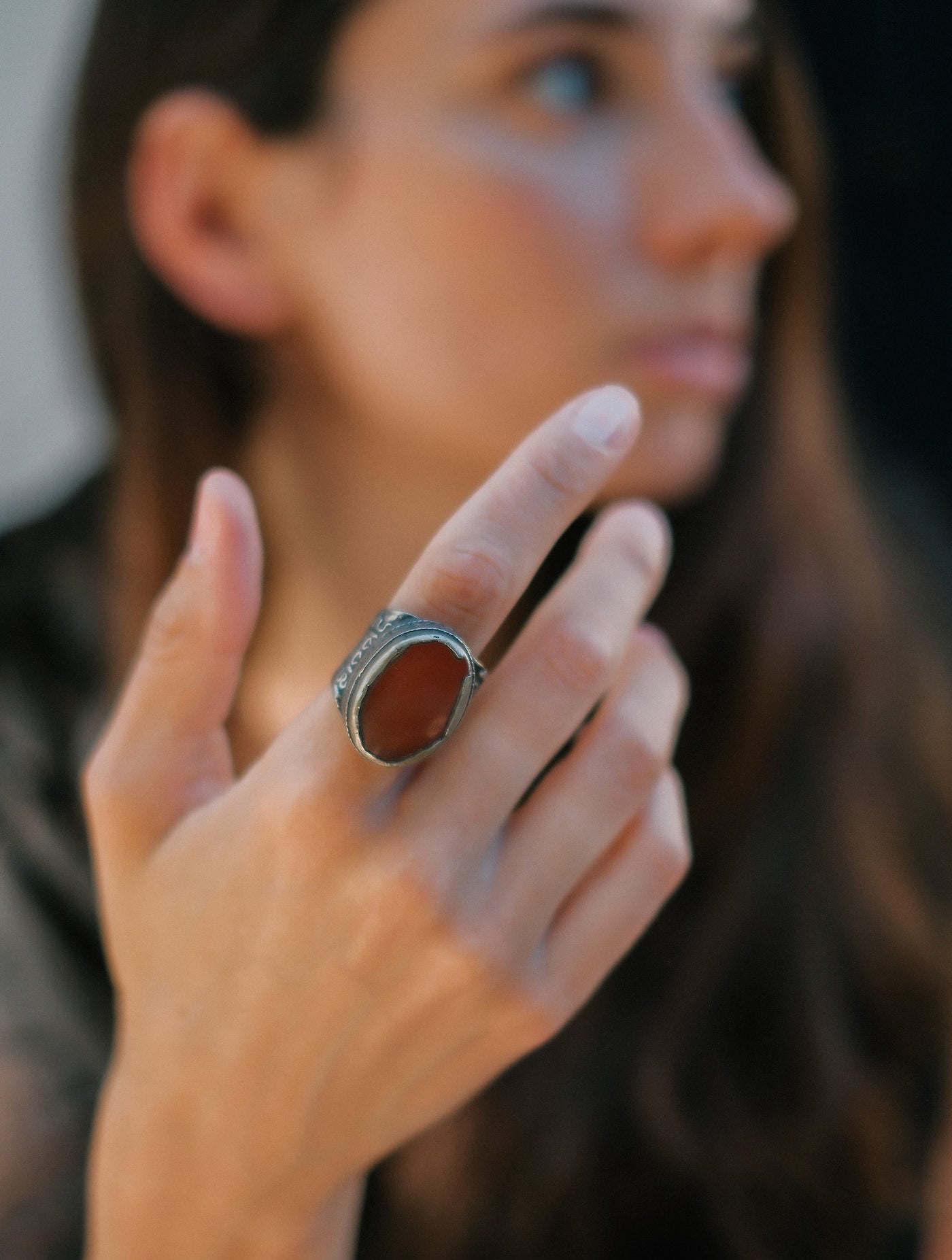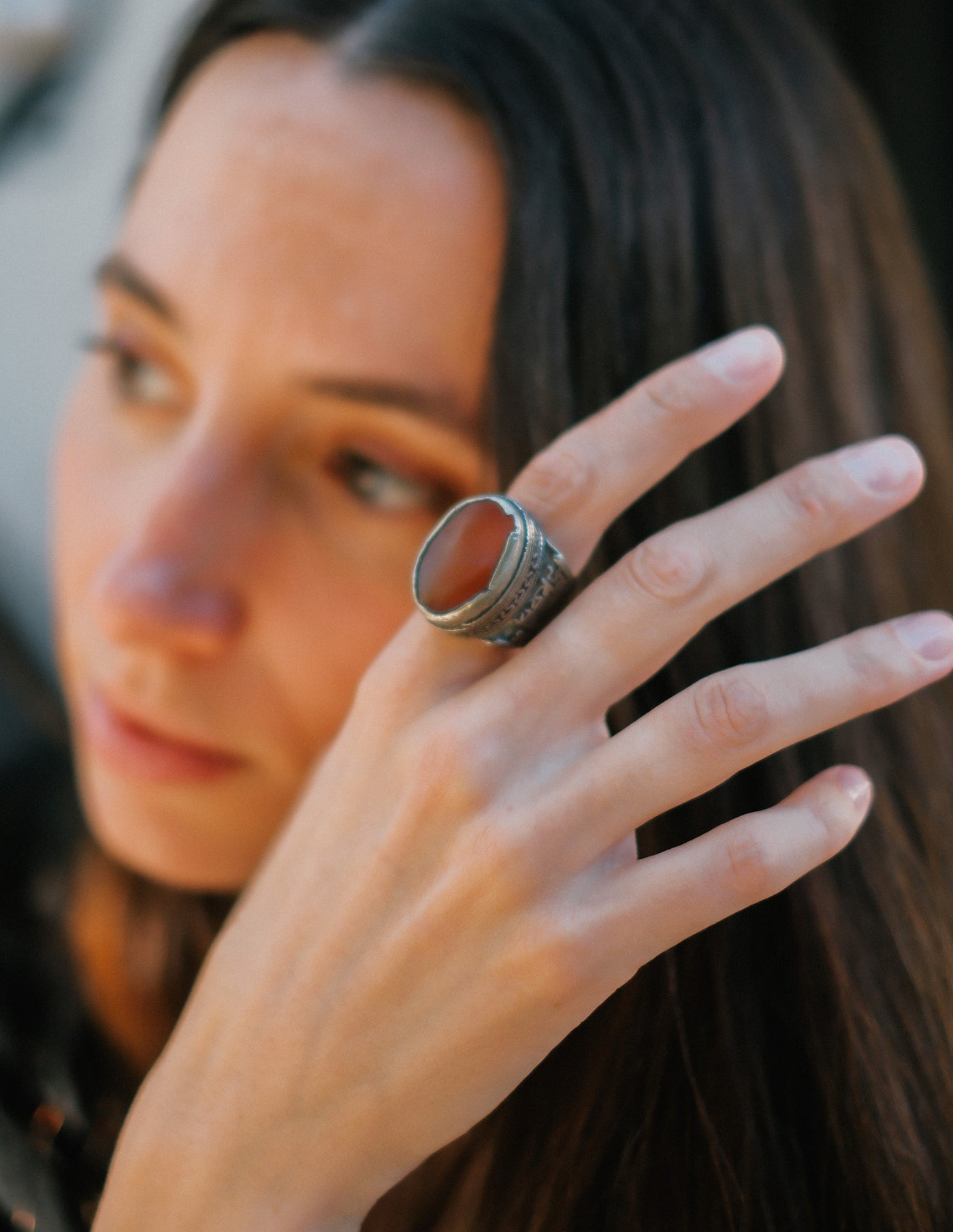 Anillo antiguo turcomano hecho a mano con plata y agata carneola. Tiene una excelente patina.