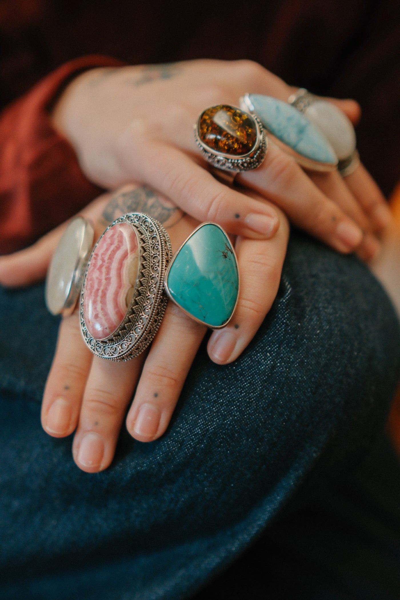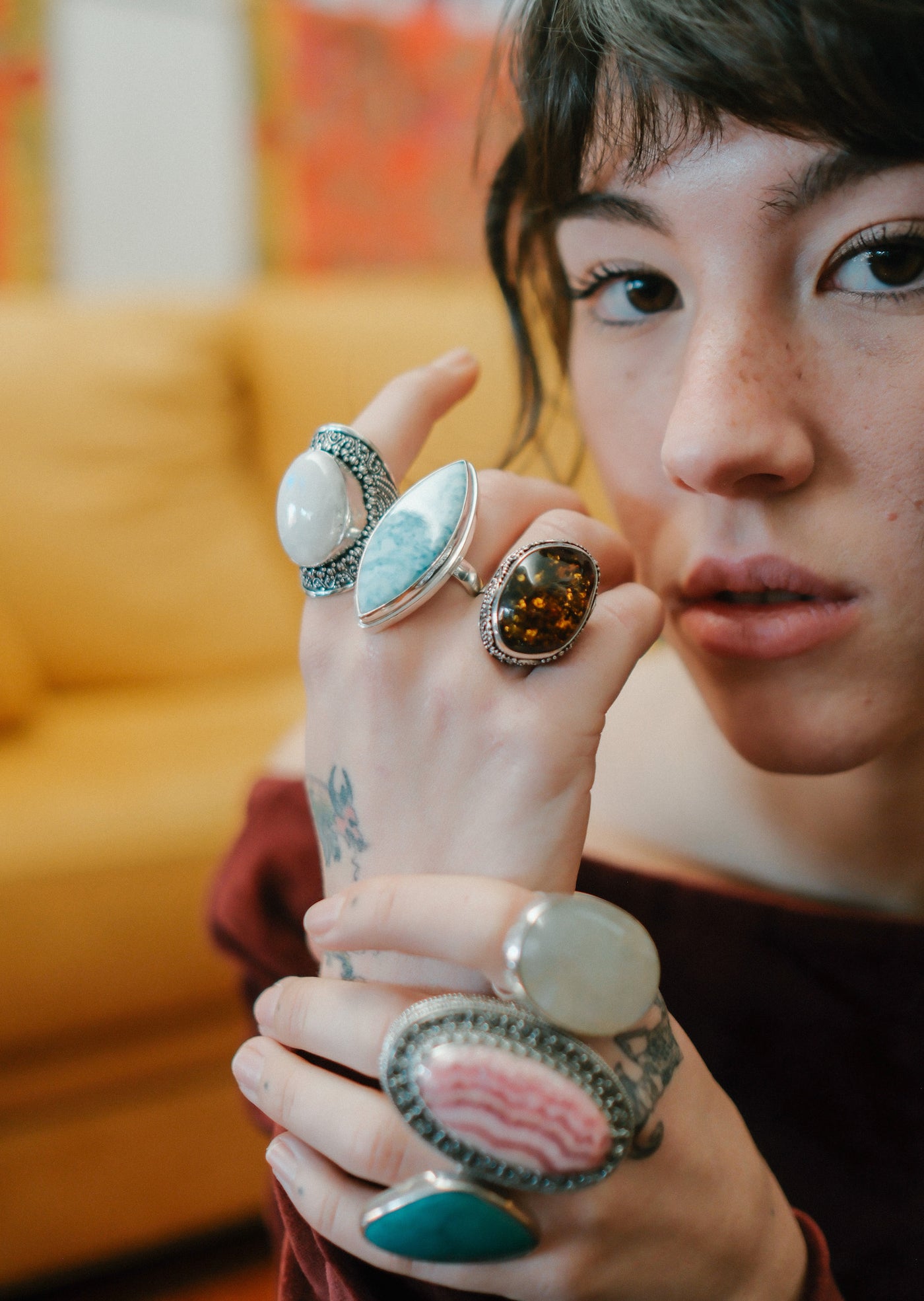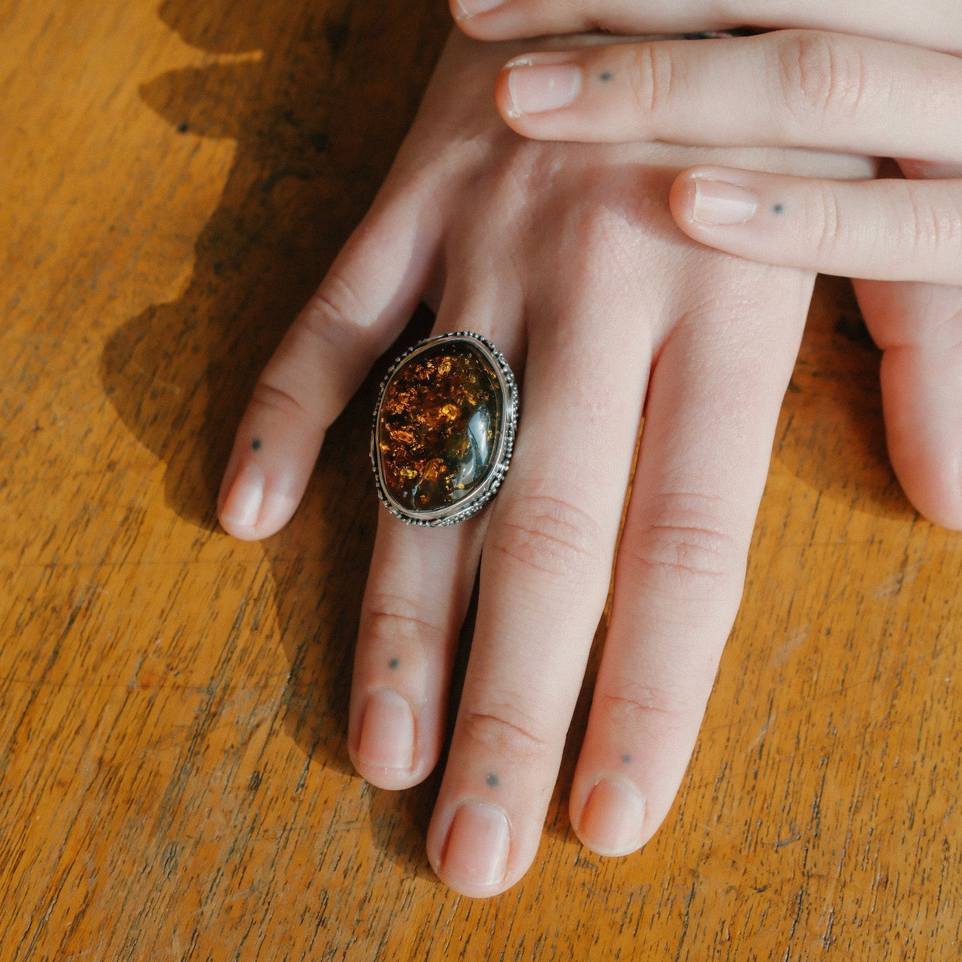 Anillo artesanal hecho a mano con plata de ley, técnica de granulado, característica de la isla de Bali y cabujón de ámbar natural. Esta abierto por la parte posterior lo que hace que se pueda adaptar a diferentes tamaños.