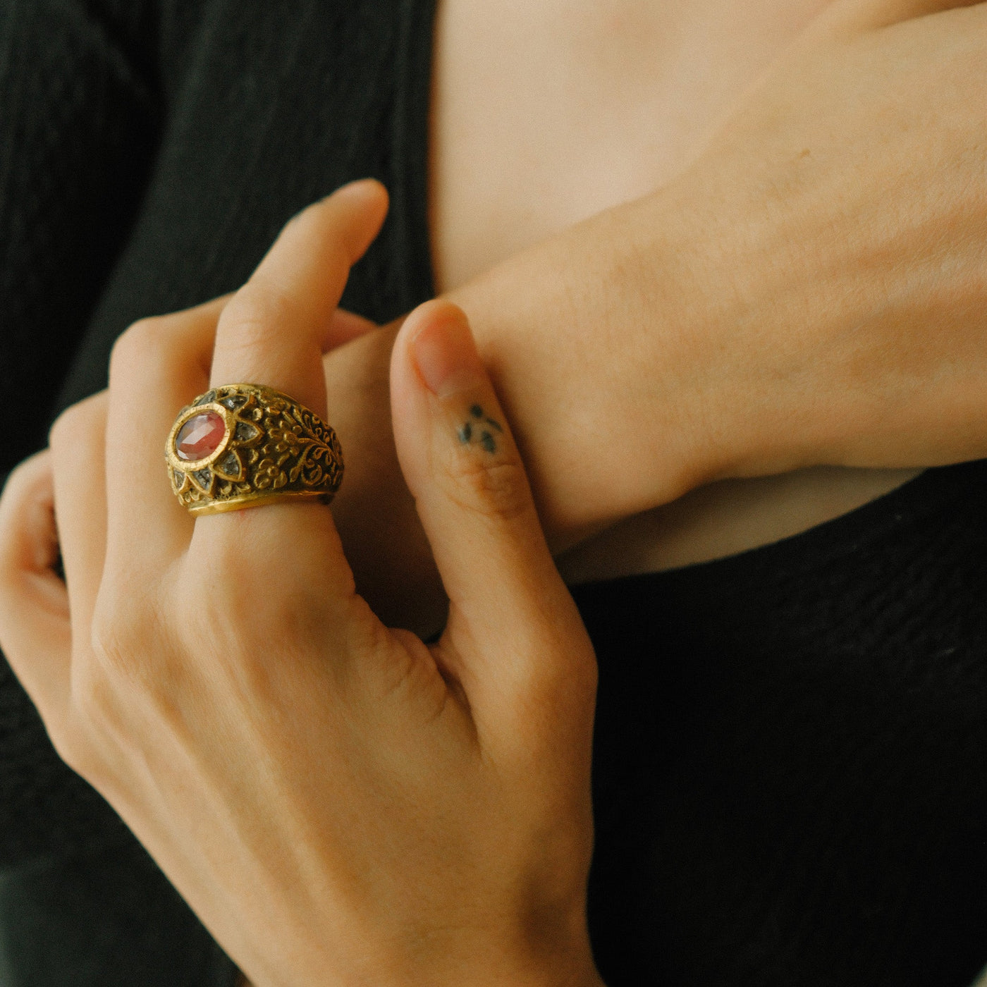 Anillo artesanal vintage de mediados del siglo XX, de India hecho artesanalmente con oro, rubi central y diamantes polki ( diamantes naturales que conservan la forma original en que se encuentran en la naturaleza, sin tallar y con un brillo mas suave y natural) El oro es de 22 k y esta cincelado a mano.