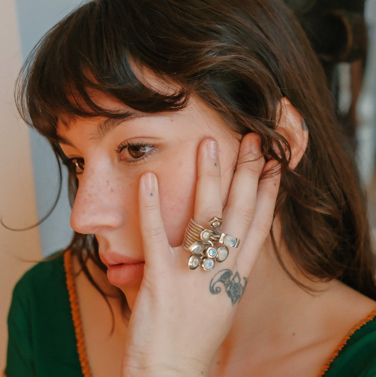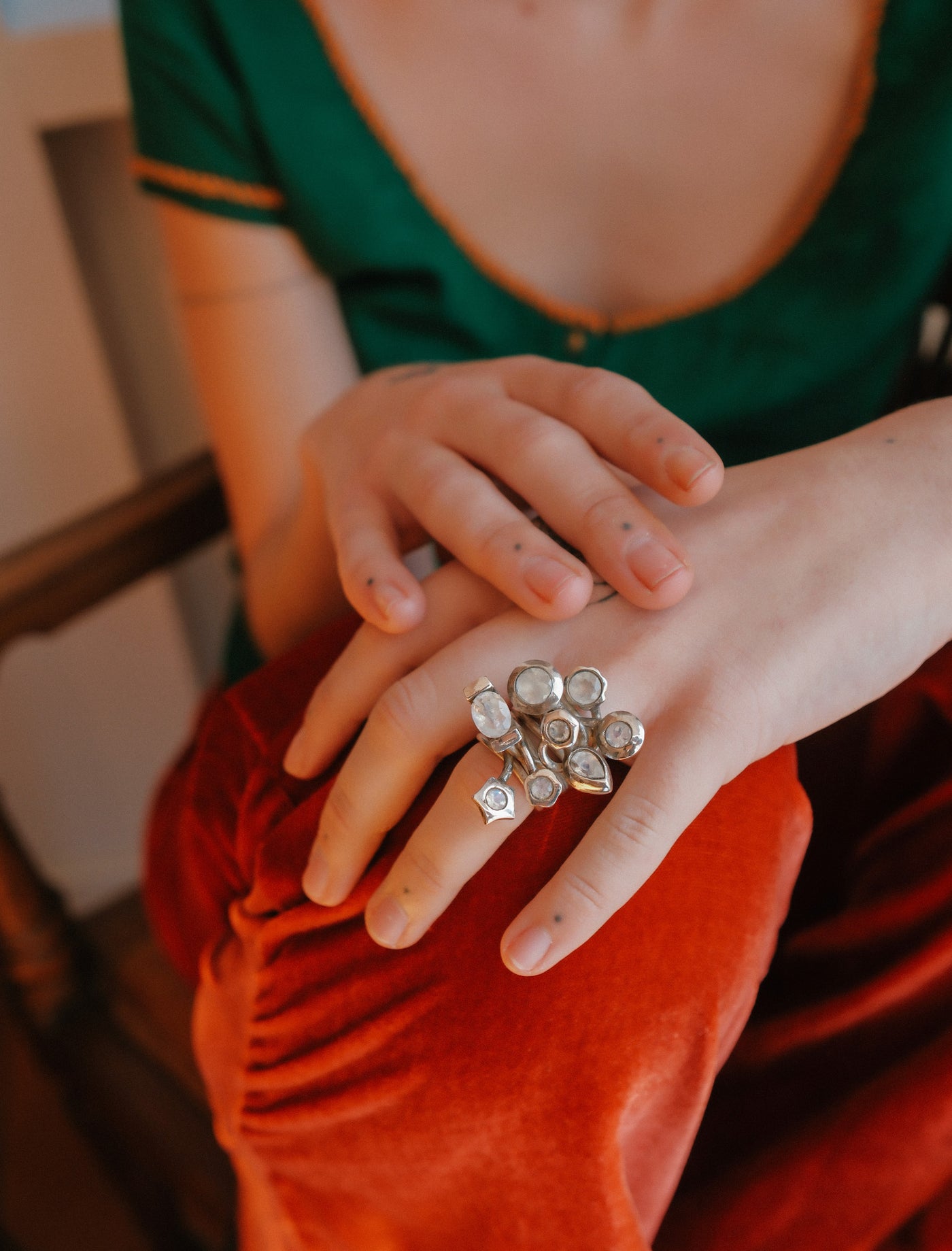 Anillo artesanal hecho a mano con plata de ley y 8 piedras de luna arcoiris facetadas.