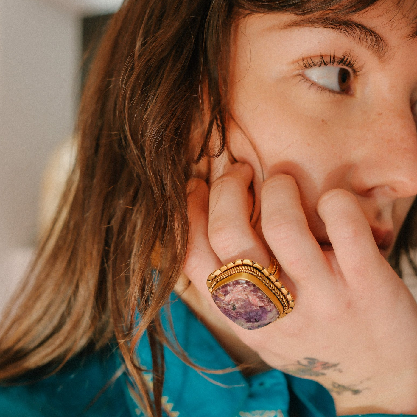 Anillo artesanal hecho a mano con plata de ley, baño de oro mateado y cabujón de charoita, piedra natural asociada con la protección energética , calma emocional e intuición. Pieza única.