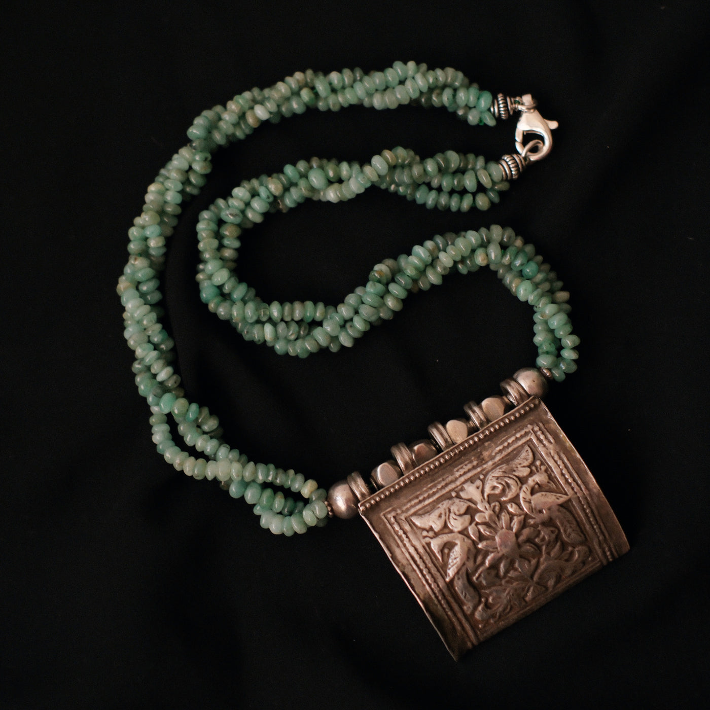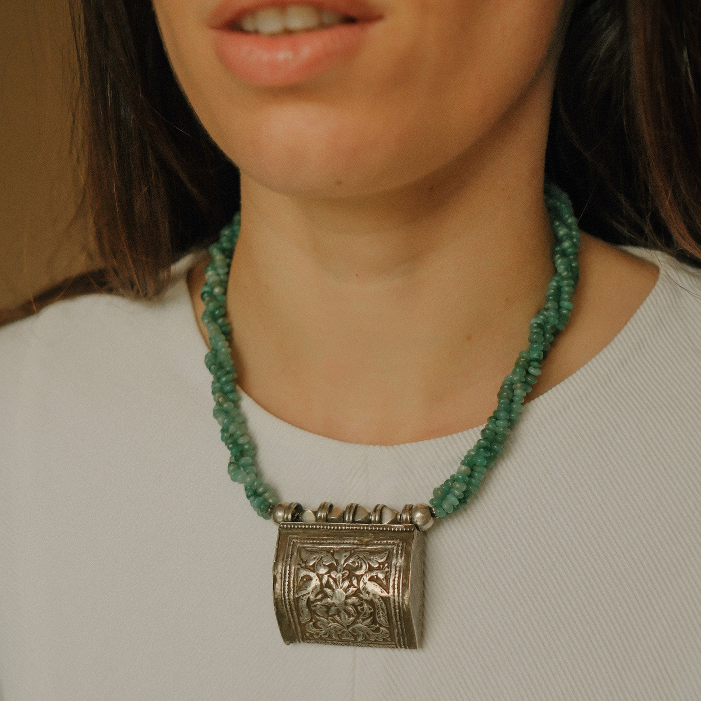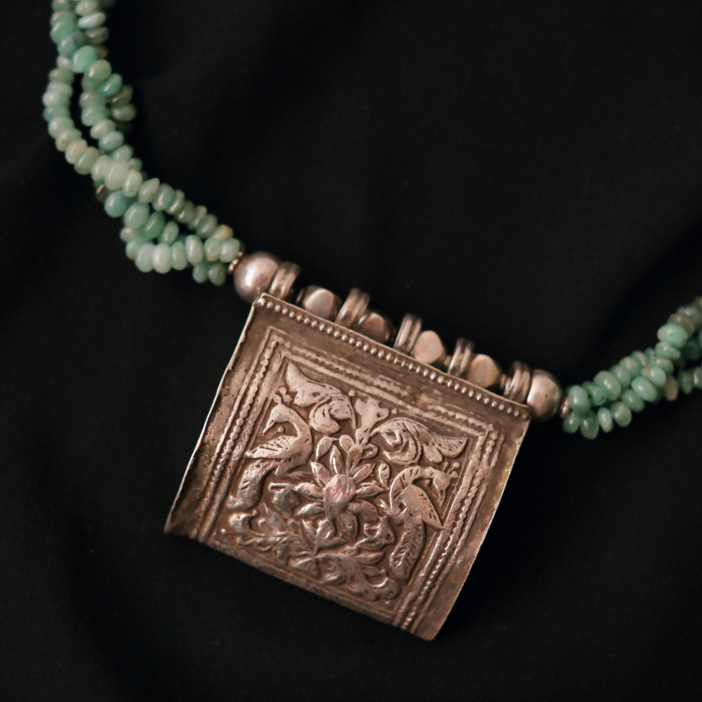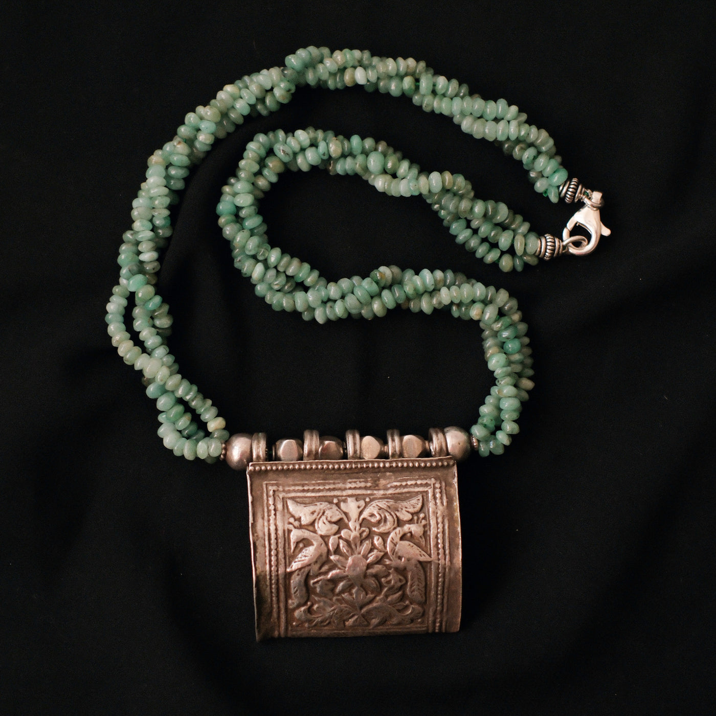Collar con antiguo colgante de plata representando dos pavos reales ( mayura en sanscrito ) ave que en la mitología hindú esta asociada con Lakshmi , la diosa de la prosperidad, belleza y compasión. Combinado en esta pieza única de Lula Máiz con 3 vueltas de esmeraldas y cuentas de plata. El cierre es contemporáneo, con mosquetón de plata.