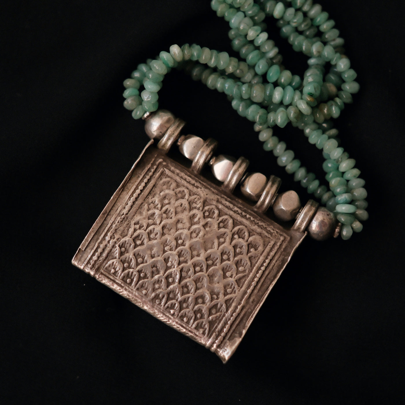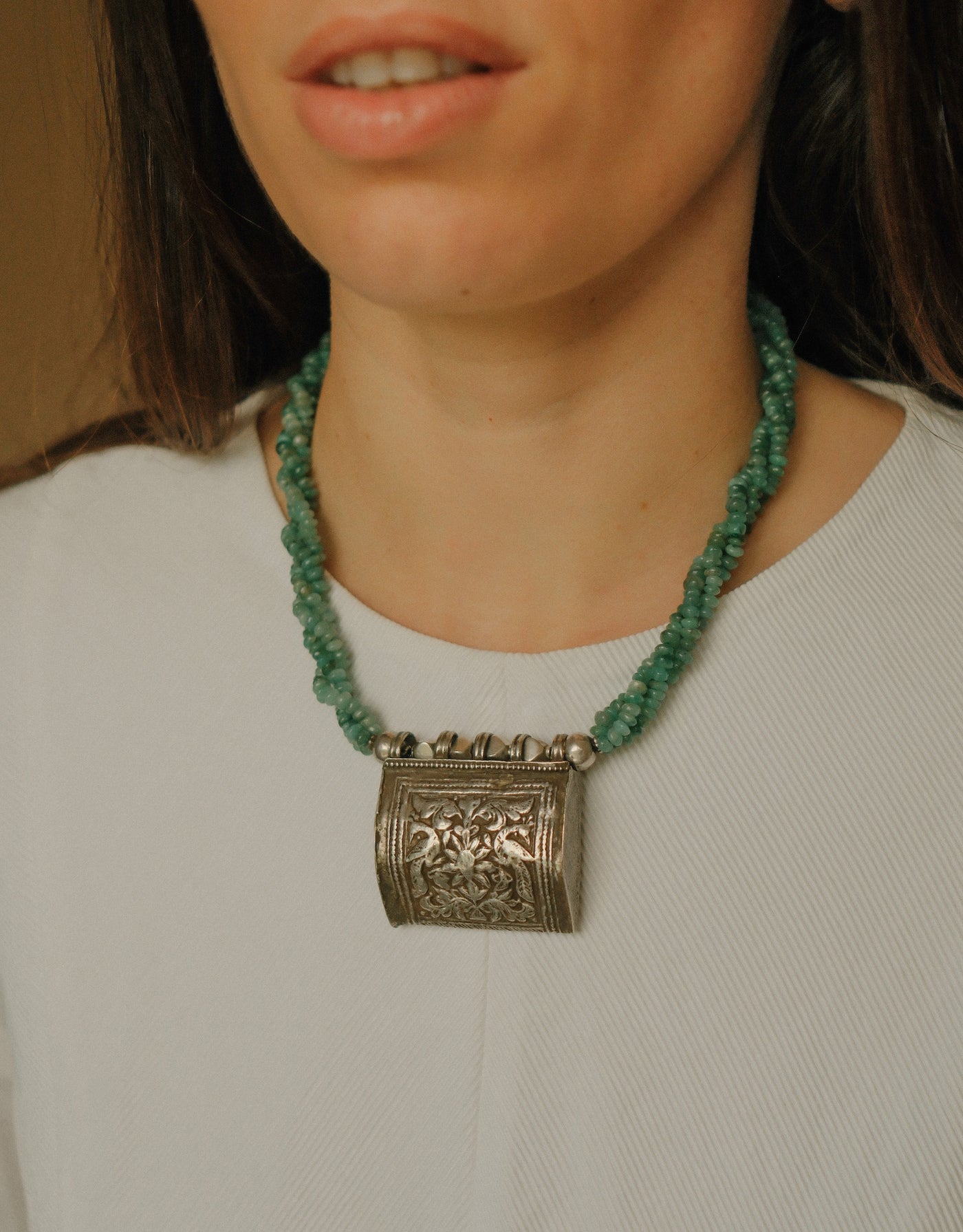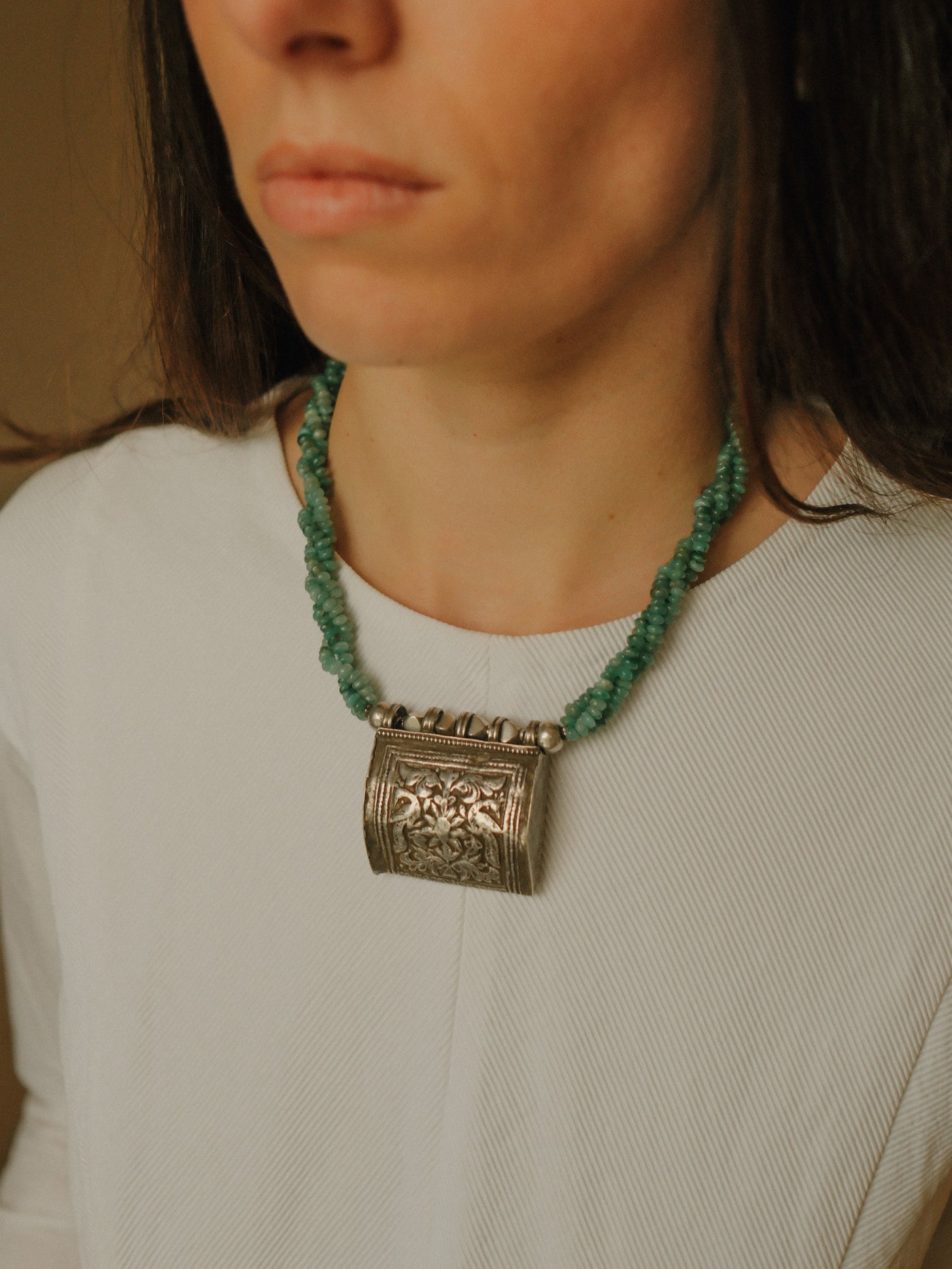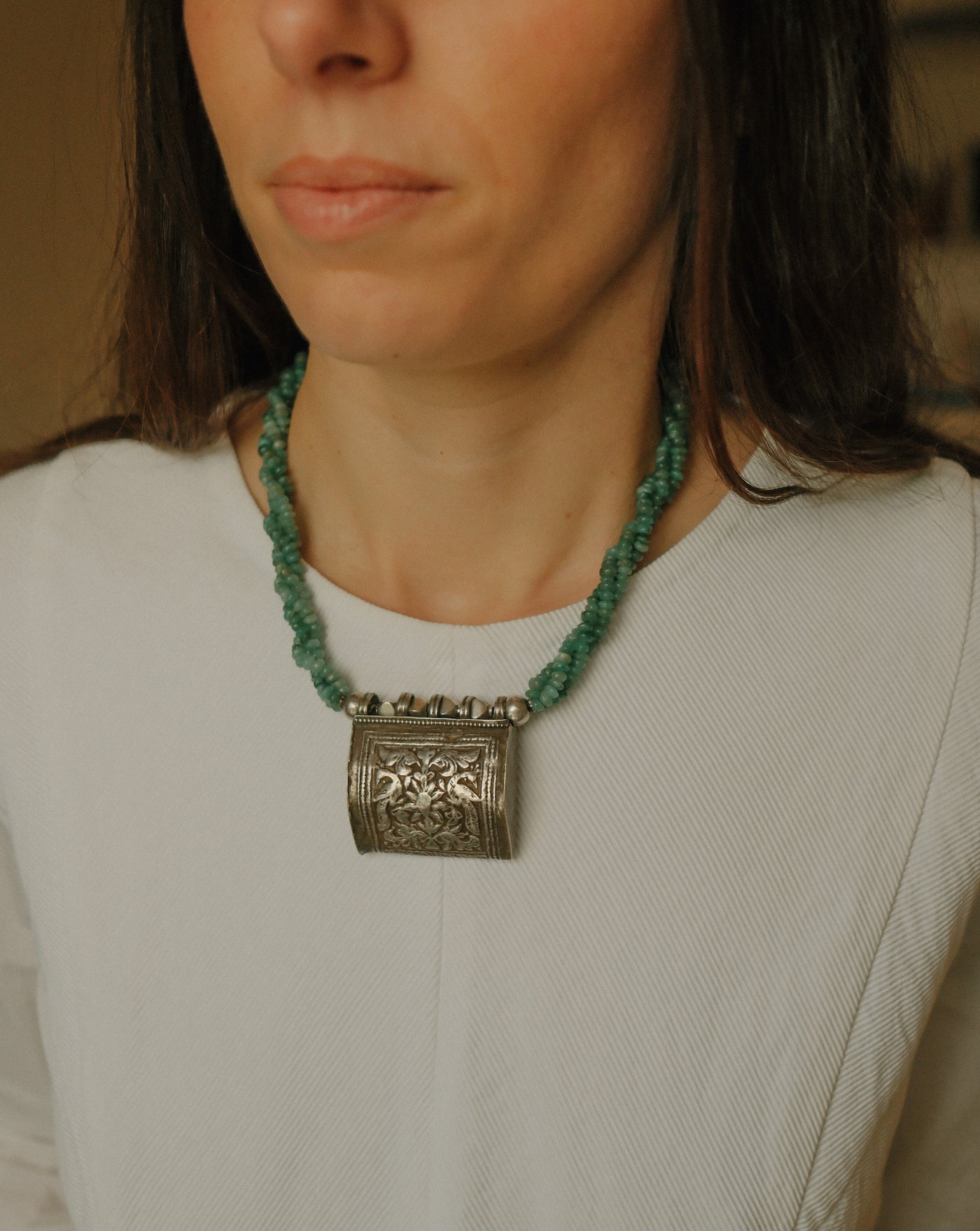 Collar con antiguo colgante de plata representando dos pavos reales ( mayura en sanscrito ) ave que en la mitología hindú esta asociada con Lakshmi , la diosa de la prosperidad, belleza y compasión. Combinado en esta pieza única de Lula Máiz con 3 vueltas de esmeraldas y cuentas de plata. El cierre es contemporáneo, con mosquetón de plata.