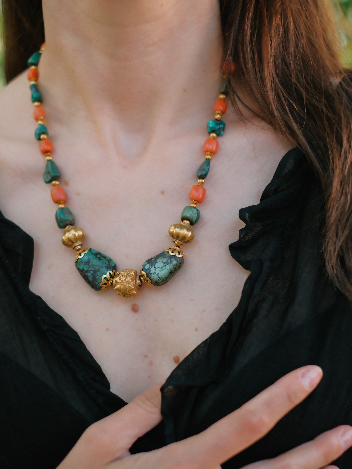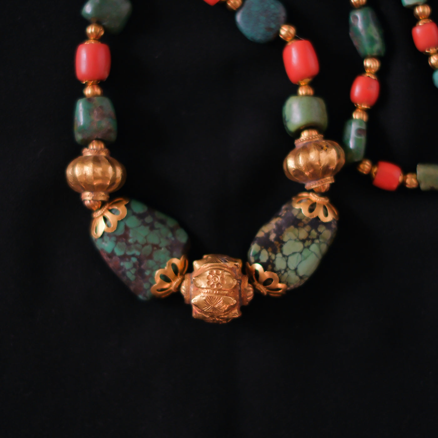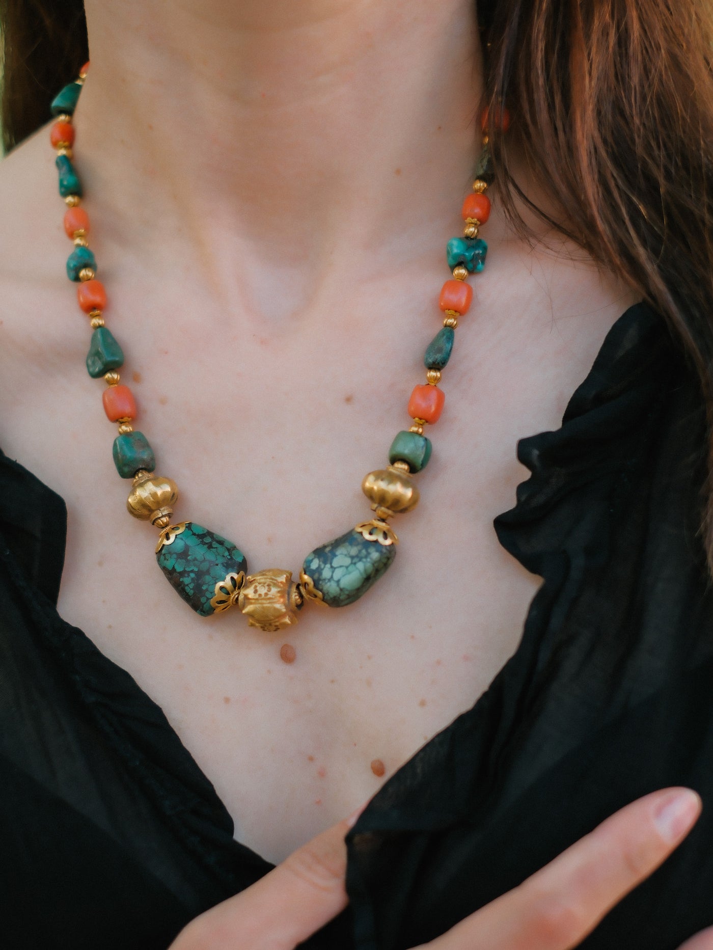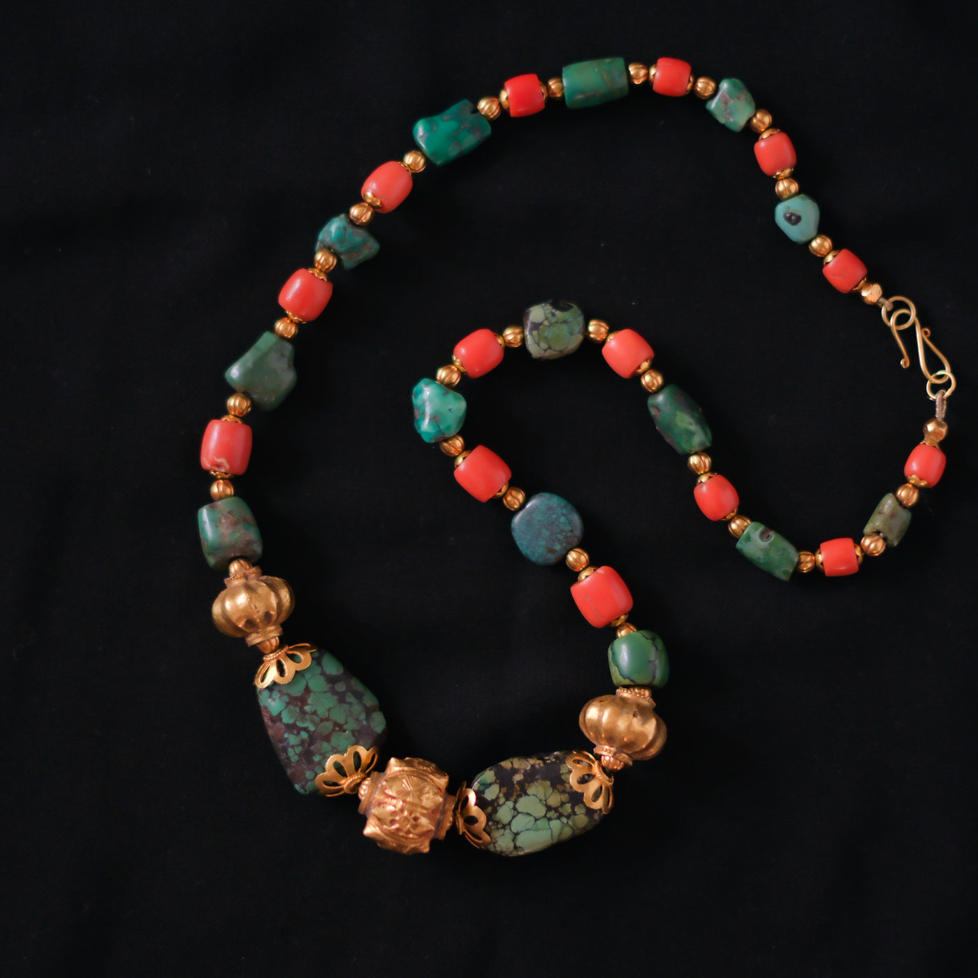 Collar con turquesas tibetanas, corales y cuentas de oro de India. El cierre es tambien de oro.