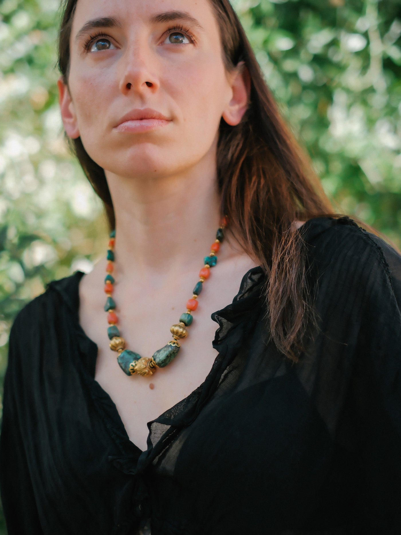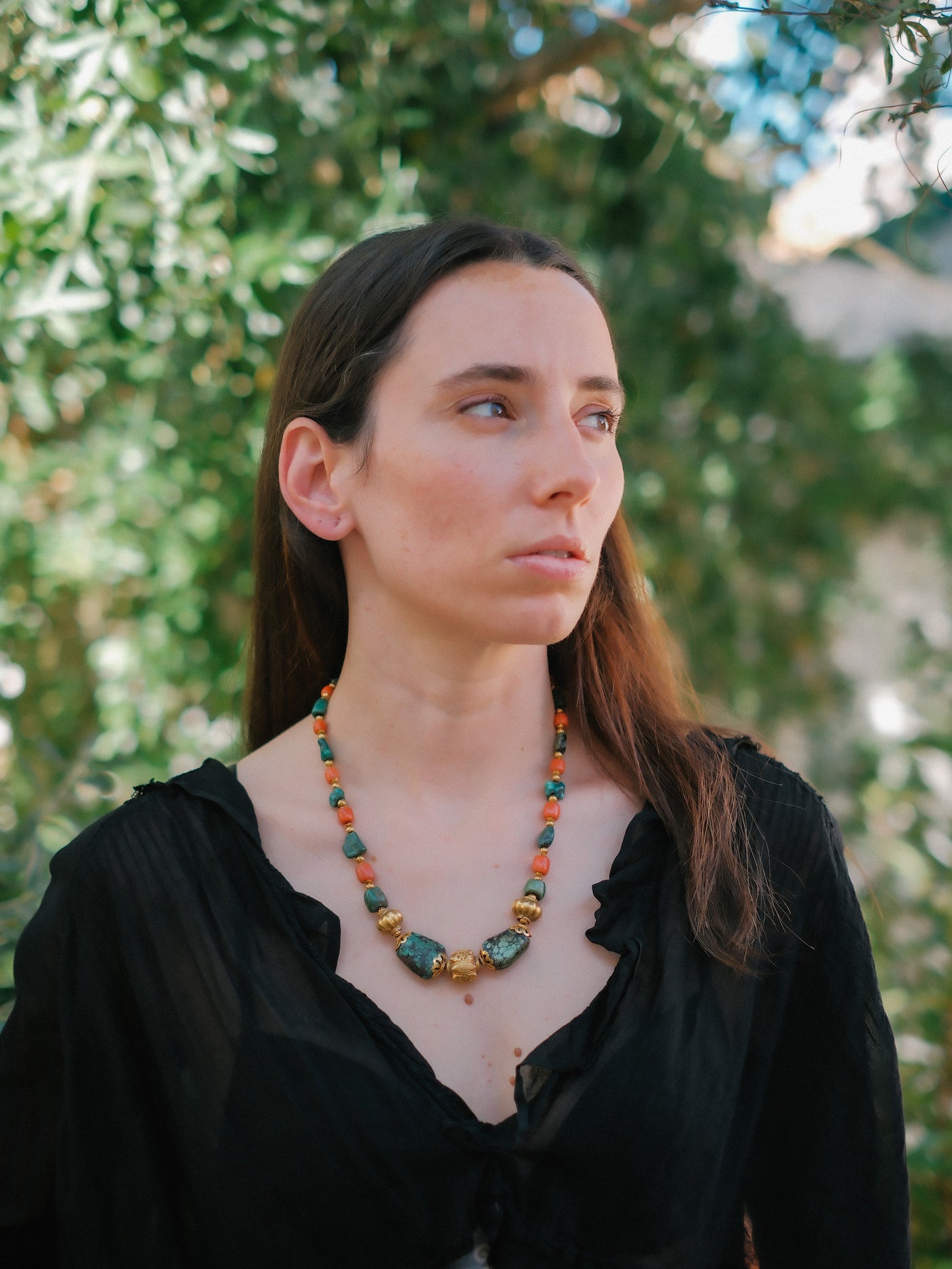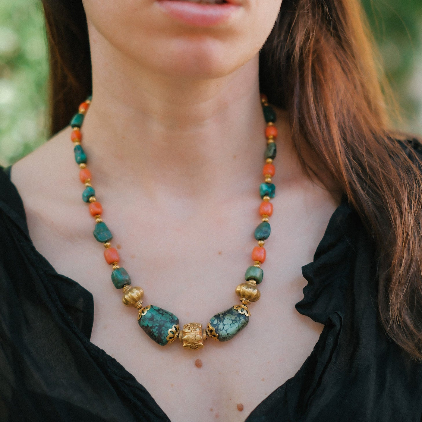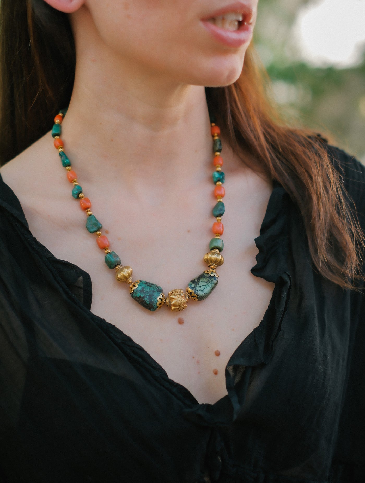 Collar con turquesas tibetanas, corales y cuentas de oro de India. El cierre es tambien de oro.