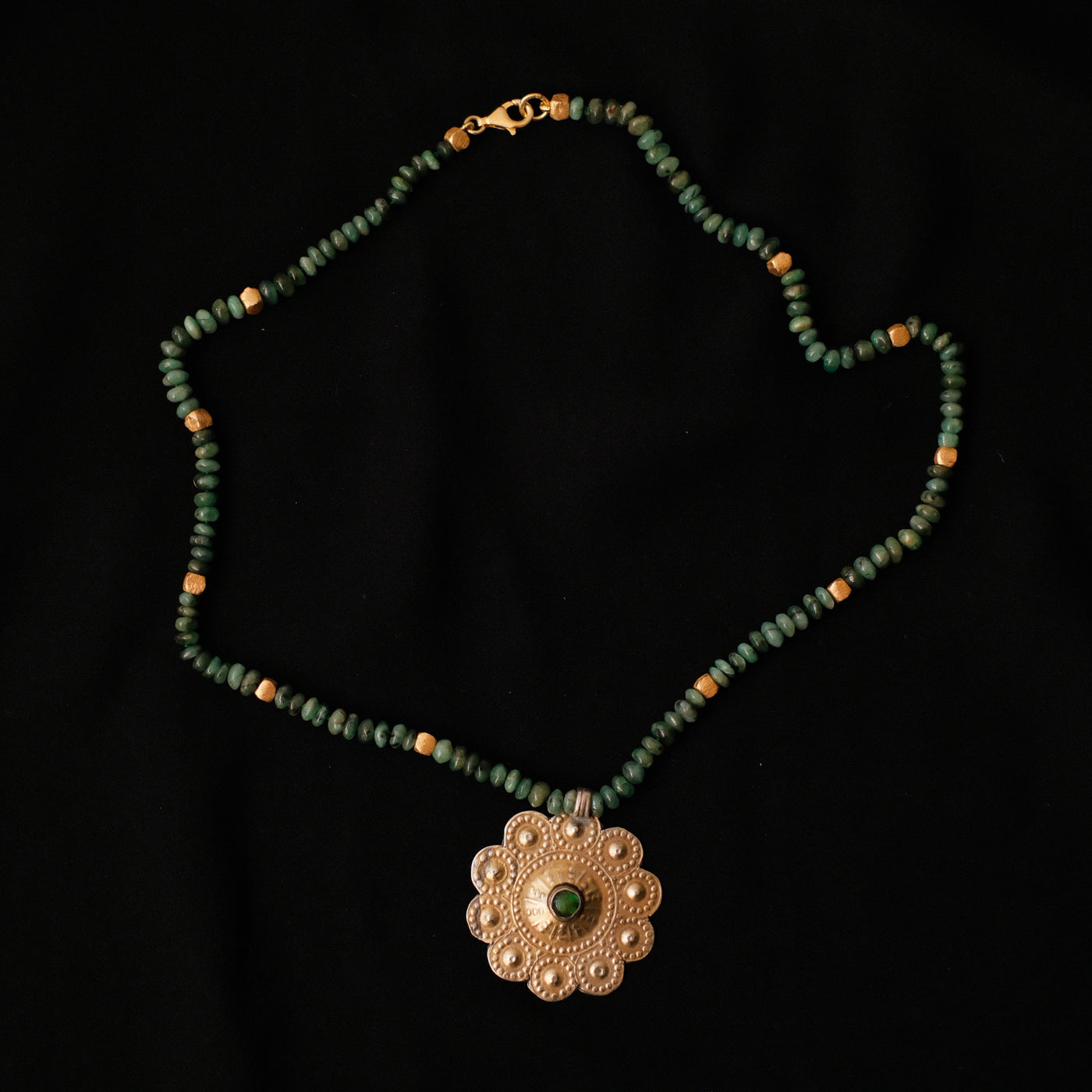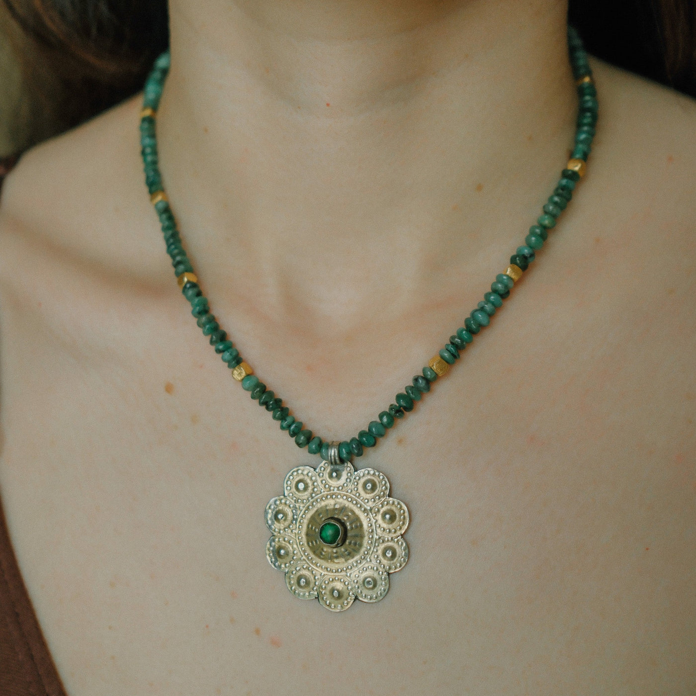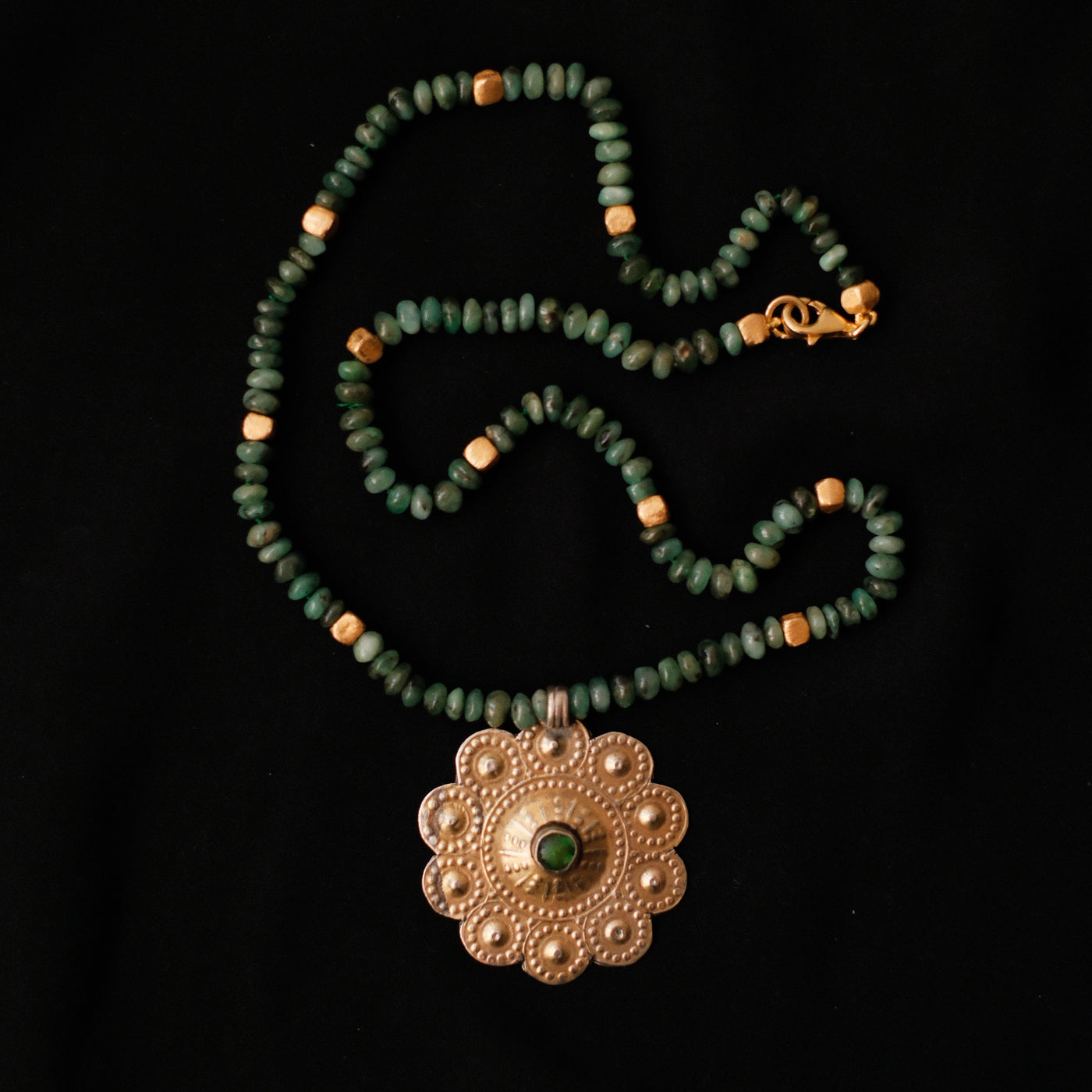 Collar diseñado por Lula Máiz con esmeraldas, , cuentas de plata con baño de oro mateado y colgante antiguo de plata chapad en oro de los Yomut, grupo étnico de Turkmenistán. El cierre de mosquetón es de plata dorada. Pieza única.