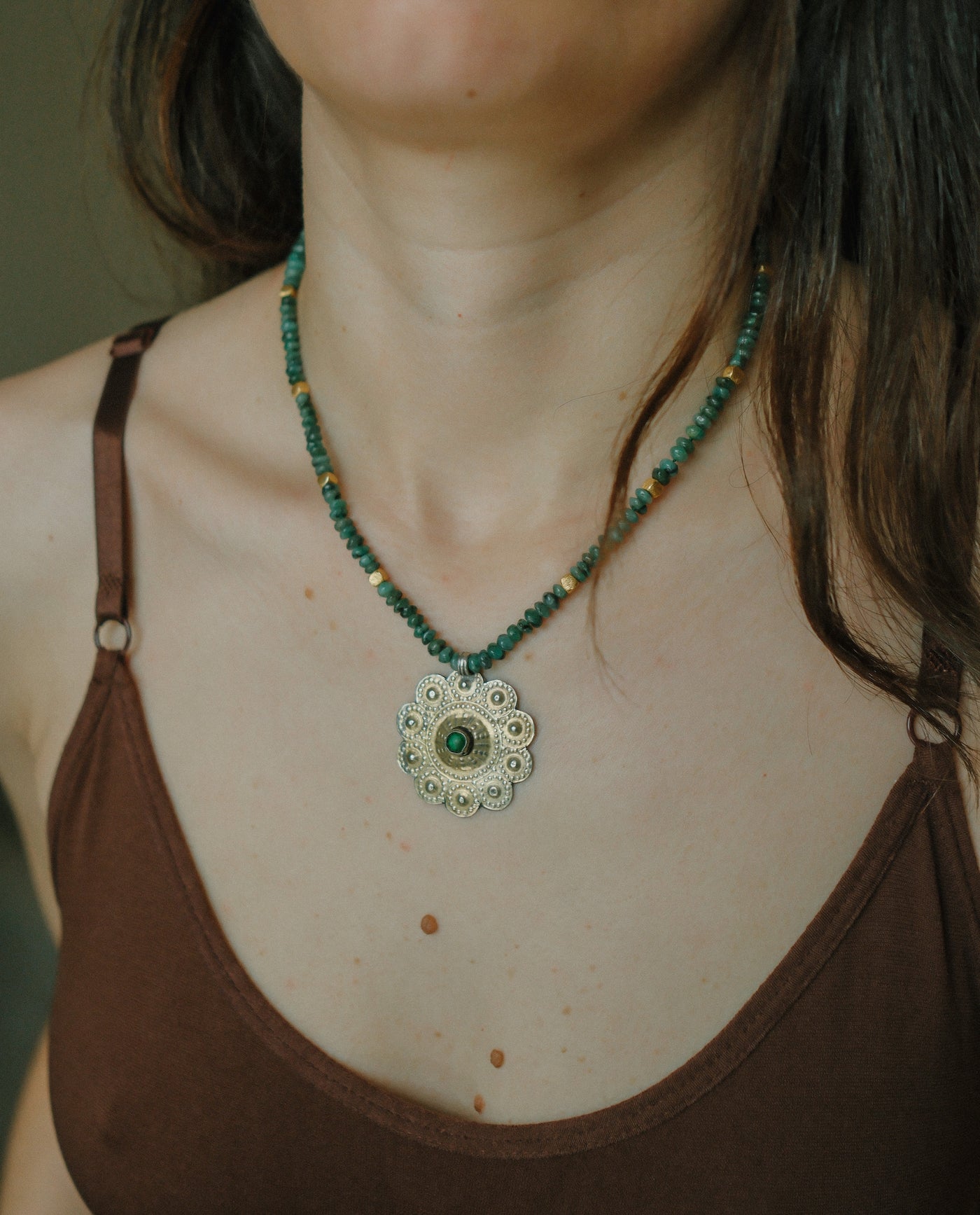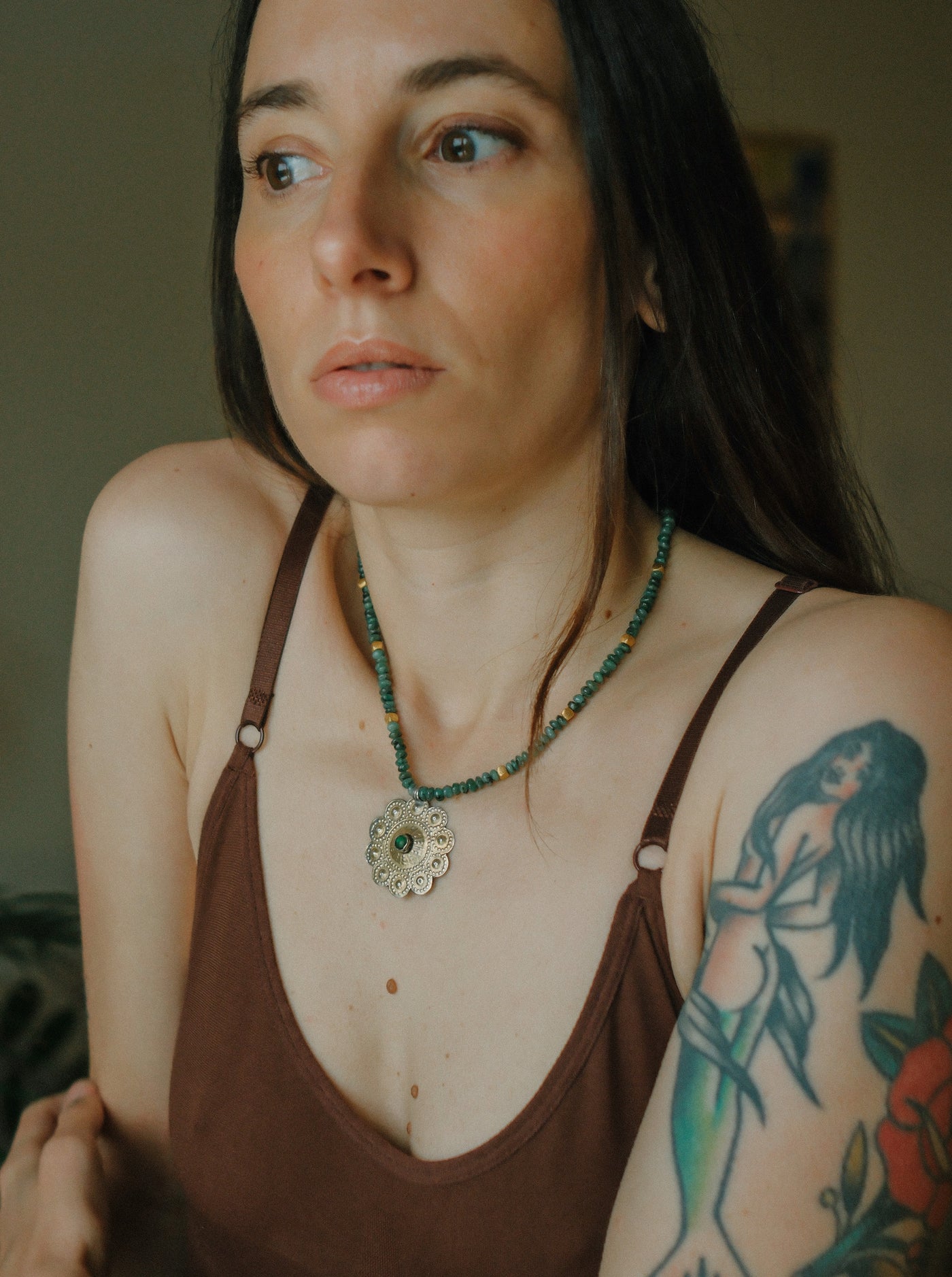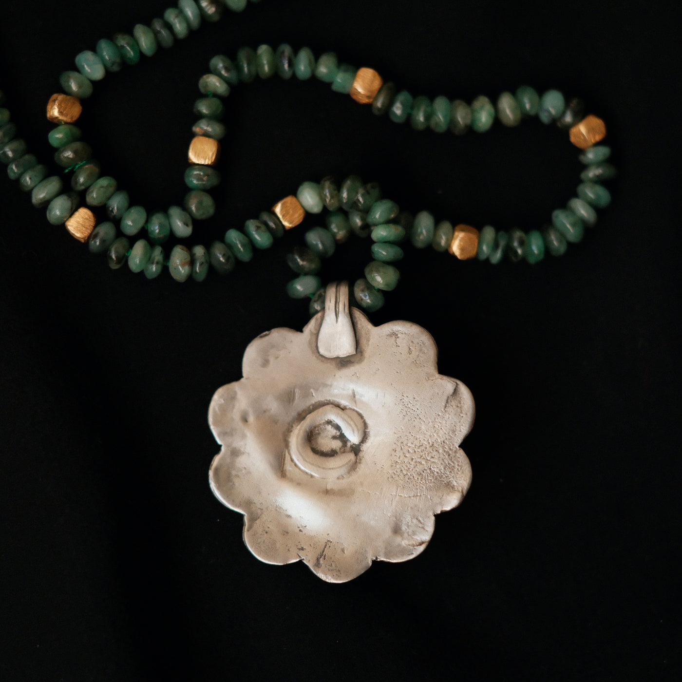 Collar diseñado por Lula Máiz con esmeraldas, , cuentas de plata con baño de oro mateado y colgante antiguo de plata chapad en oro de los Yomut, grupo étnico de Turkmenistán. El cierre de mosquetón es de plata dorada. Pieza única.