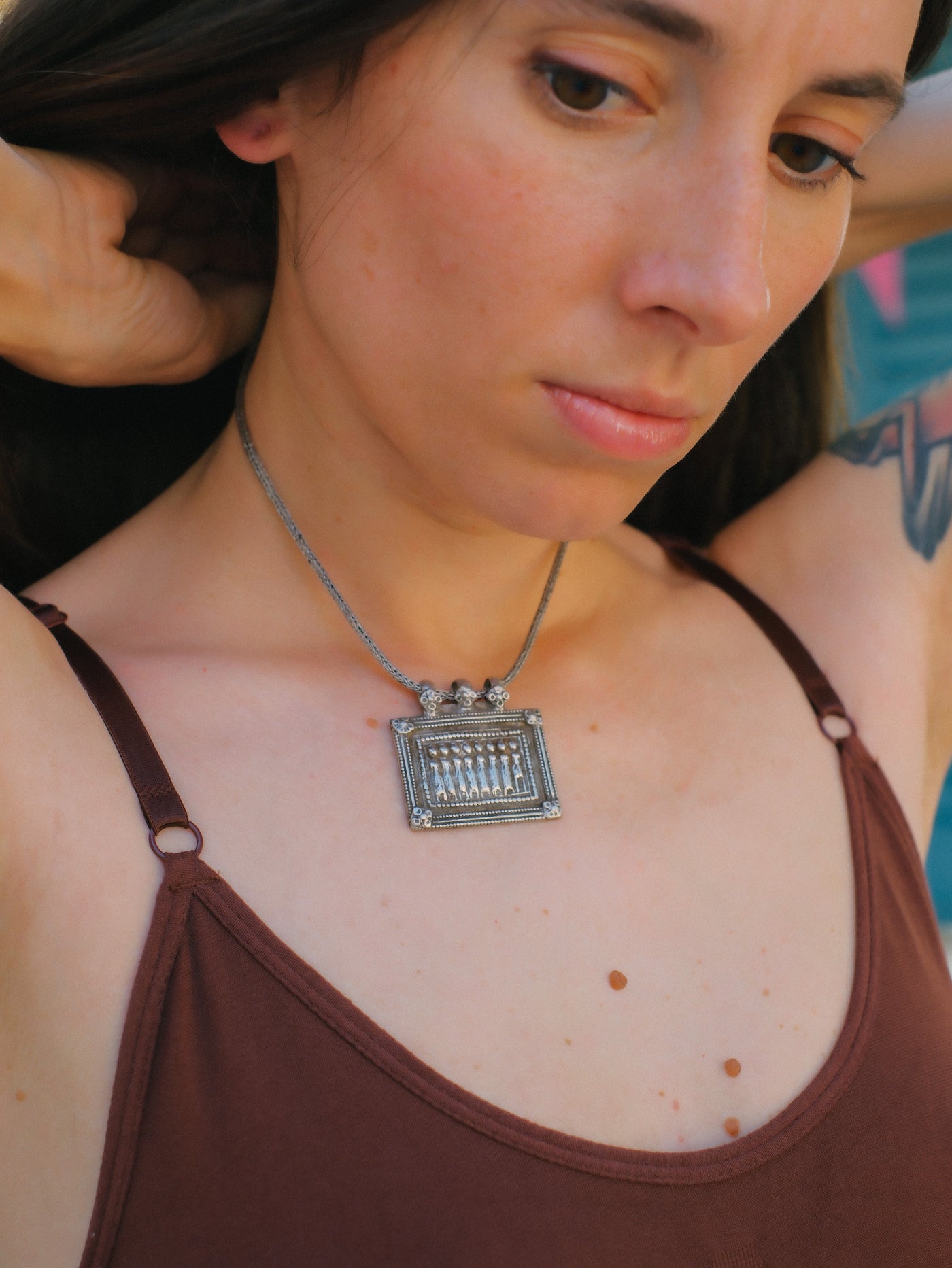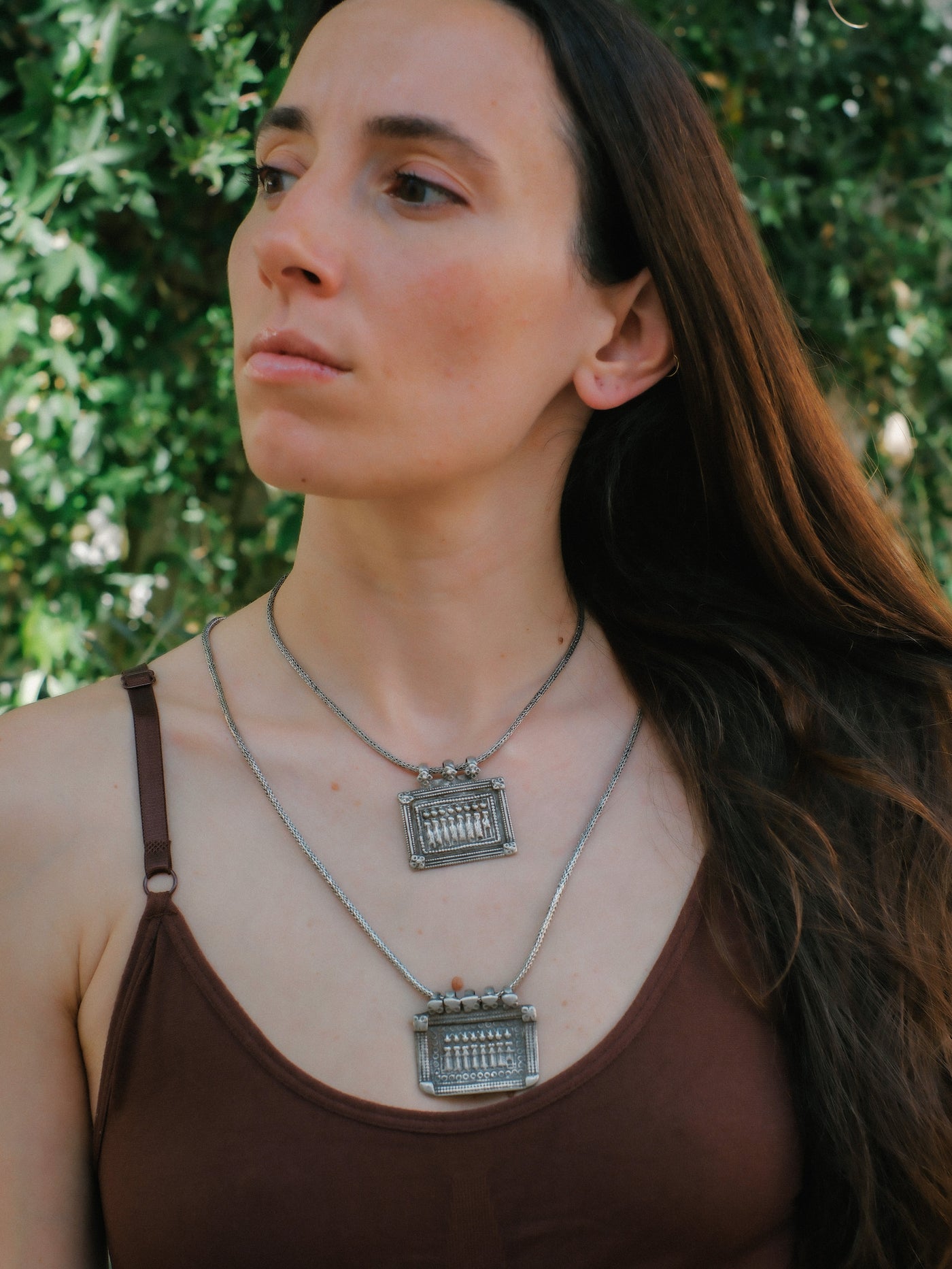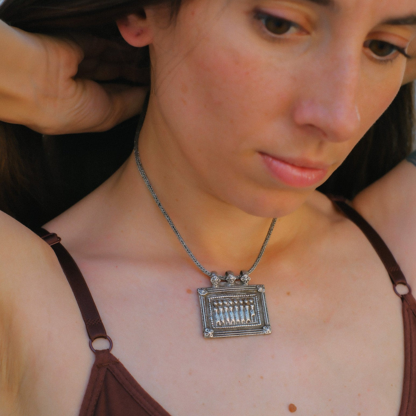 Amuleto artesanal antiguo de India, hecho a mano con plata y que representas a las diosas conocidas como la 7 hermanas, que son una manifestación de la Madre Tierra. La cadena es contemporánea hecha a mano con plata de ley.