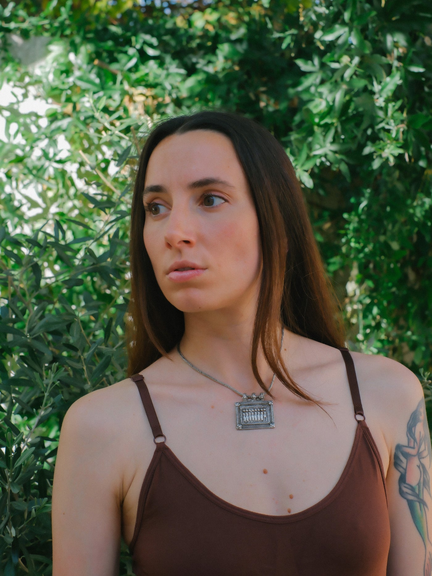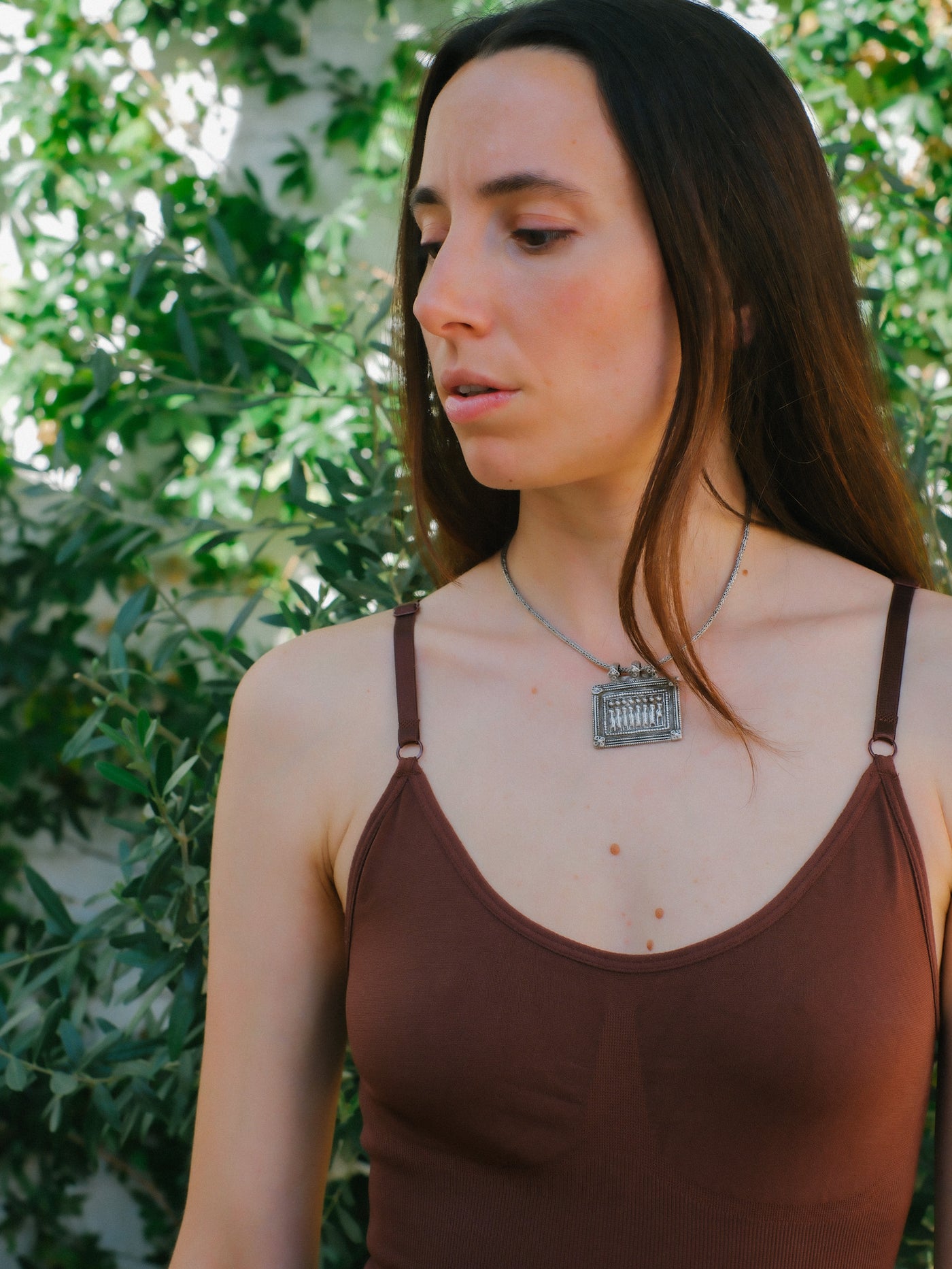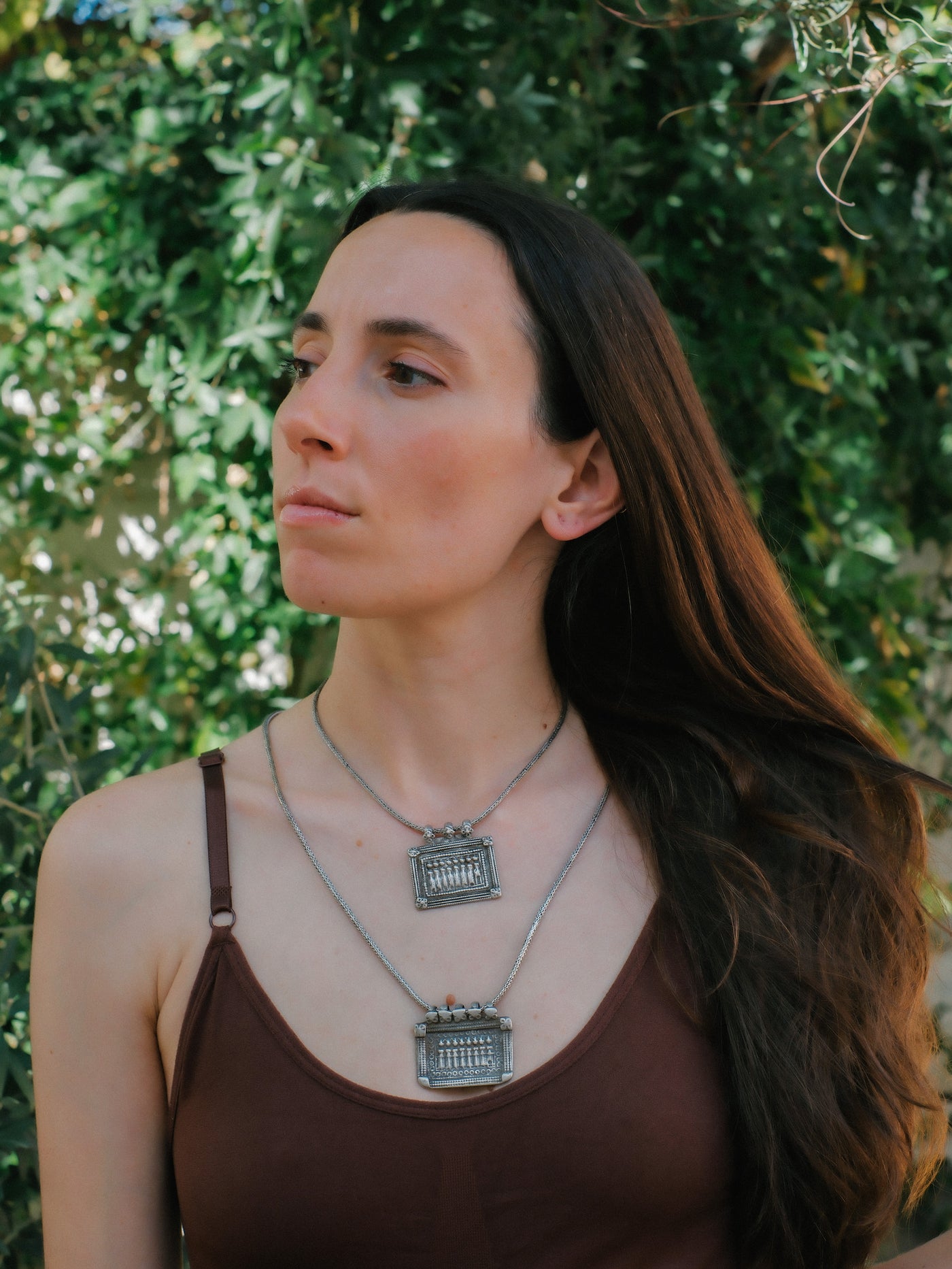 Amuleto artesanal antiguo de India, hecho a mano con plata y que representas a las diosas conocidas como la 7 hermanas, que son una manifestación de la Madre Tierra. La cadena es contemporánea hecha a mano con plata de ley.