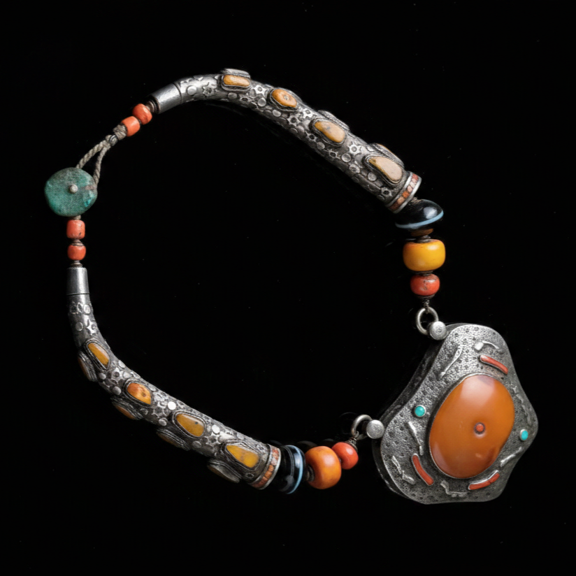 Collar tibetano con un colgante de plata de un exquisito trabajo orfebre y gran pieza de ámbar, engarzado con ágatas, cuentas de ámbar y coral, gemas favoritas de la joyería tradicional tibetana y cierre de turquesa. El colgante y las dos piezas laterales están hechos a mano con plata y ámbar.