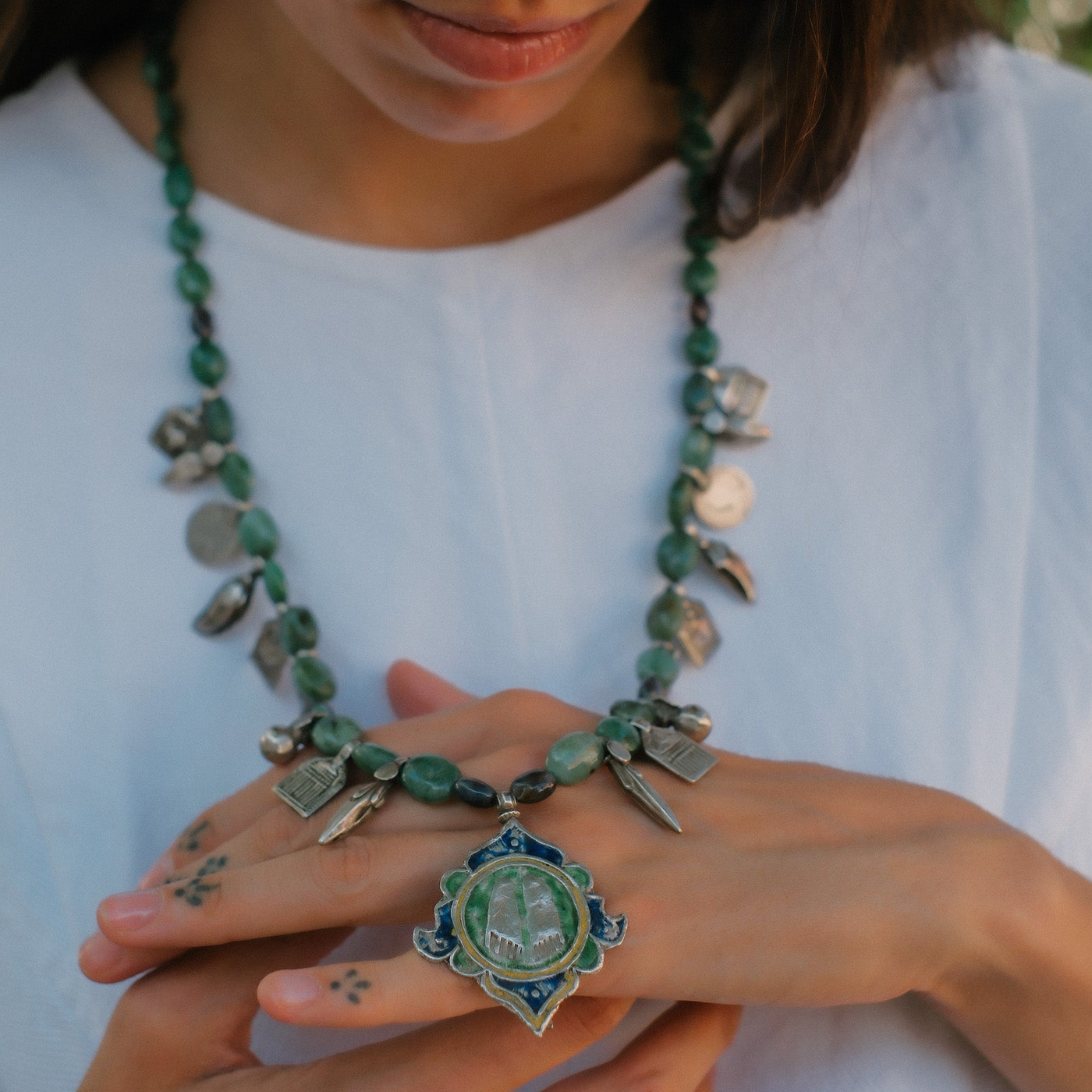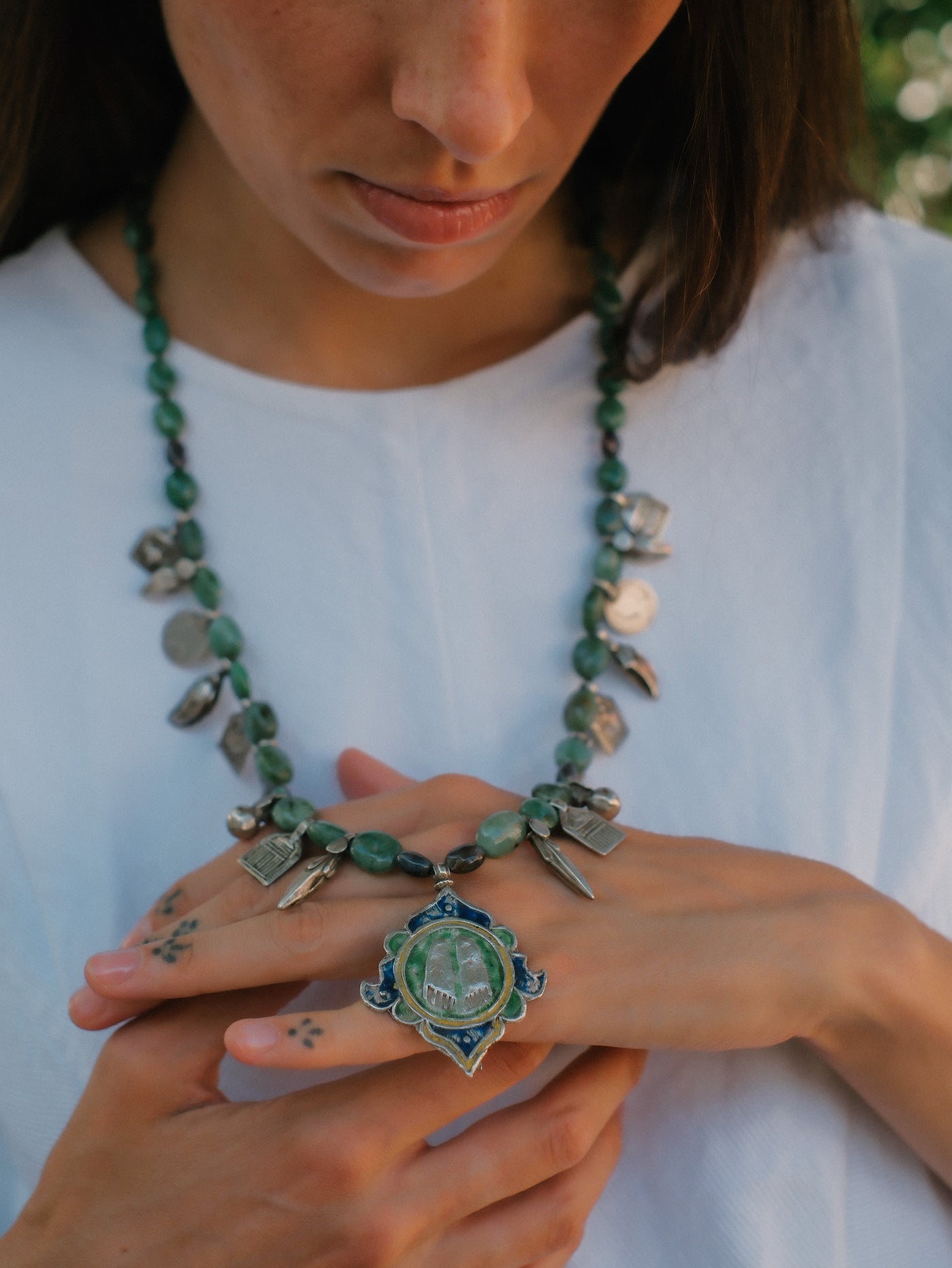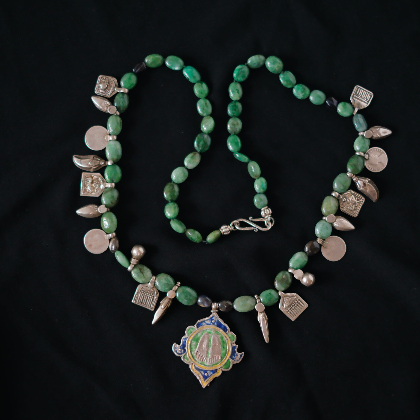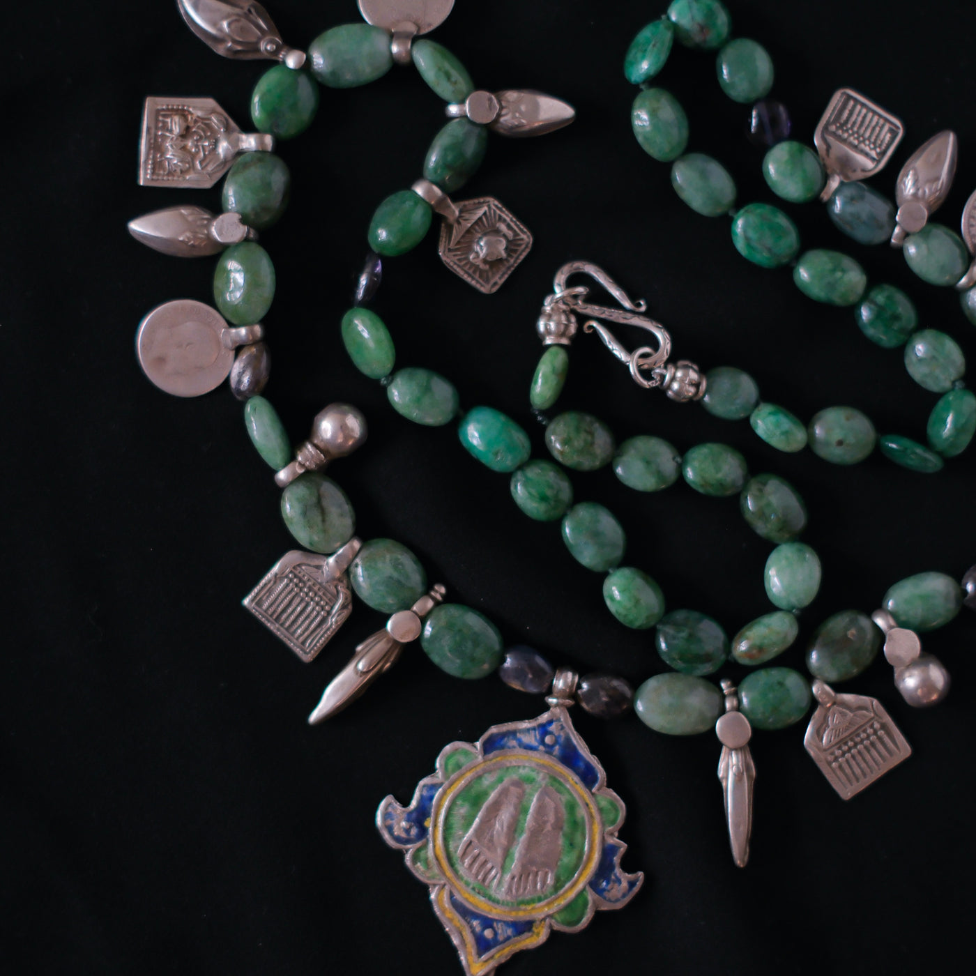 Collar con esmeraldas y antiguo amuleto de plata y esmalte caracteristico de Himachal Pradesh, estado indio situado en las faldas de los Himalayas, representando los pies de Vishnu . Combinado en esta pieza unica de Lula Maiz con antiguos amuletos y monedas de plata de India.