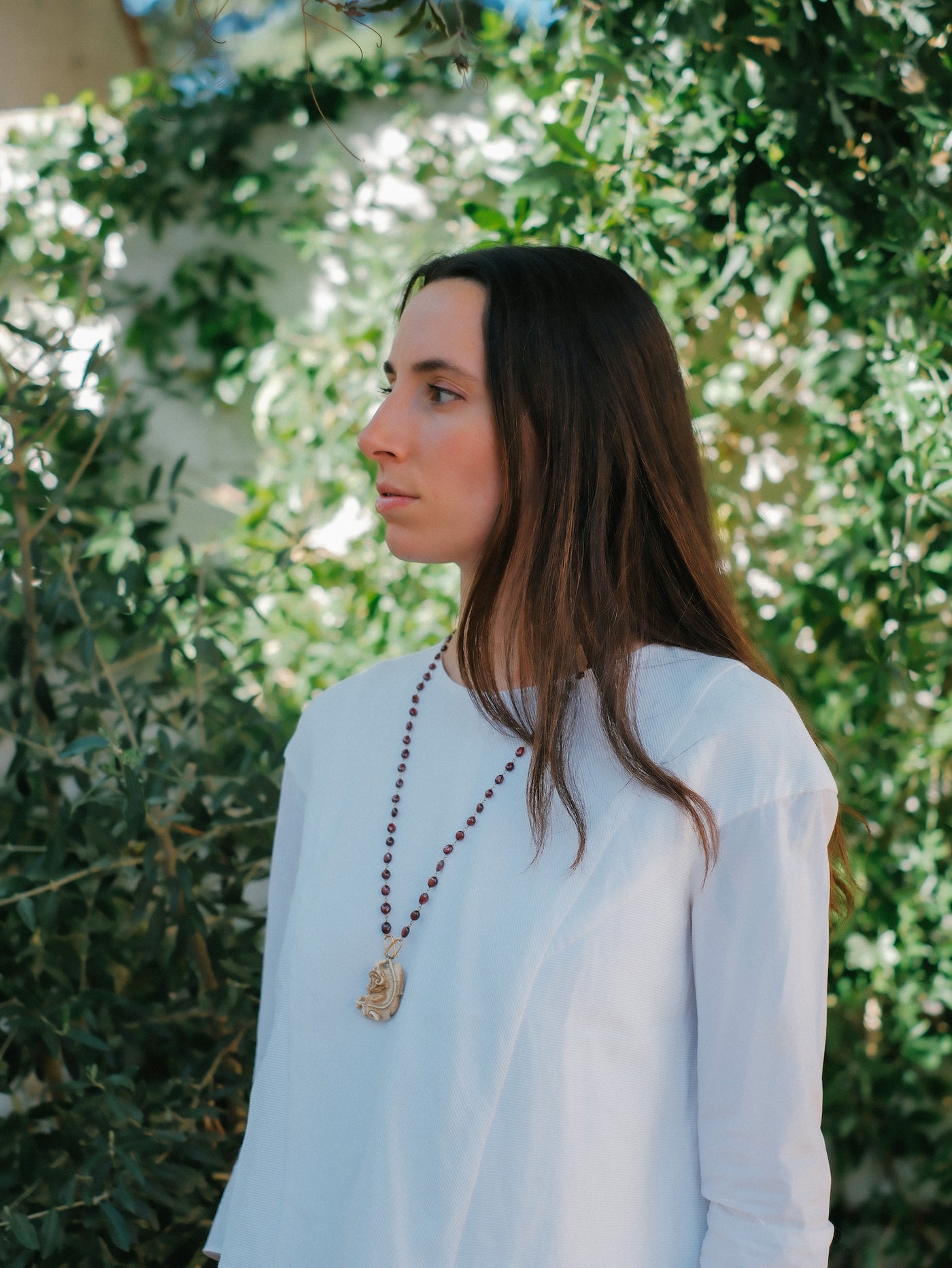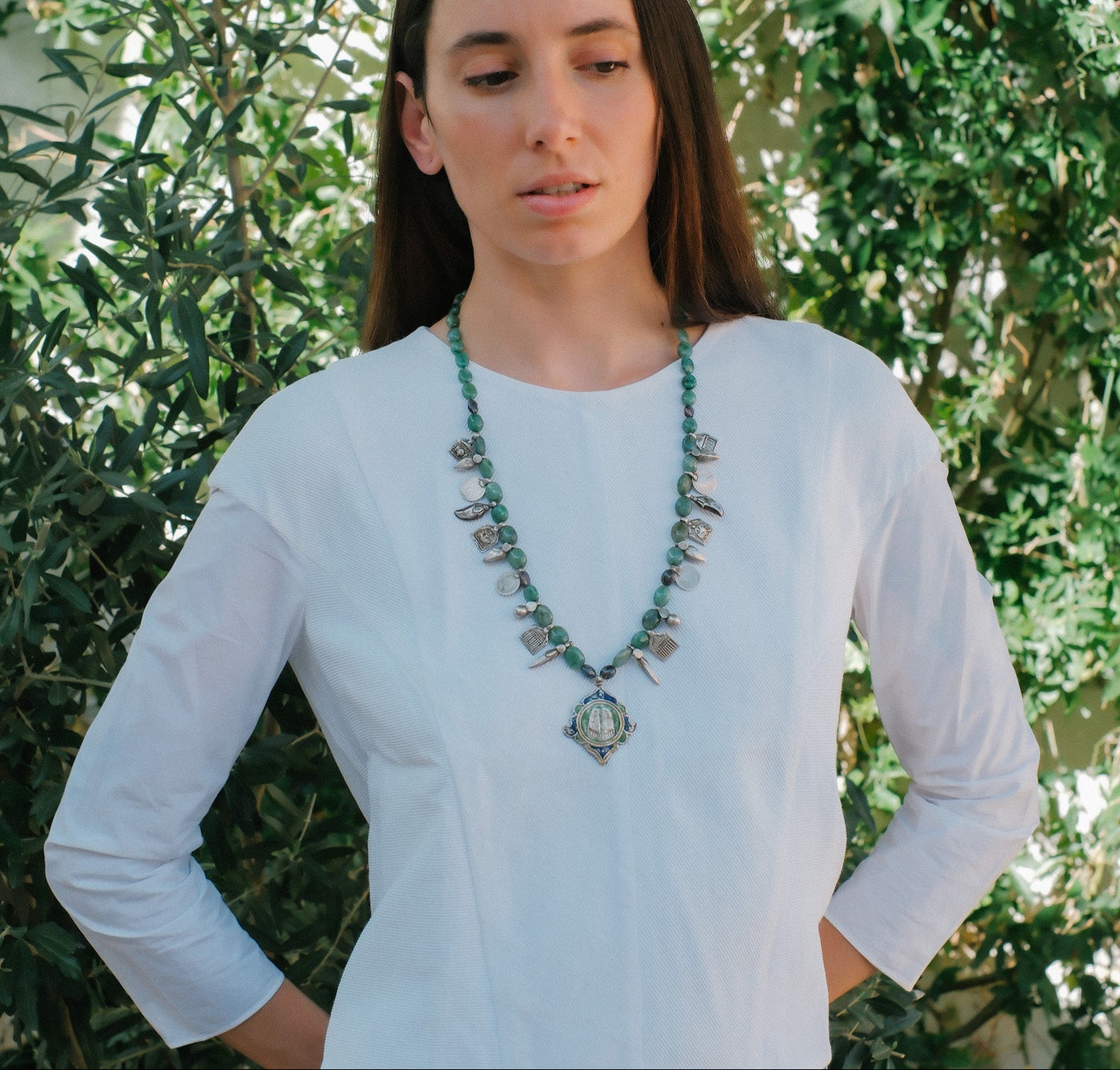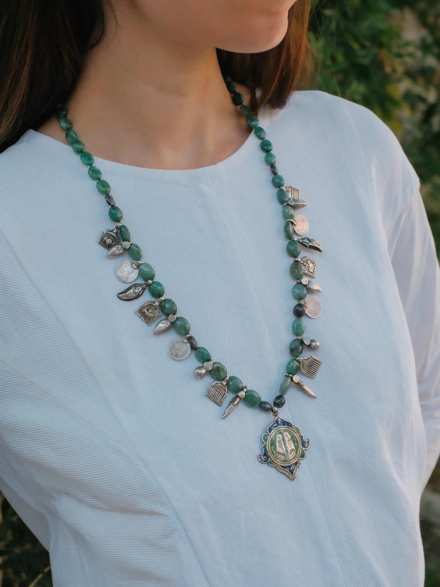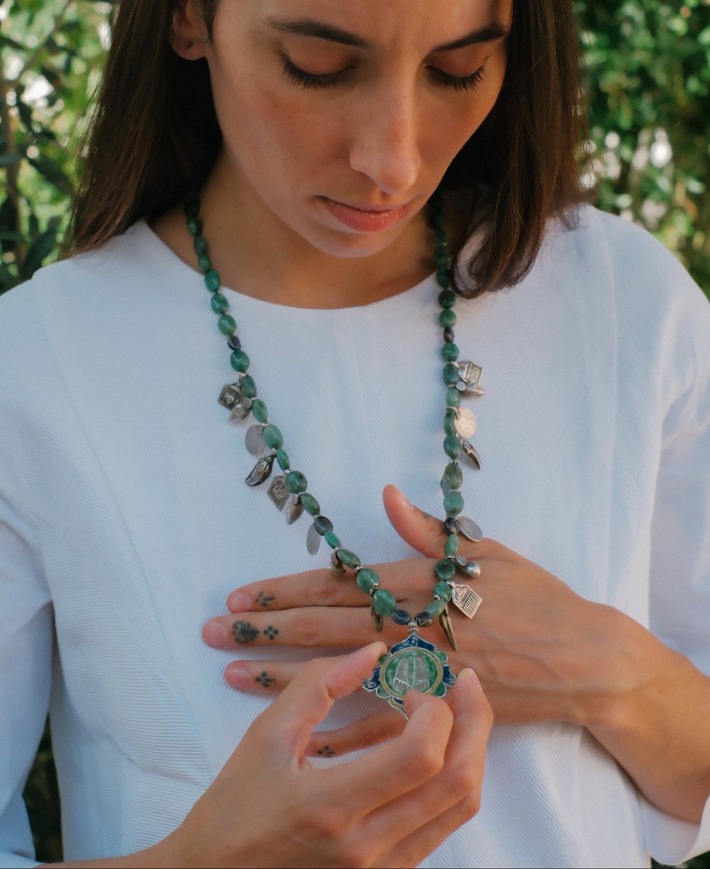 Collar con esmeraldas y antiguo amuleto de plata y esmalte caracteristico de Himachal Pradesh, estado indio situado en las faldas de los Himalayas, representando los pies de Vishnu . Combinado en esta pieza unica de Lula Maiz con antiguos amuletos y monedas de plata de India.