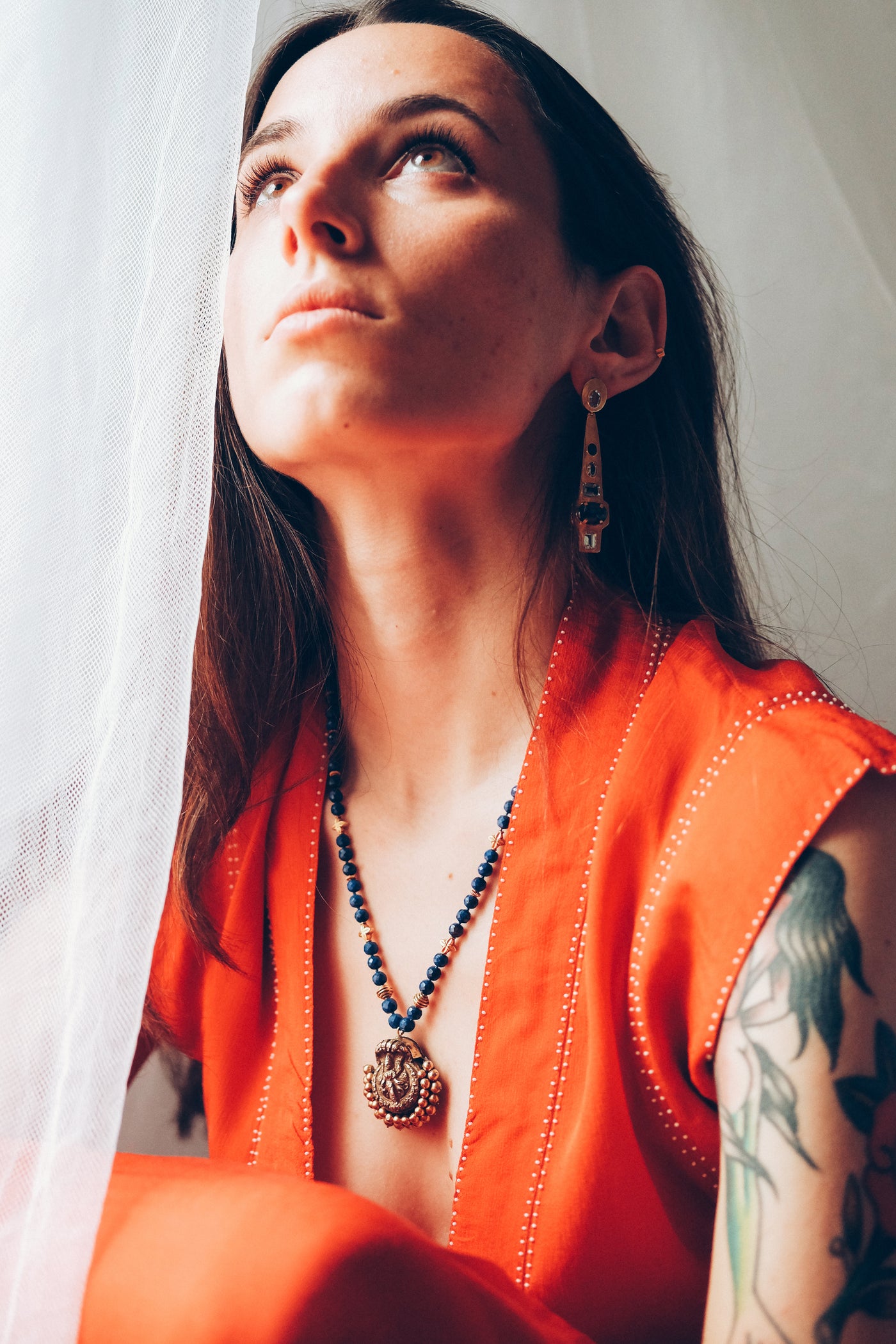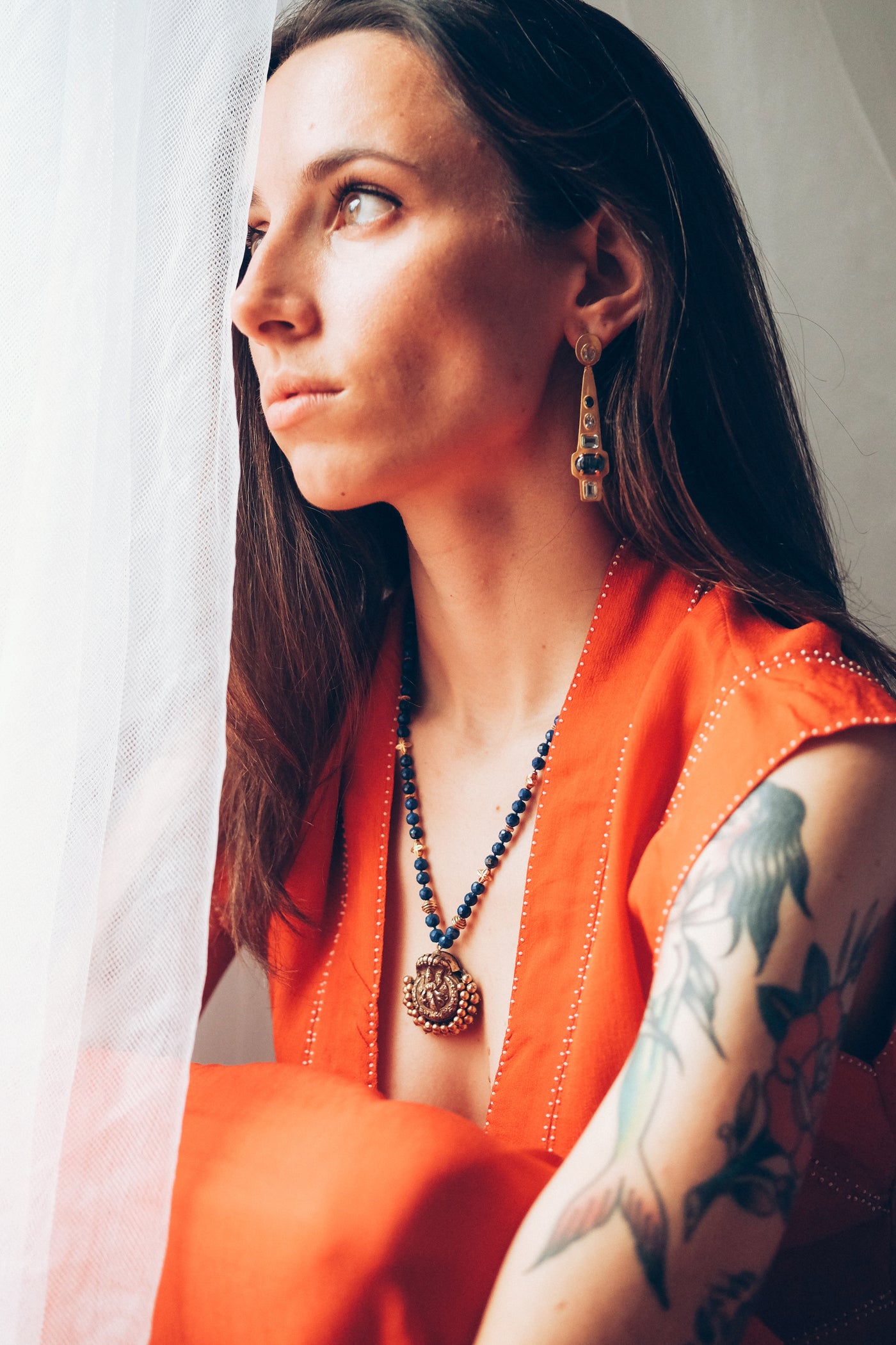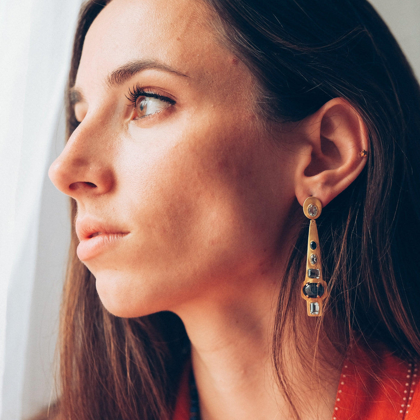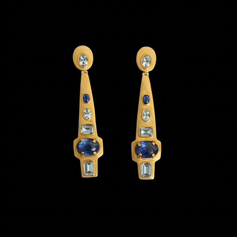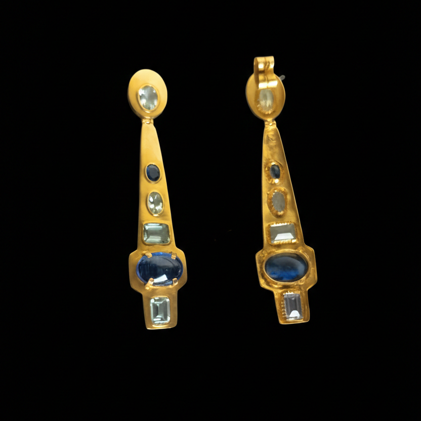 Pendientes artesanales hechos a mano con oro de 16 k con terminado mate , 2 cabujones de zafiros, 2 zafiros facetados y 8 aguamarinas facetadas. El top es de presión con mariposa posterior, también de oro.
