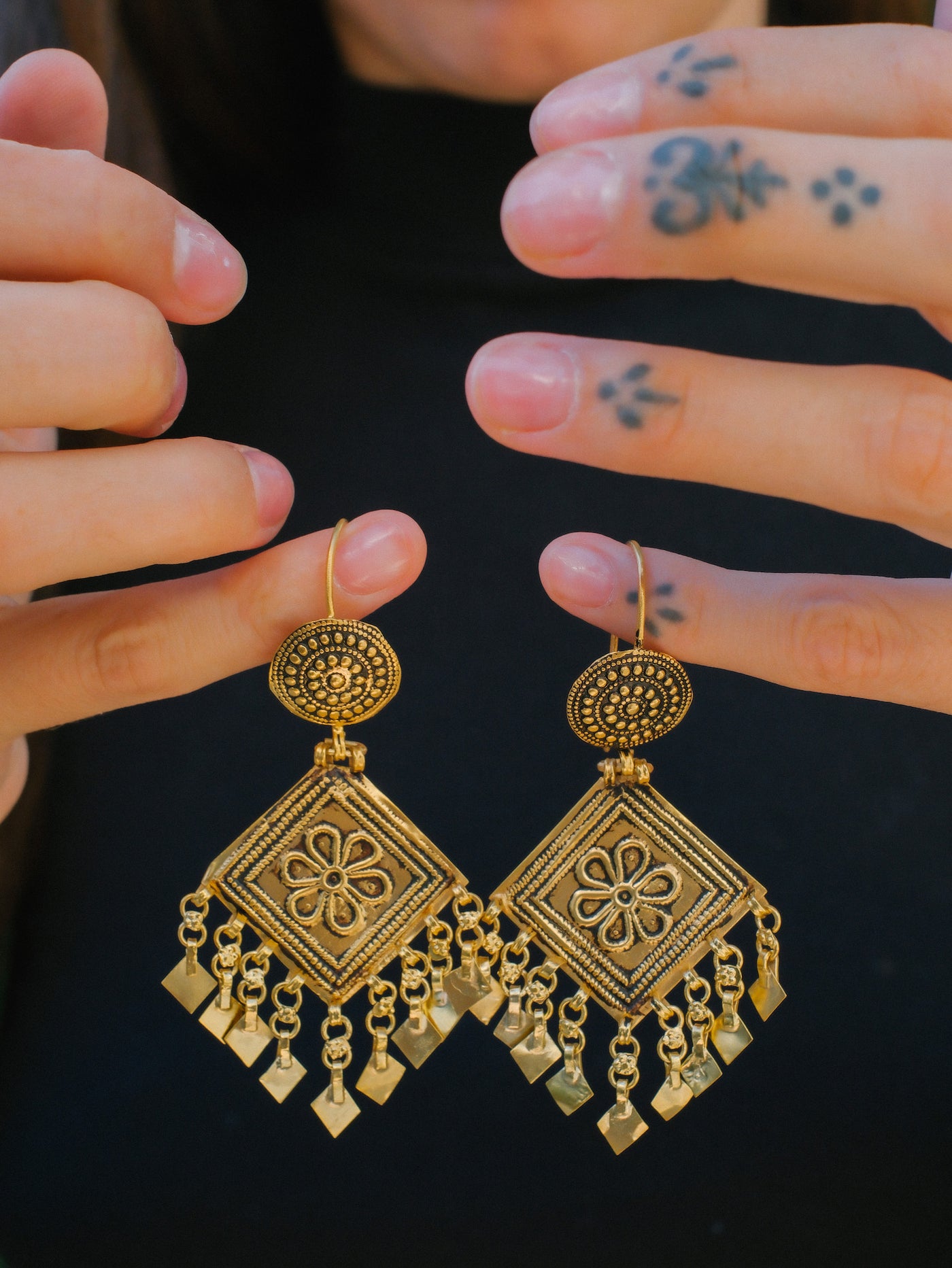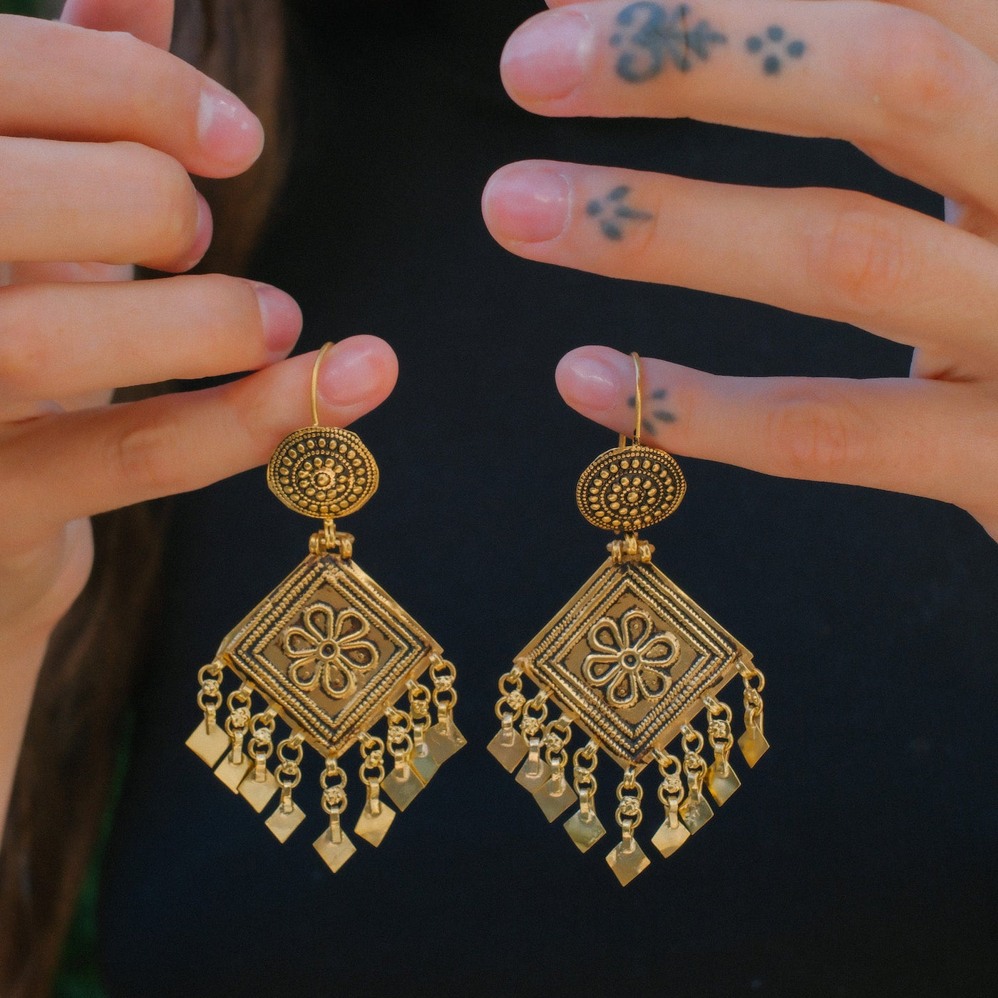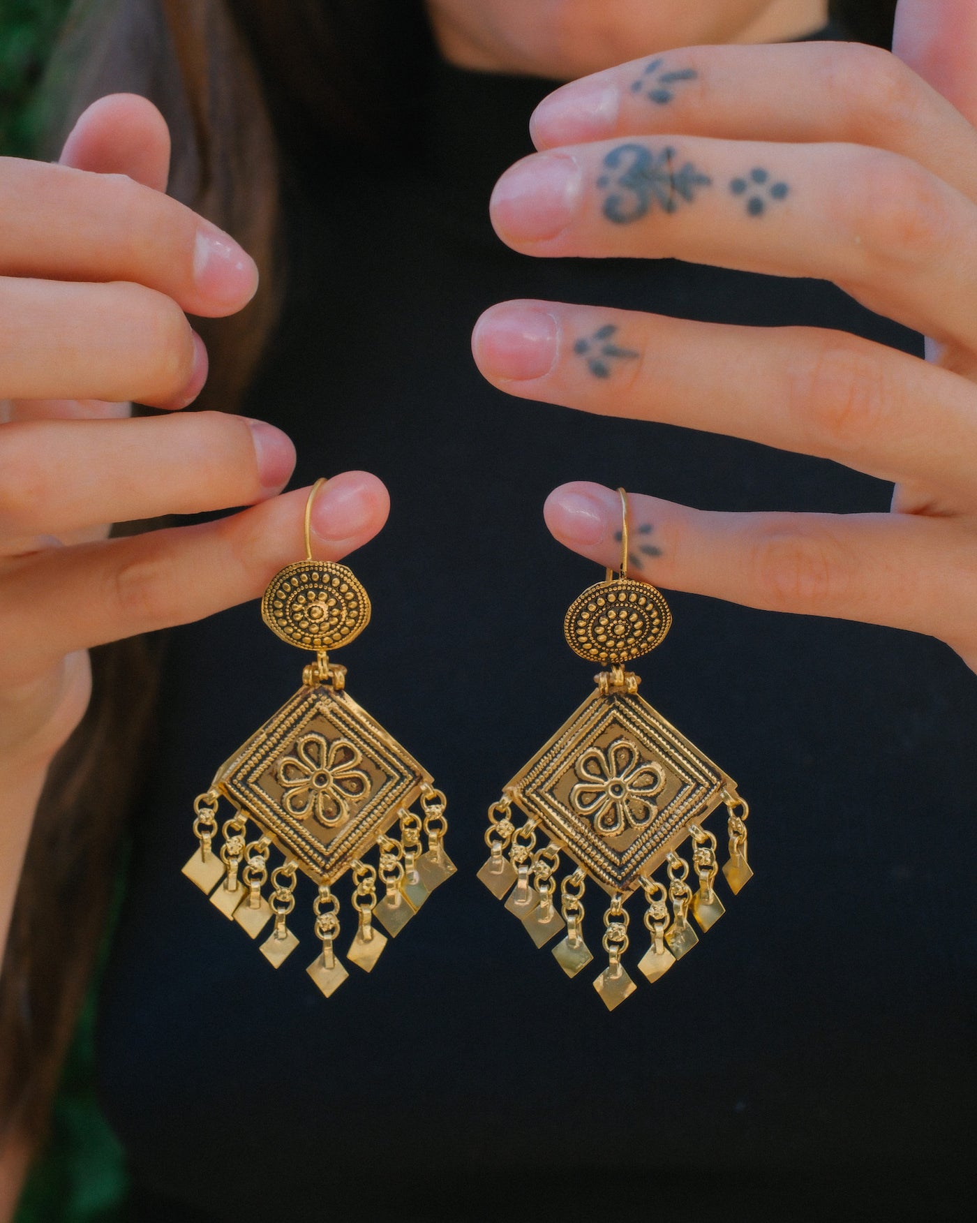 Pendientes artesanales de India , hechos a mano con plata dorada.
