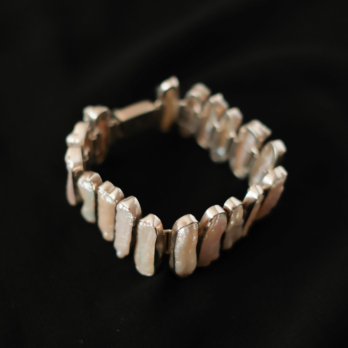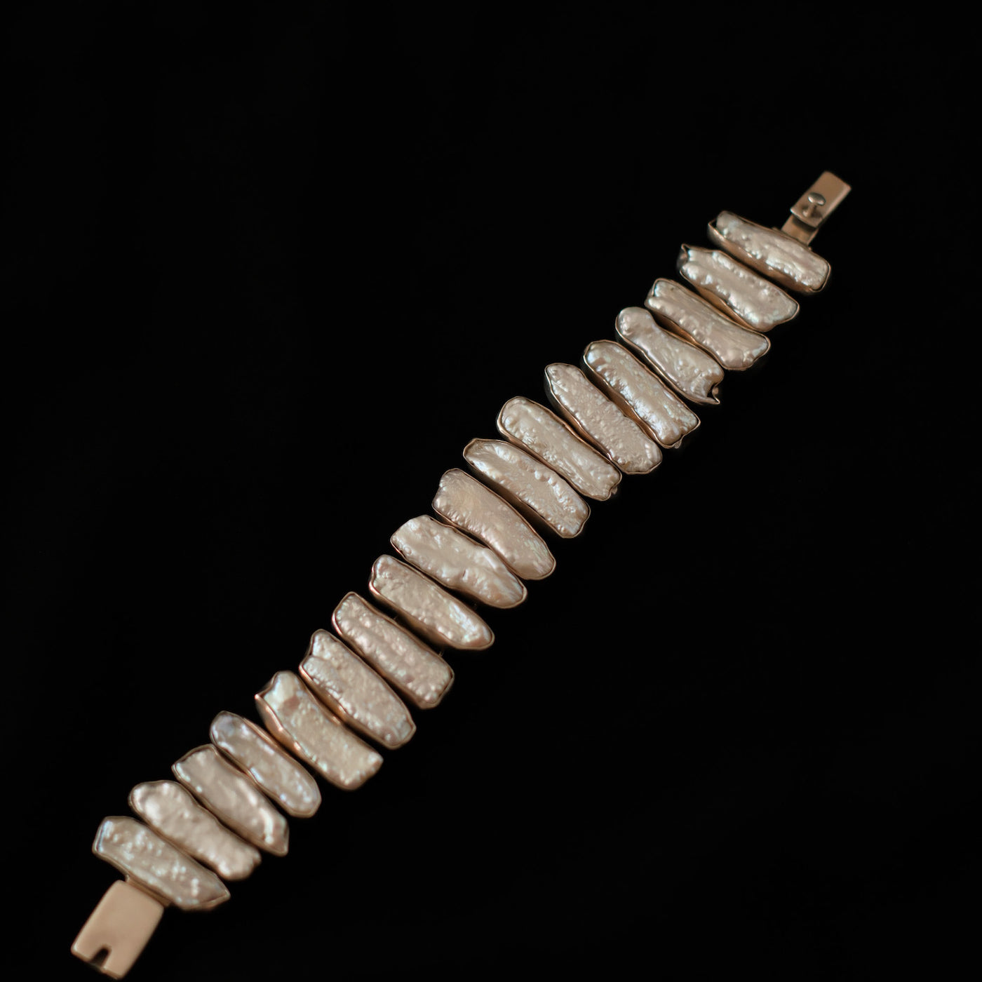 Pulsera artesanal hecha a mano con plata de ley y perlas barrocas tipo Biwa. El cierre es de caja.
