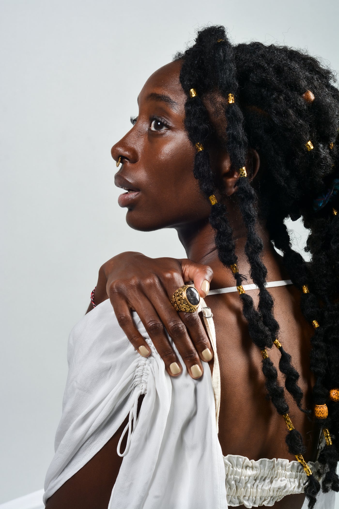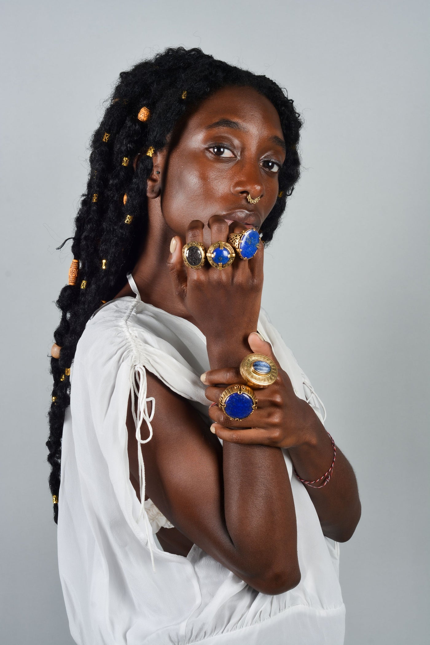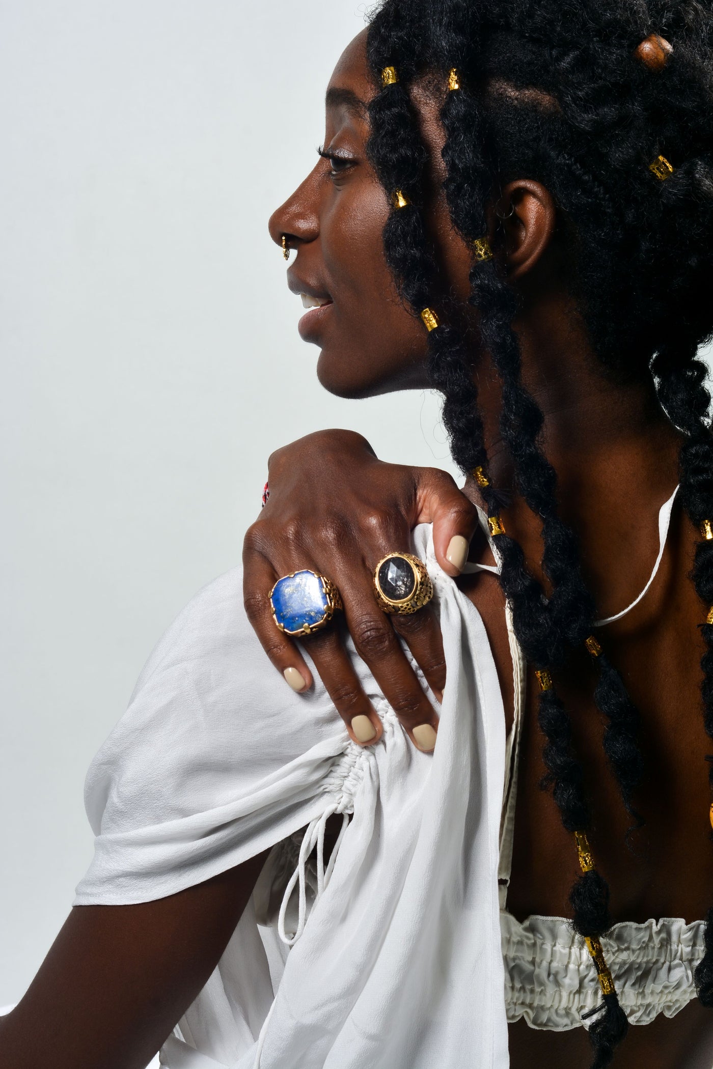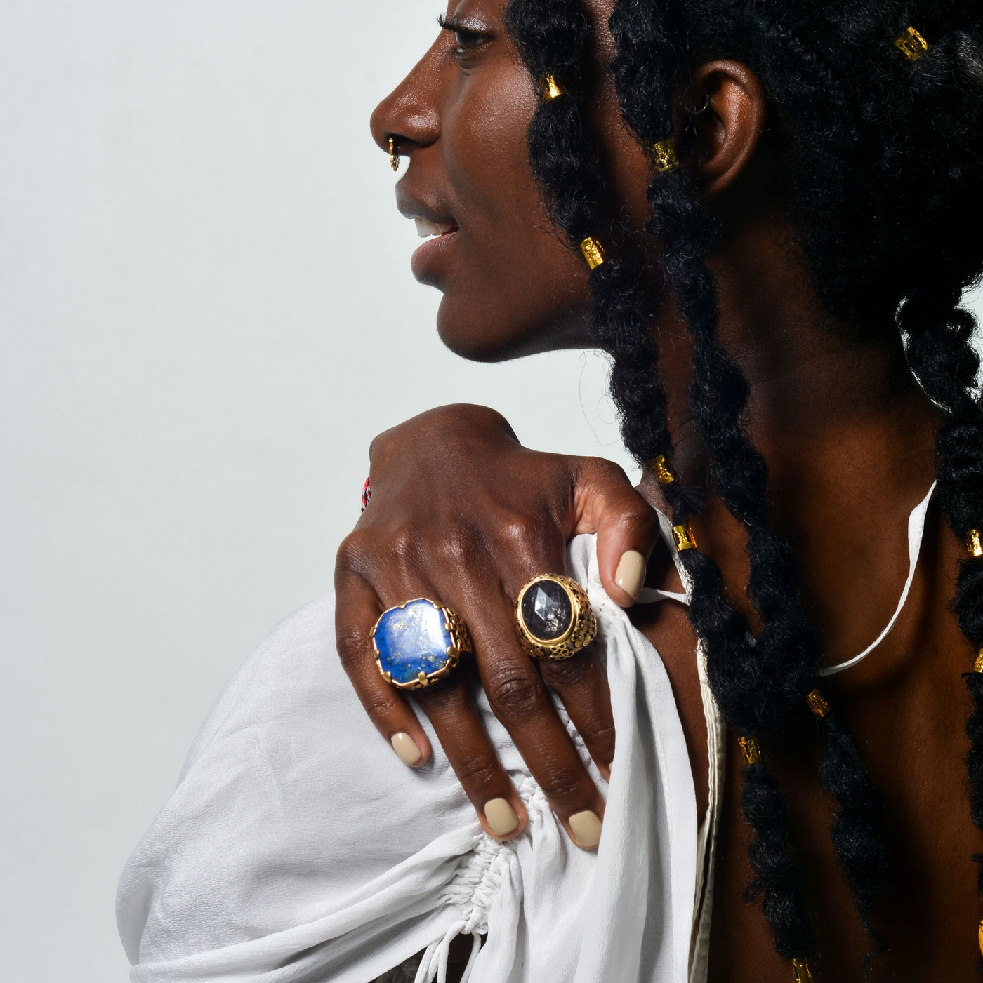 Handcrafted ring made with sterling silver, matte gold plating, and faceted rutilated smoky quartz.
