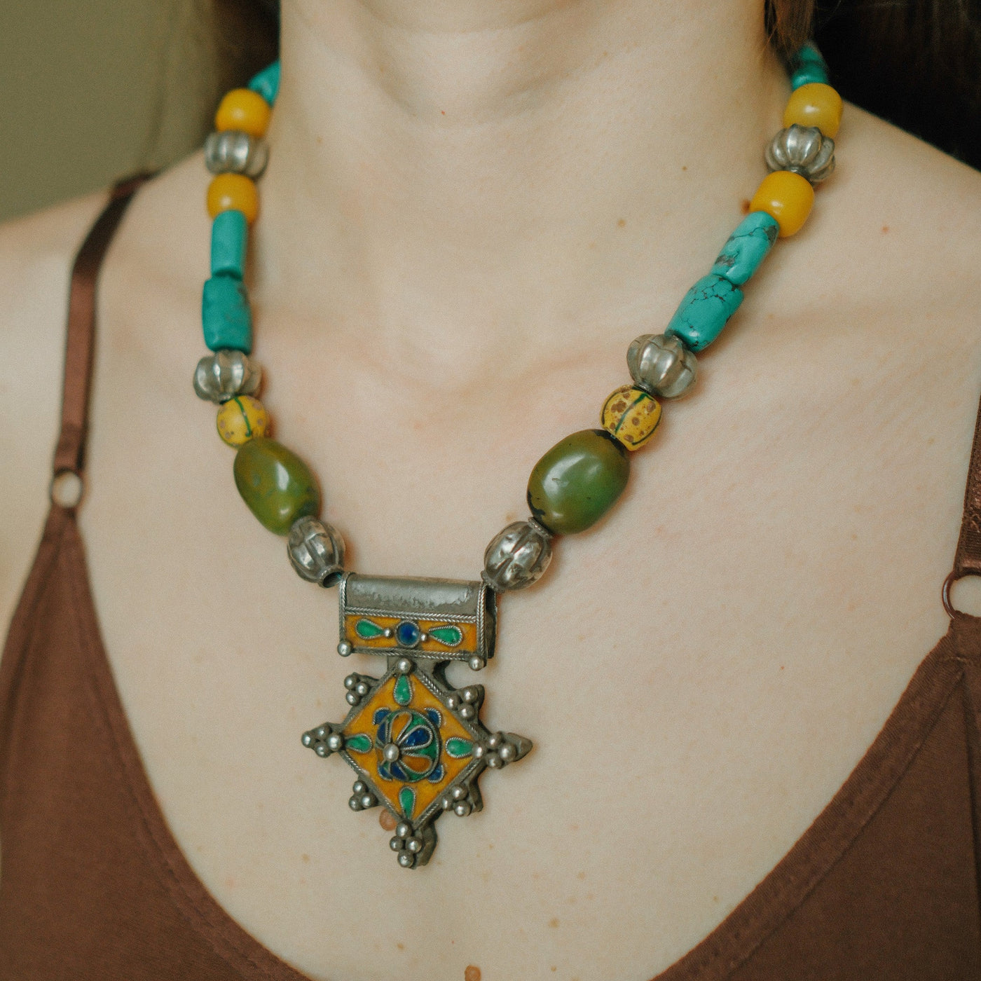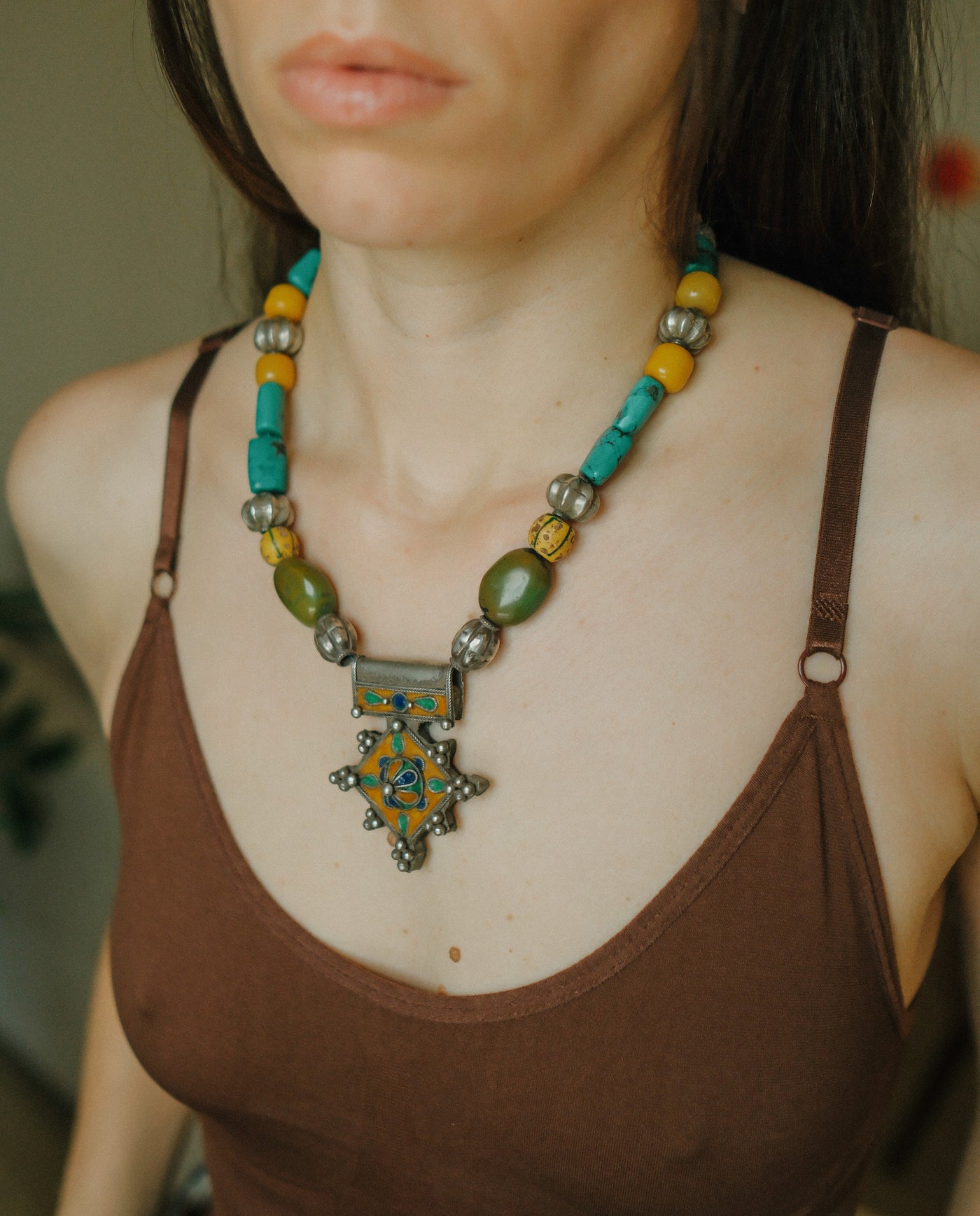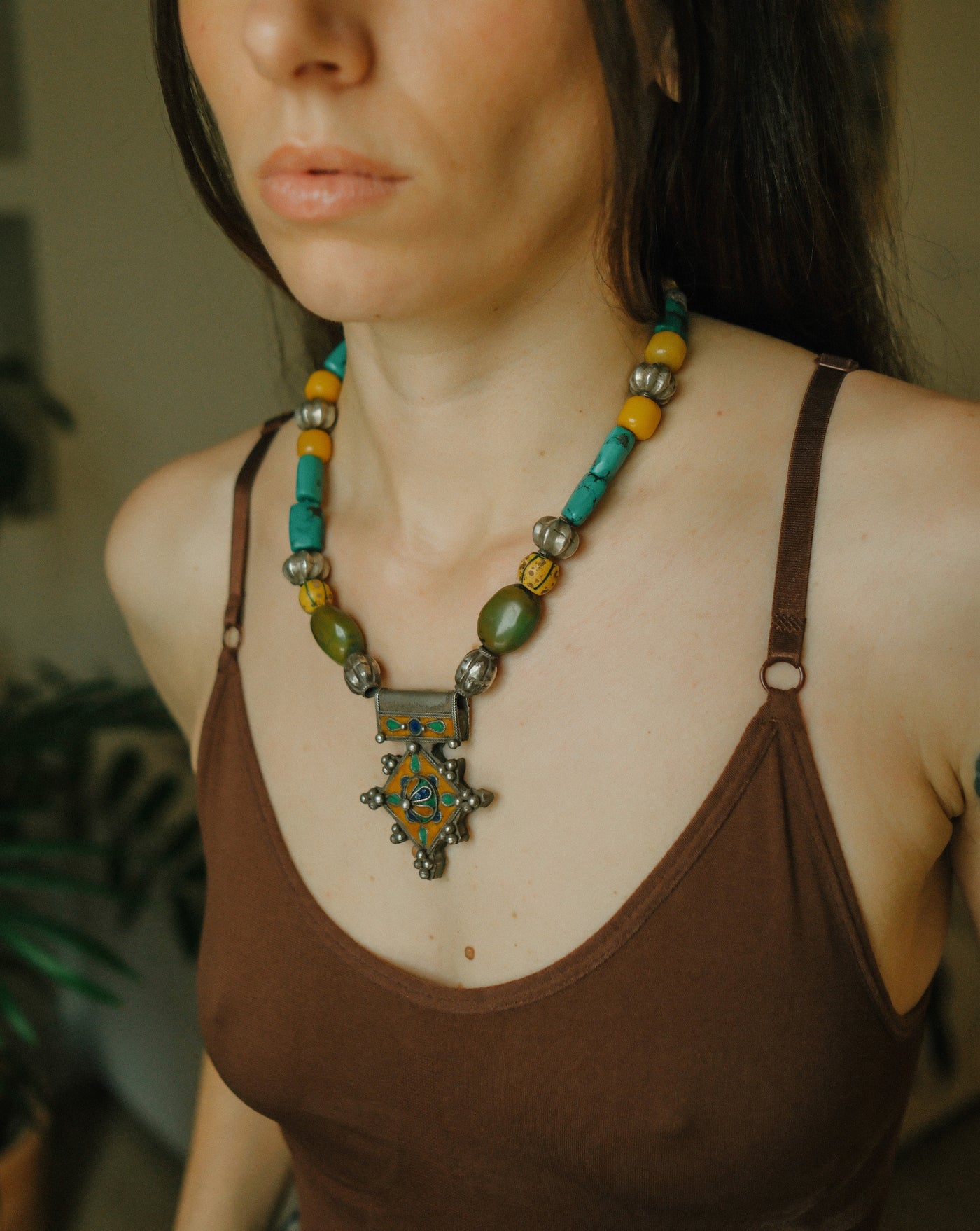 Unique piece by Lula Maiz designed with an antique silver and enamel Boghdad (Southern Cross), combined with Tibetan turquoise, African amber, antique Venetian glass barter beads and antique silver beads from Pakistan.