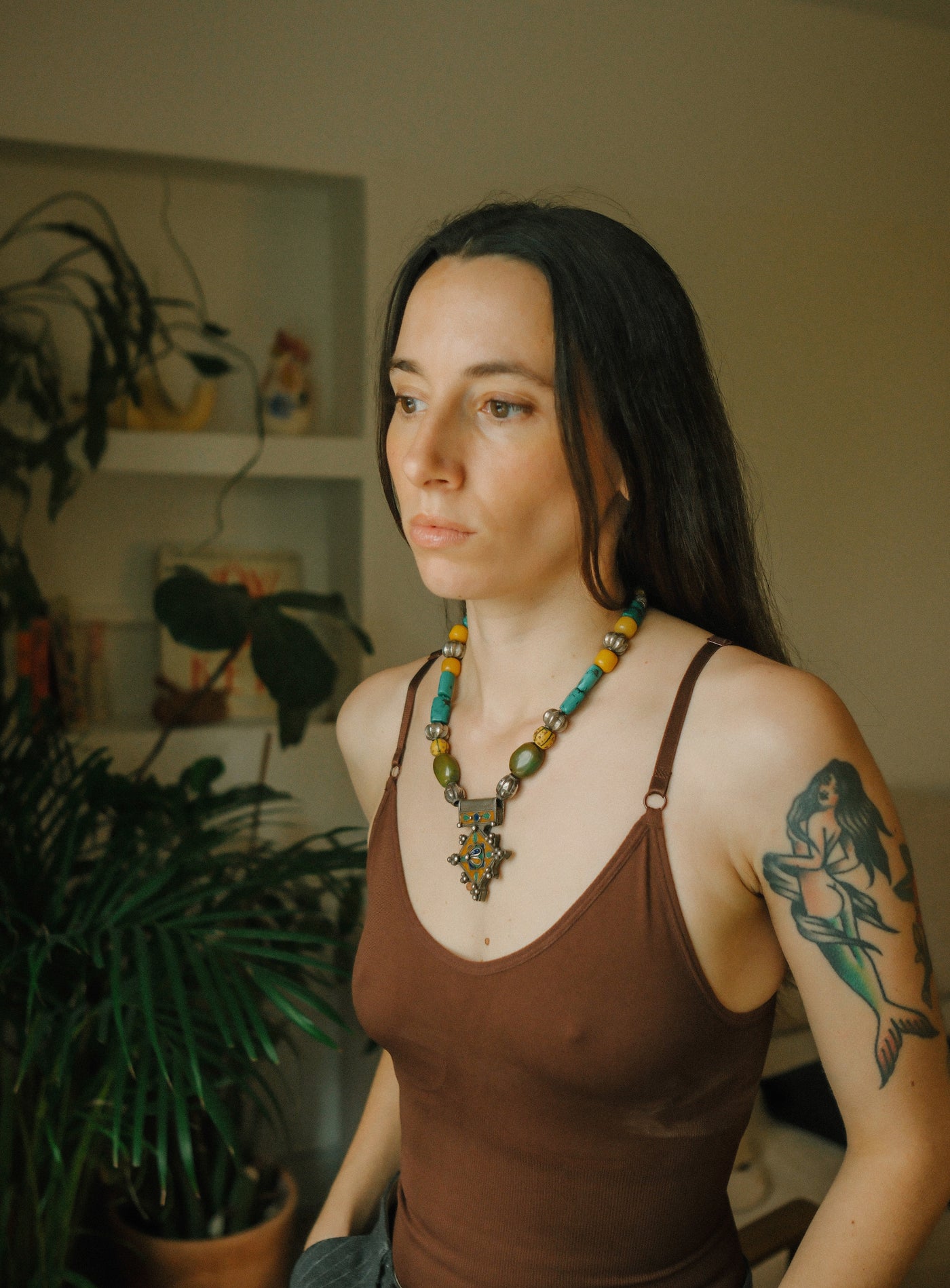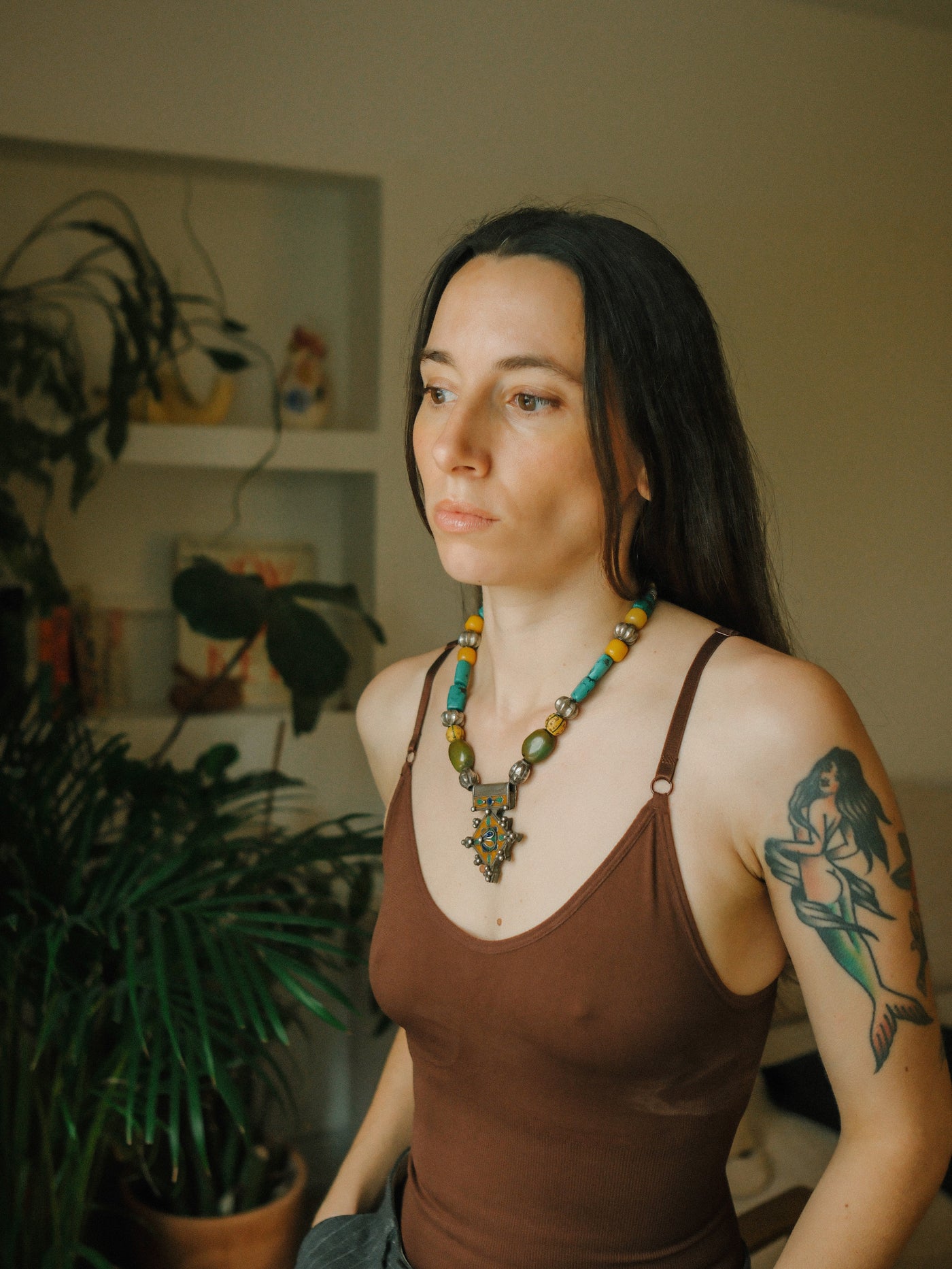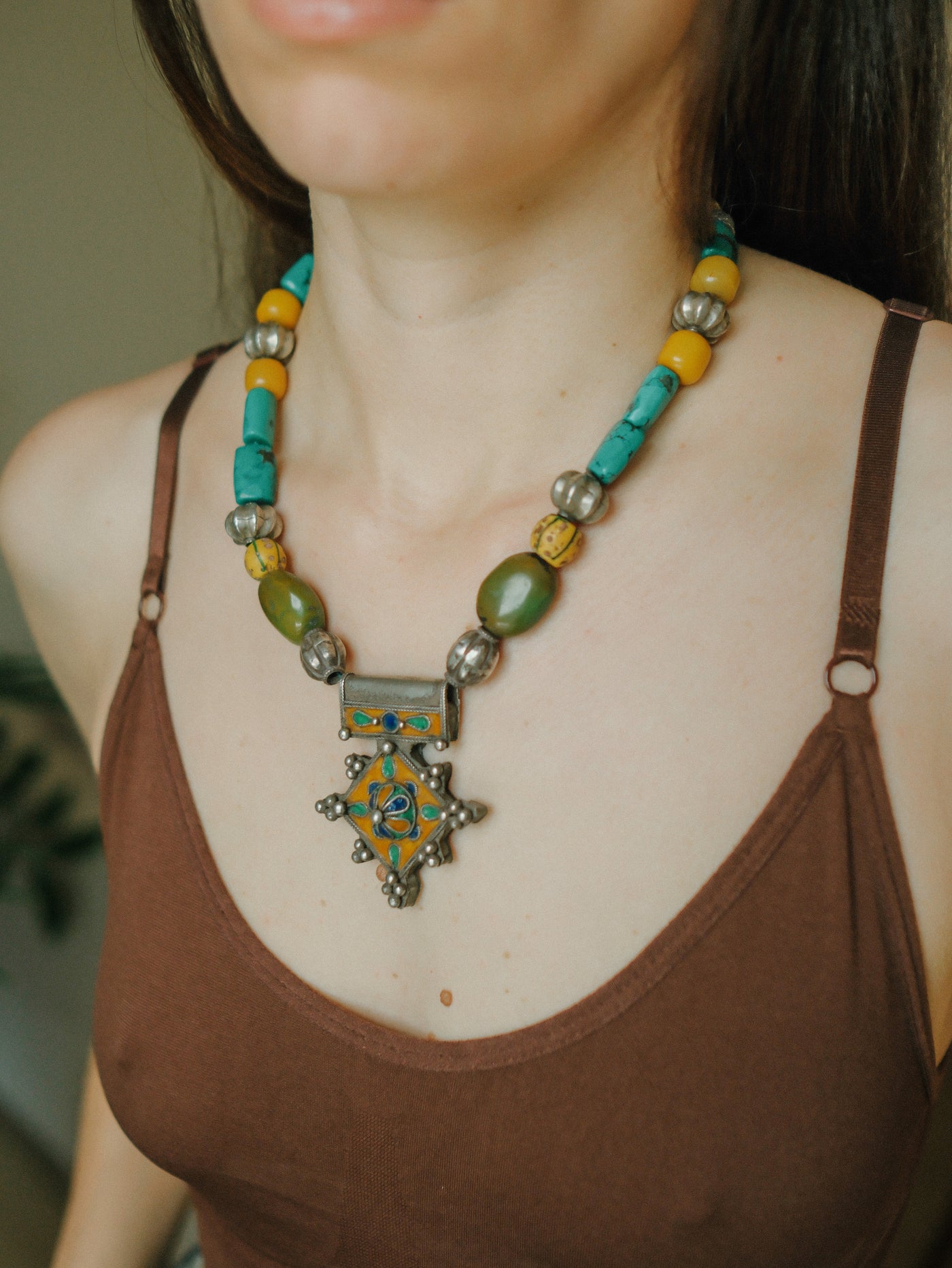 Unique piece by Lula Maiz designed with an antique silver and enamel Boghdad (Southern Cross), combined with Tibetan turquoise, African amber, antique Venetian glass barter beads and antique silver beads from Pakistan.