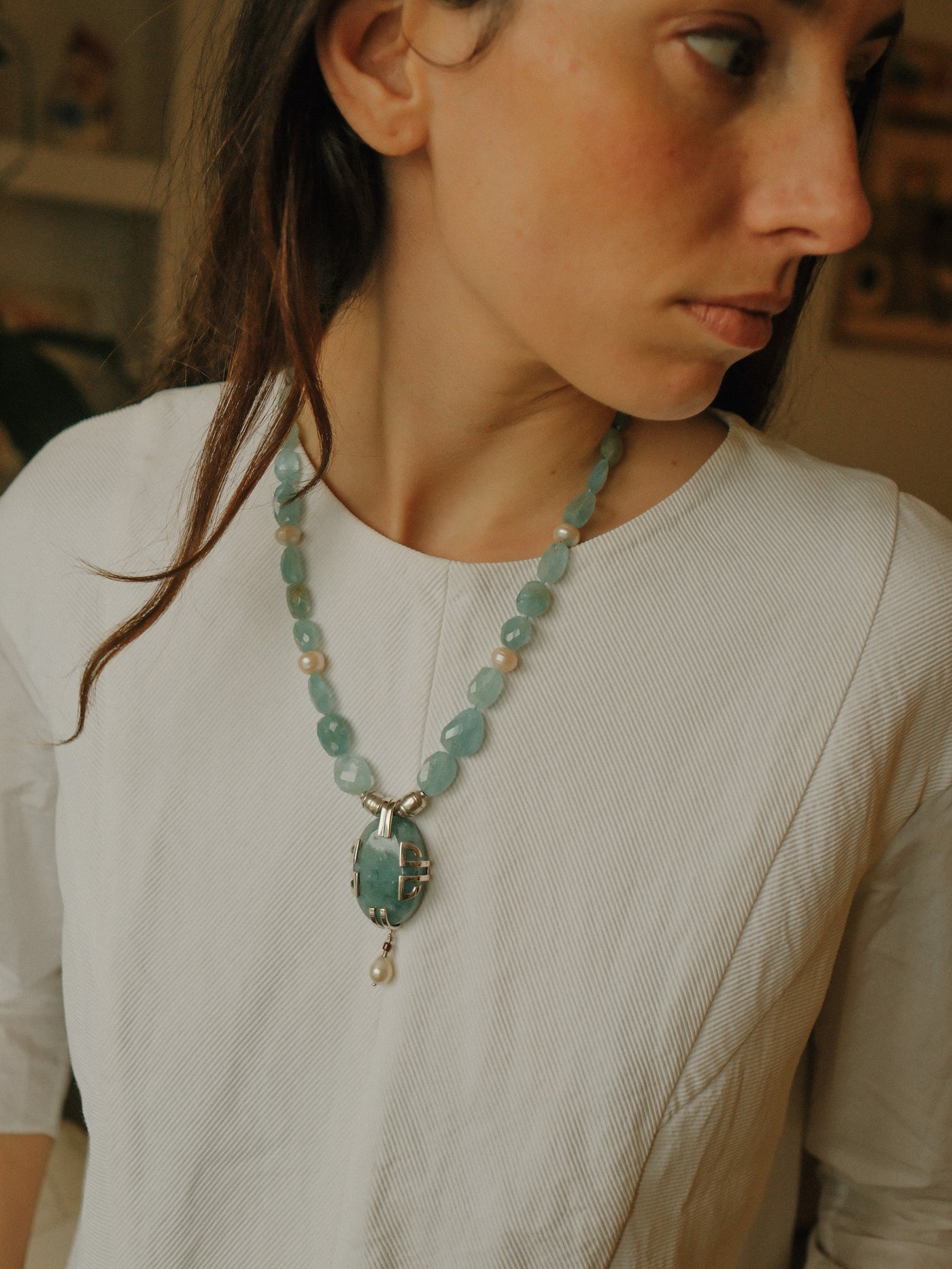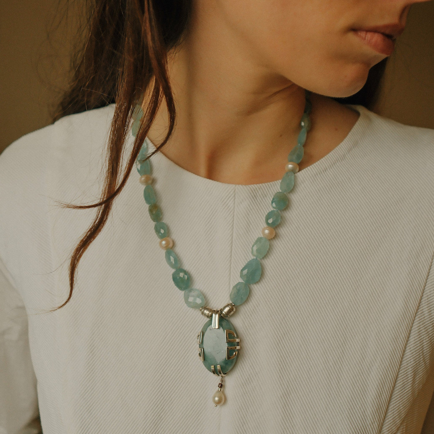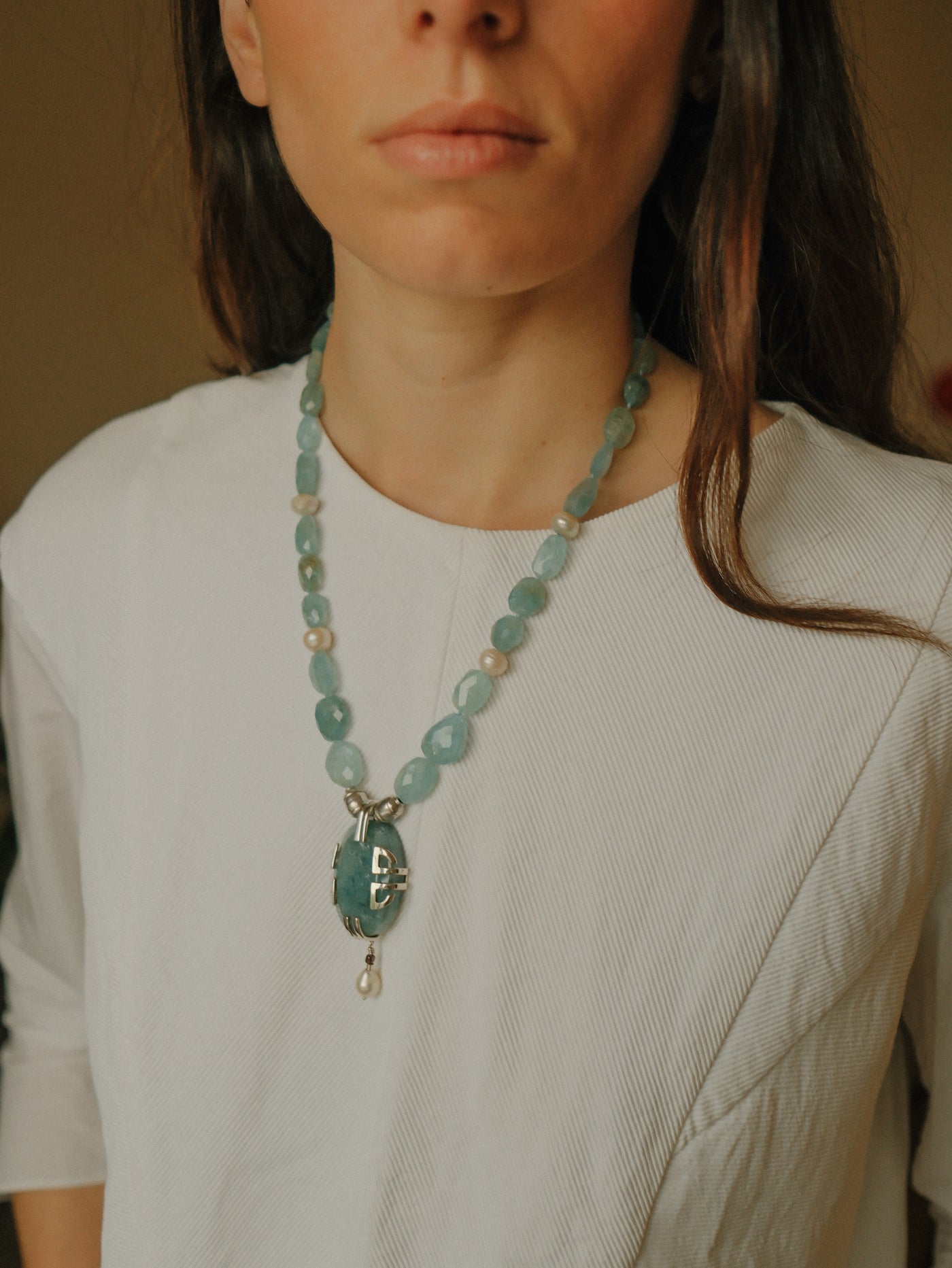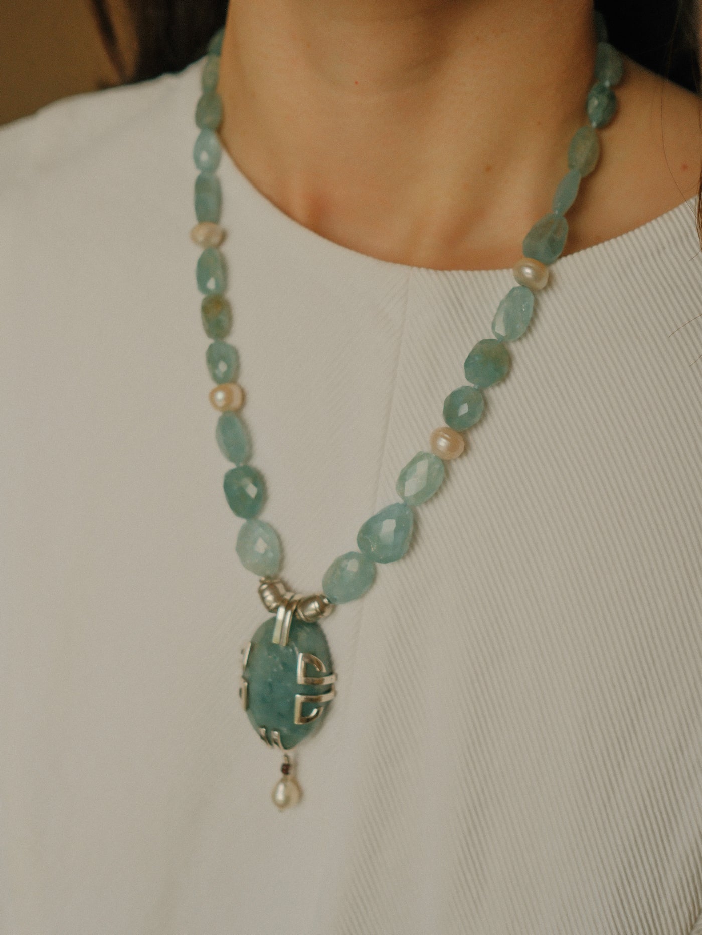 Necklace with a silver pendant, large aquamarine and pearl, combined with faceted aquamarine beads, pearls, and sterling silver spacers. The clasp is a lobster clasp, also in sterling silver.