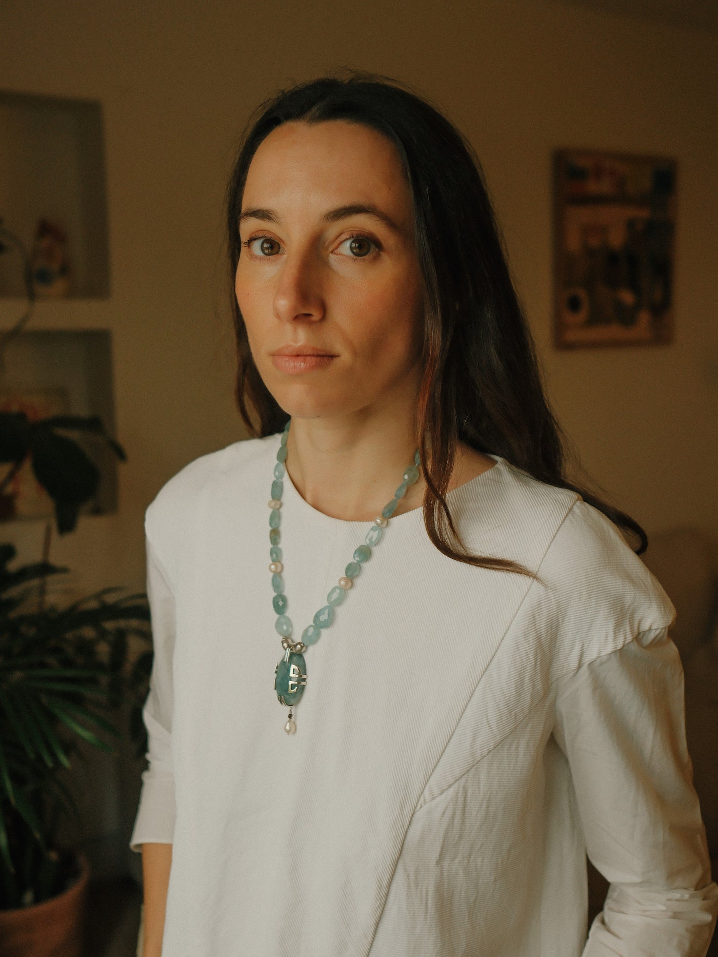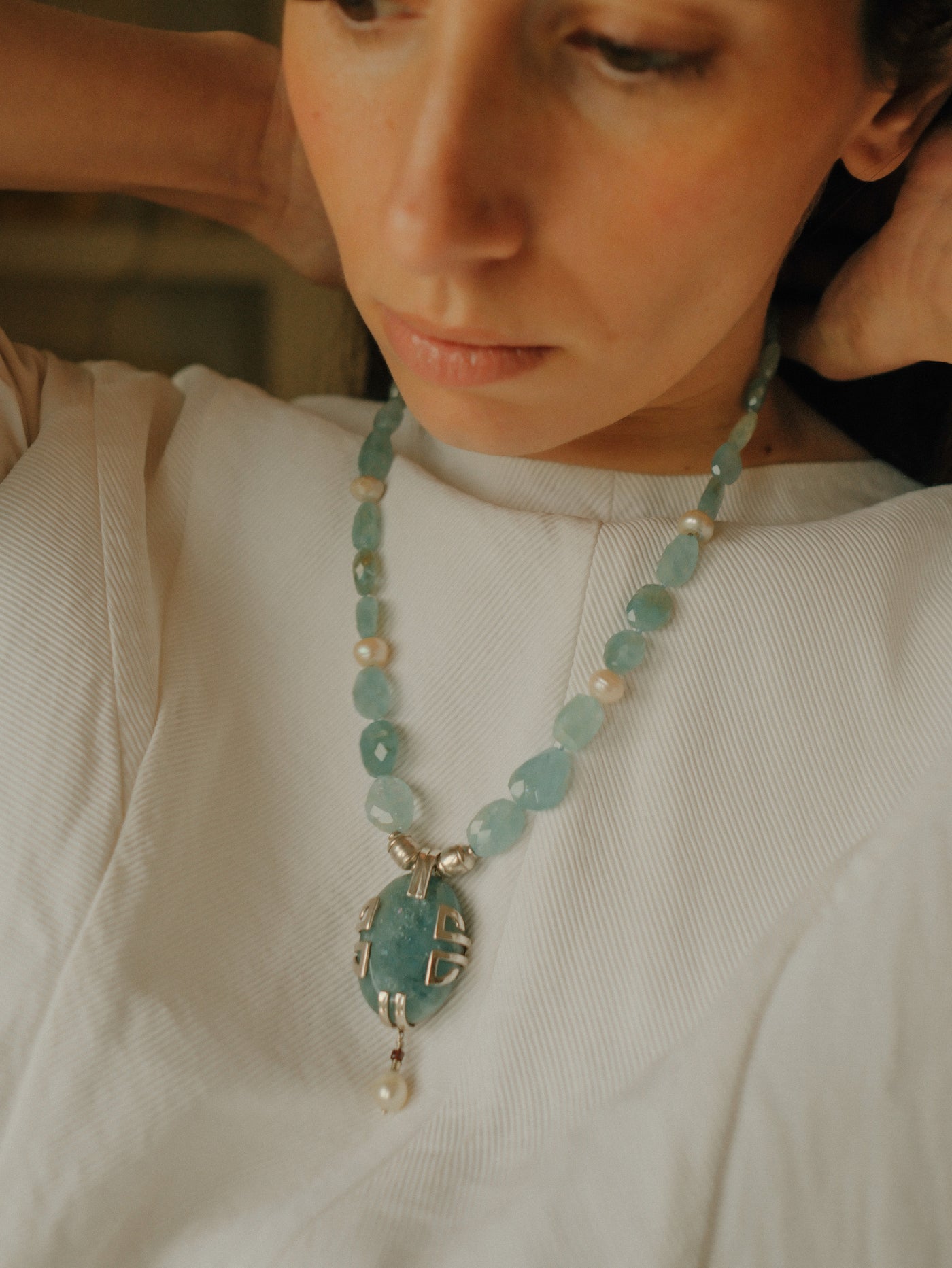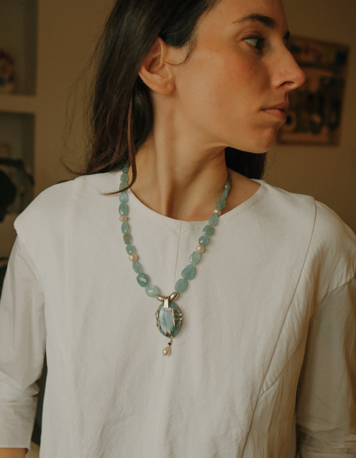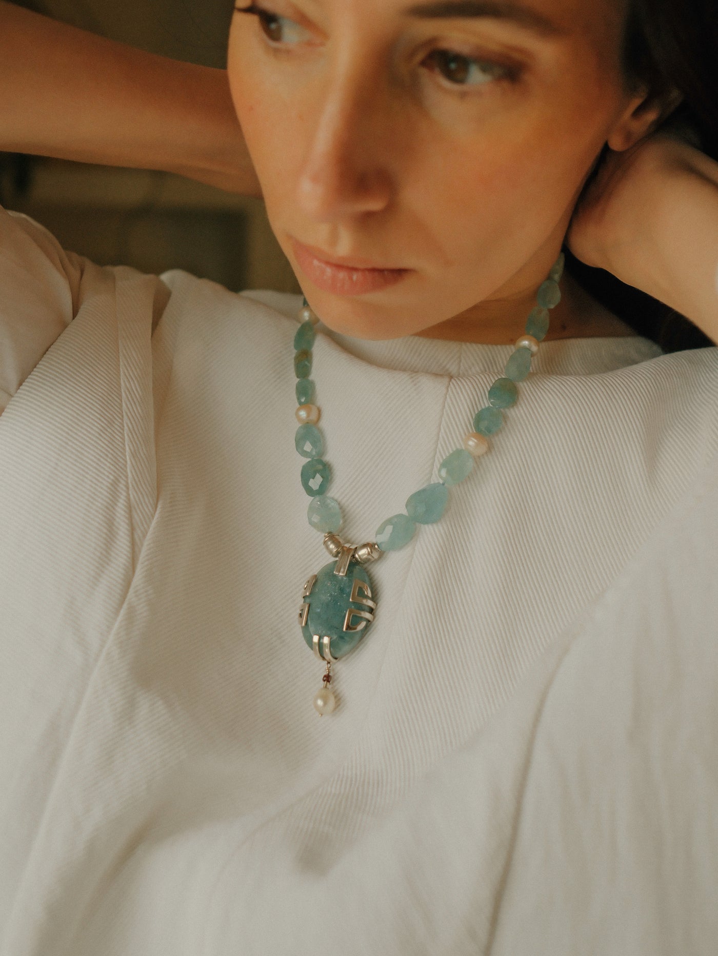 Necklace with a silver pendant, large aquamarine and pearl, combined with faceted aquamarine beads, pearls, and sterling silver spacers. The clasp is a lobster clasp, also in sterling silver.