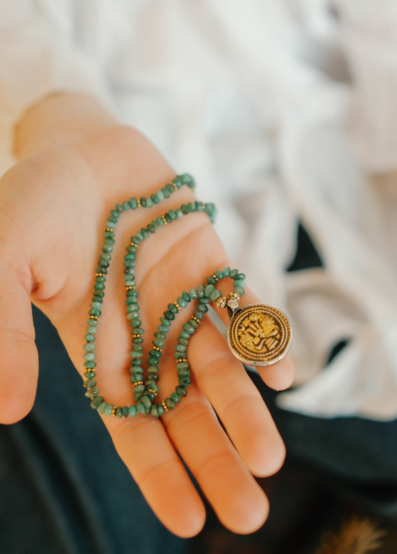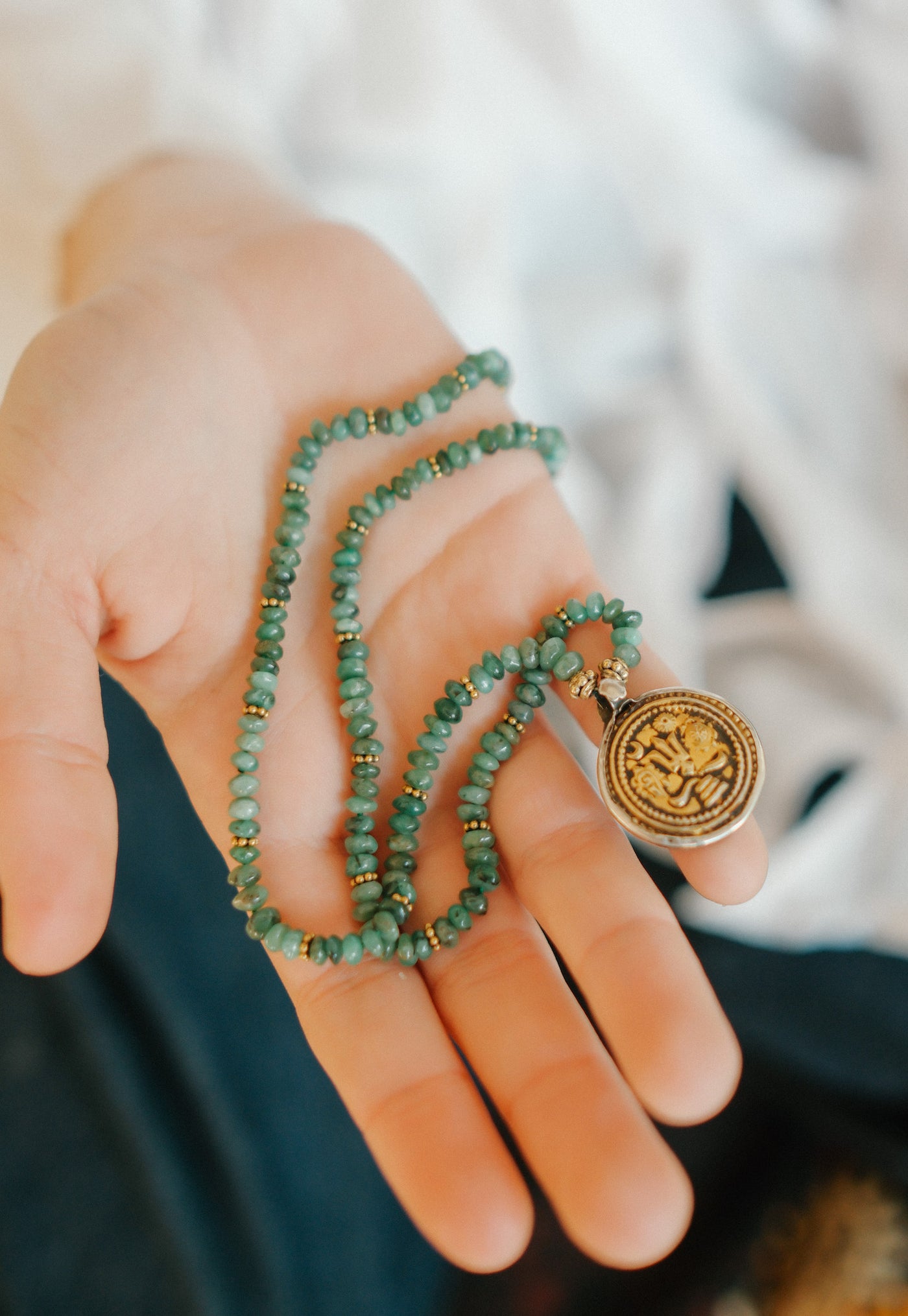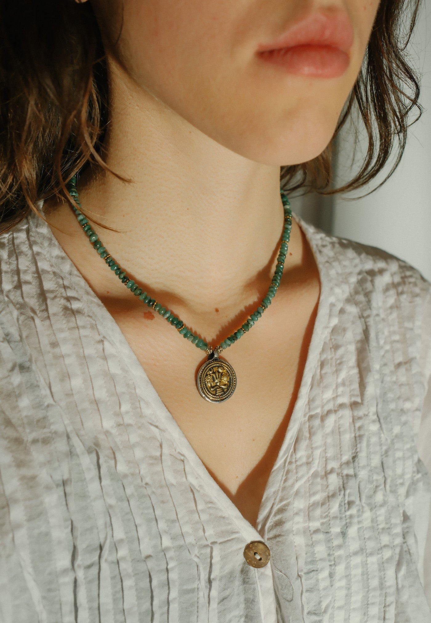 Necklace with an antique Indian silver pendant depicting the Trishula (sacred trident of the god Shiva), symbolizing creation, preservation, and destruction, with a crescent moon symbolizing control over time and nature, and a lion, a symbol of power and protection. This unique Lula Máiz piece is set with rondelle emeralds and gilded silver beads. It closes with a gilded silver lobster clasp.