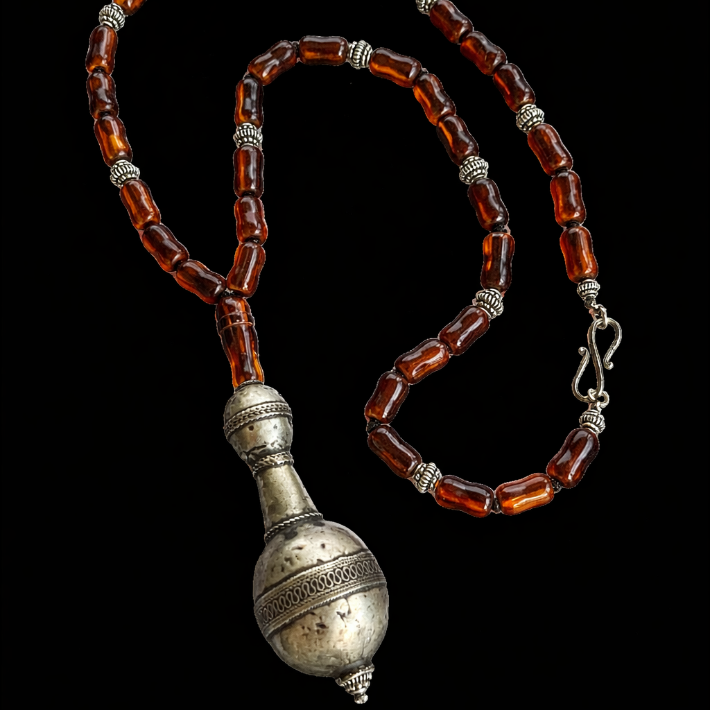 Necklace with antique silver pendant from Afghanistan, this time combined with amber pieces from an antique tasbih (Muslim prayer beads) and sterling silver beads. Unique piece by Lula Máiz.