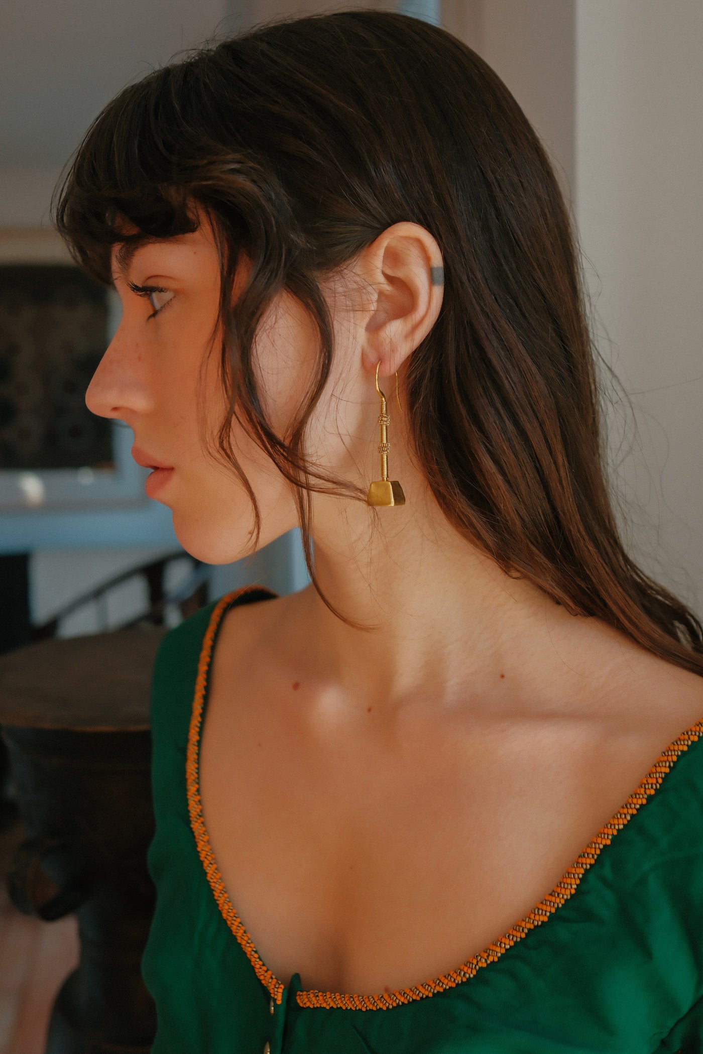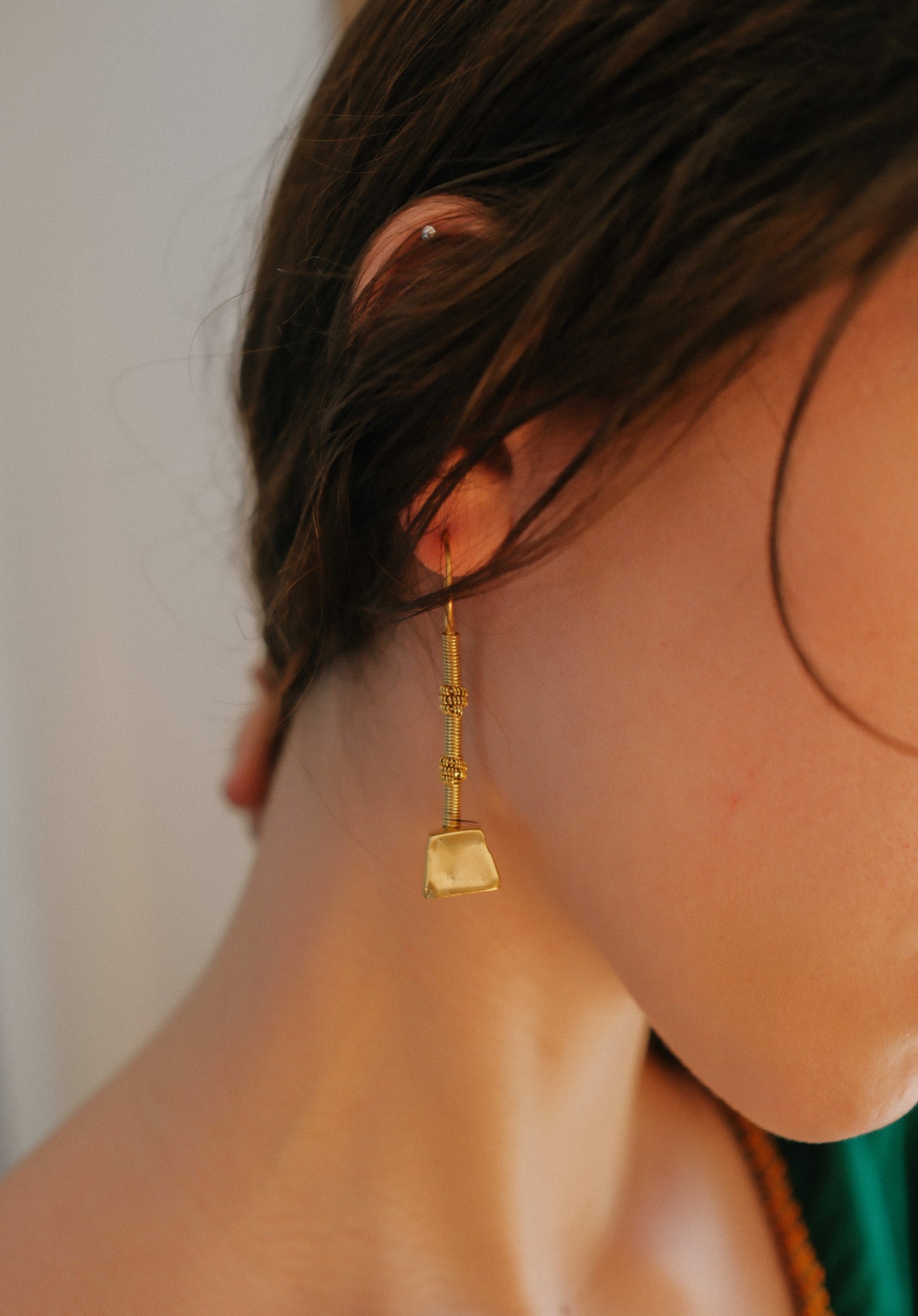 Antique silver earrings from the Rabari ethnic group, a nomadic group that primarily inhabits the State of Gujarat (India). They have a matted gold plating.