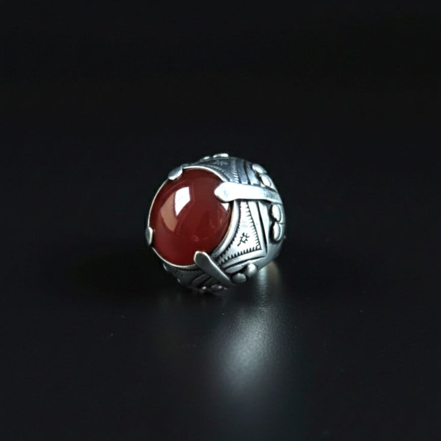 Anillo artesanal hecho a mano con plata de ley y cabujón de ágata cornalina.