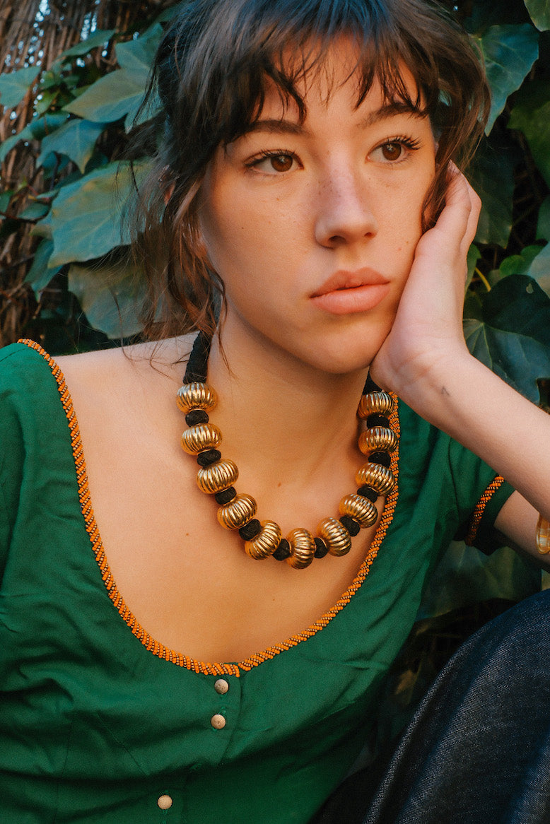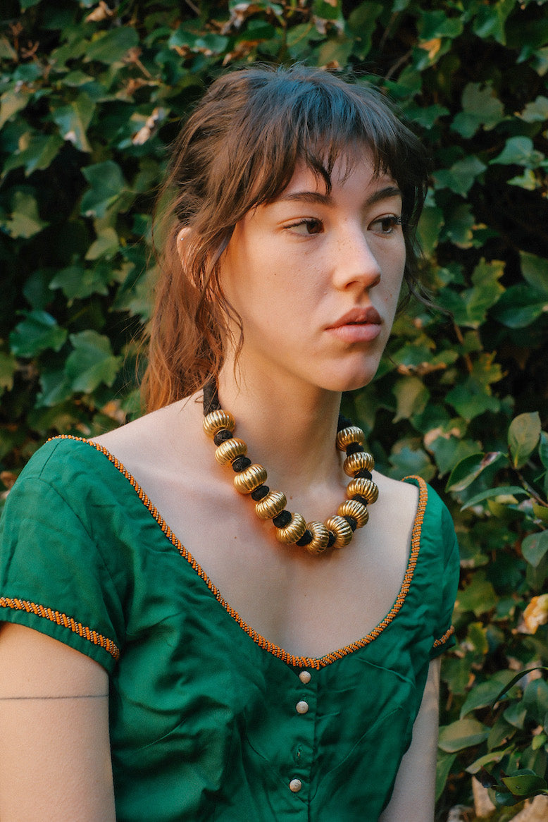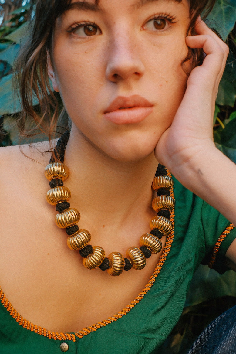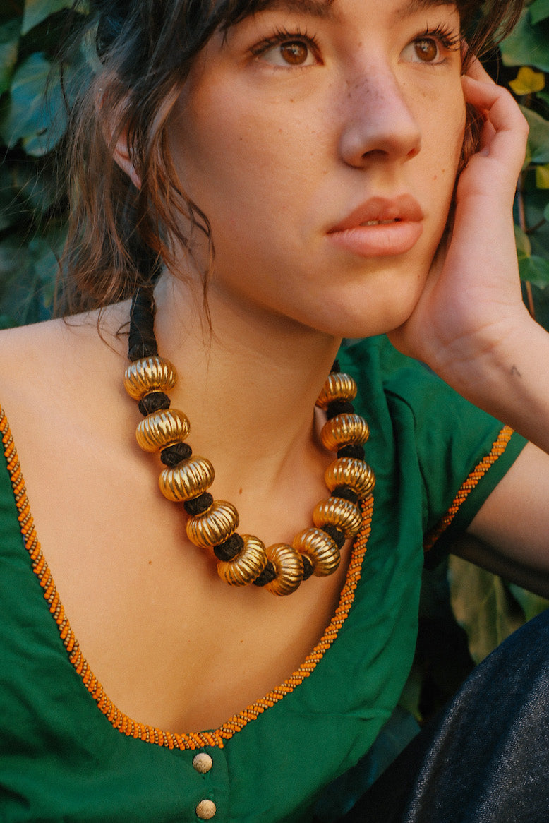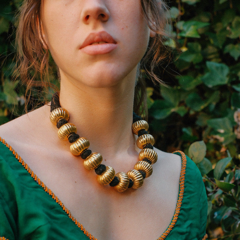 Colar étnico da Índia, feito com contas de uma fina camada de prata dourada em forma de cabaça sobre um núcleo de cera para lhes dar volume e resistência sem que se torne muito pesado. Está montado com a técnica tradicional de fio de algodão. Acredita-se que este fio preto absorva as energias negativas.
