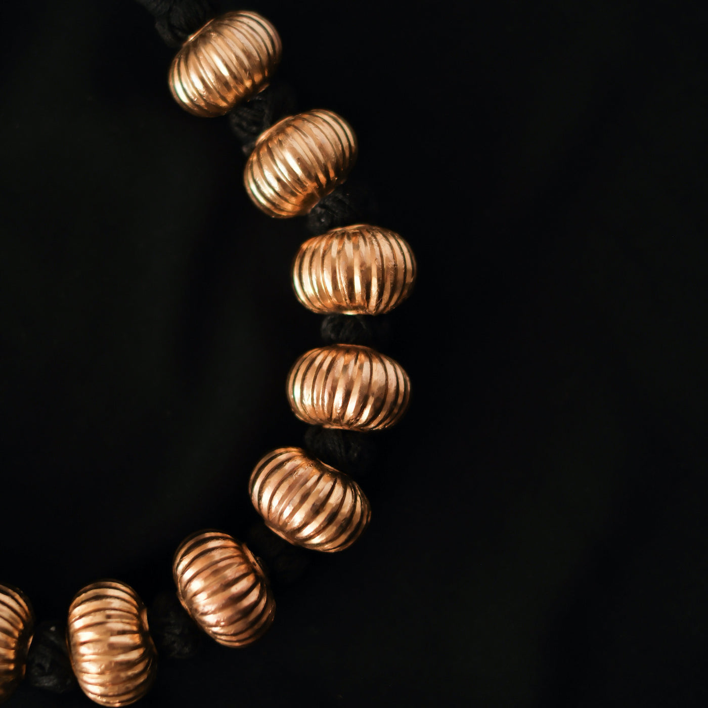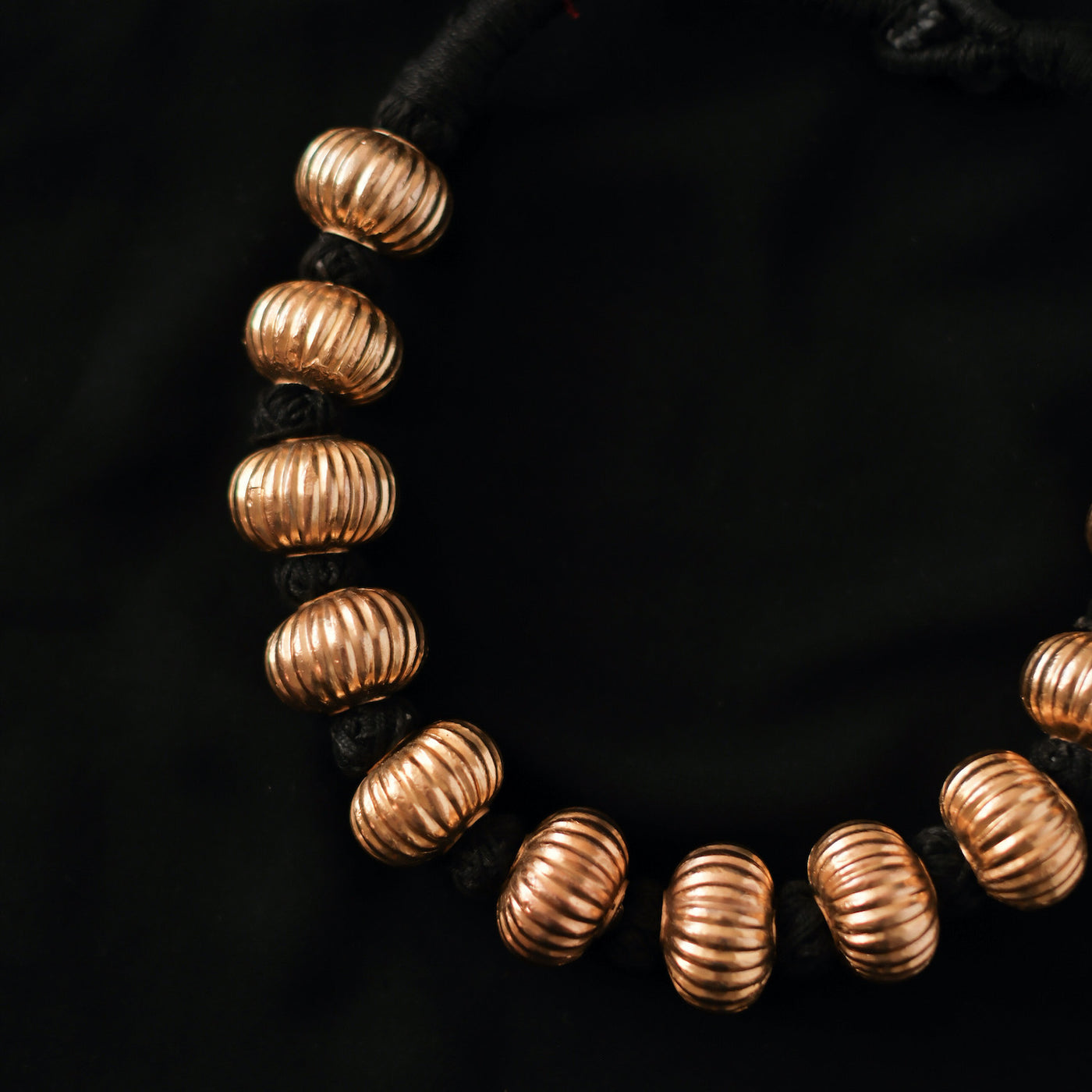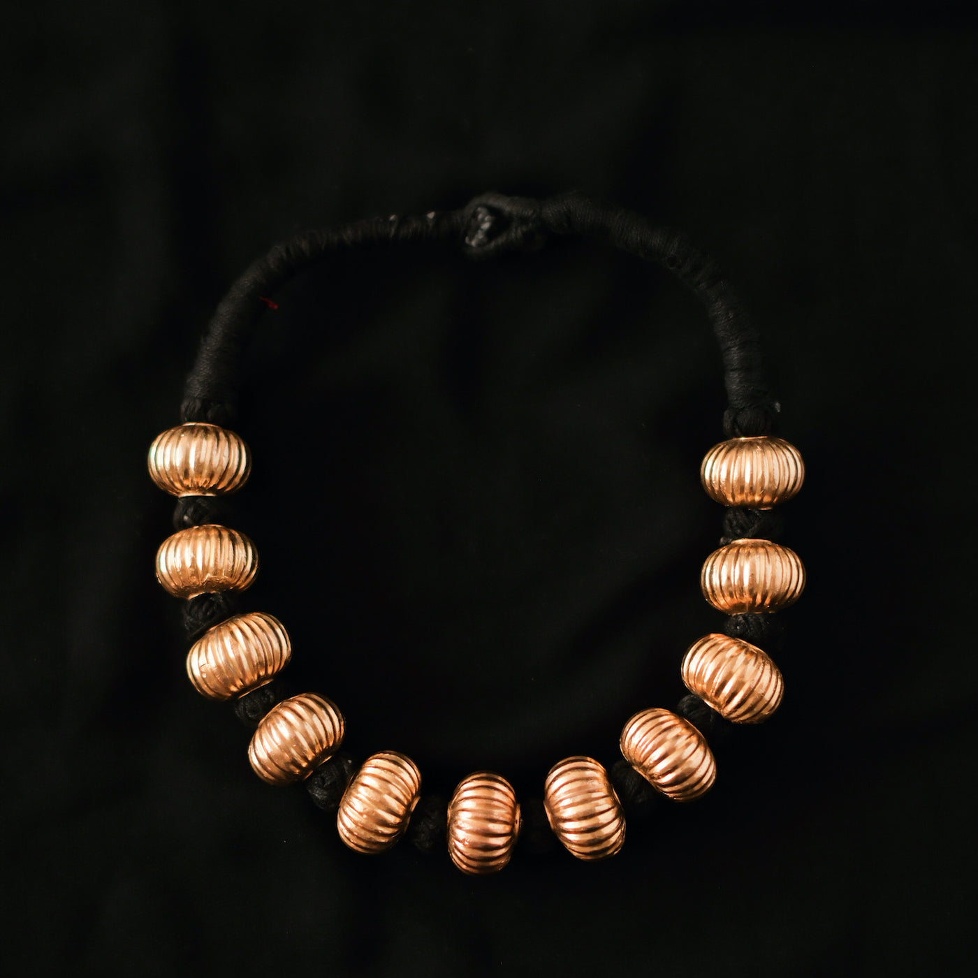 Colar étnico da Índia, feito com contas de uma fina camada de prata dourada em forma de cabaça sobre um núcleo de cera para lhes dar volume e resistência sem que se torne muito pesado. Está montado com a técnica tradicional de fio de algodão. Acredita-se que este fio preto absorva as energias negativas.