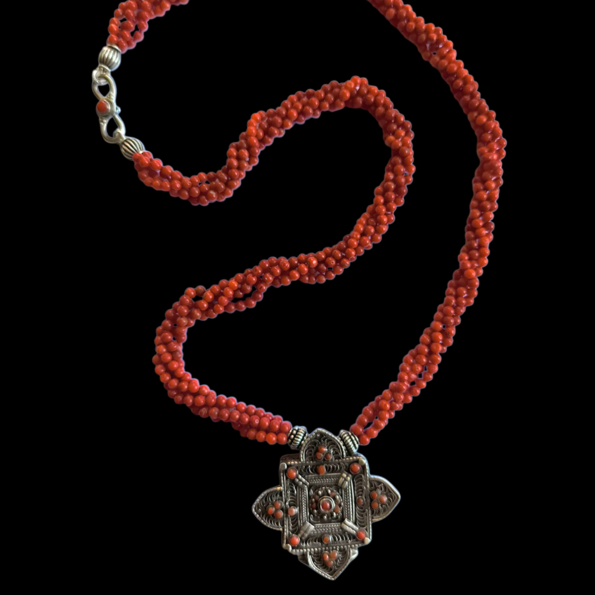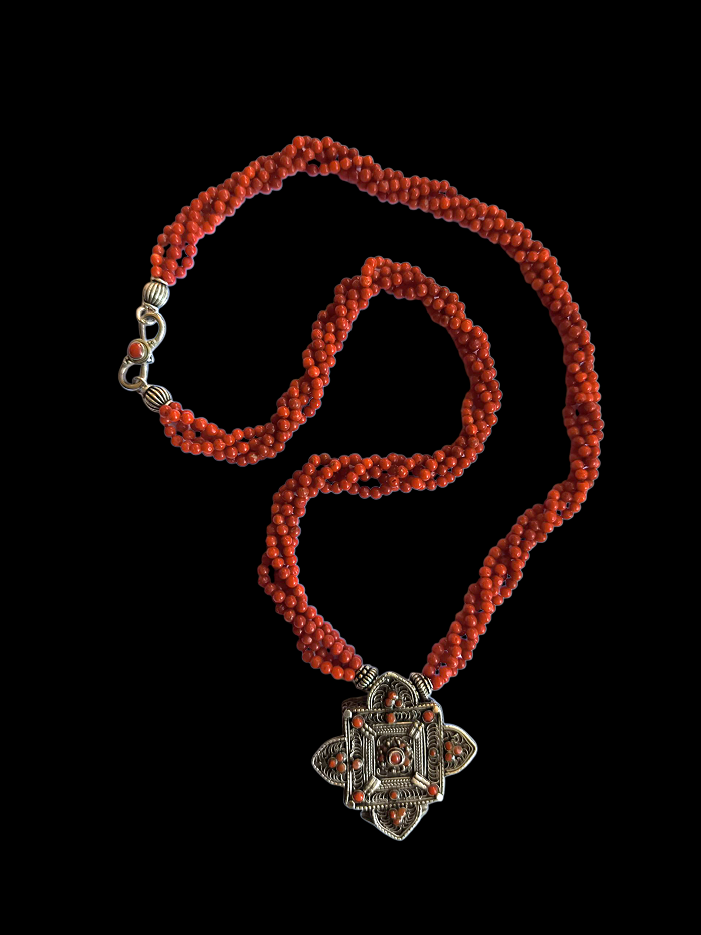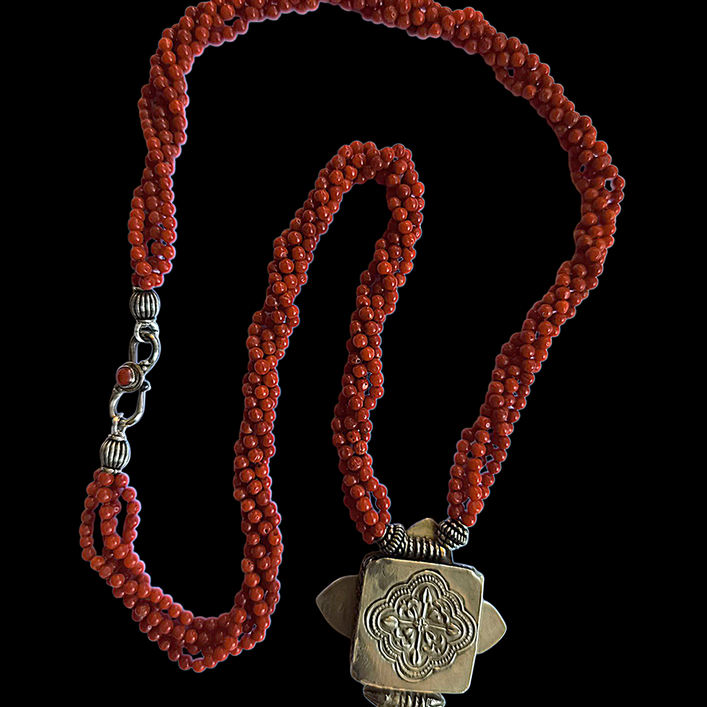 Colar com ghau tibetano, pingente de caixa de amuleto de prata e coral, cravejado com quatro voltas de contas de coral vermelho e prata esterlina. O fecho também é feito de prata e coral. Peça de Lula Maiz.