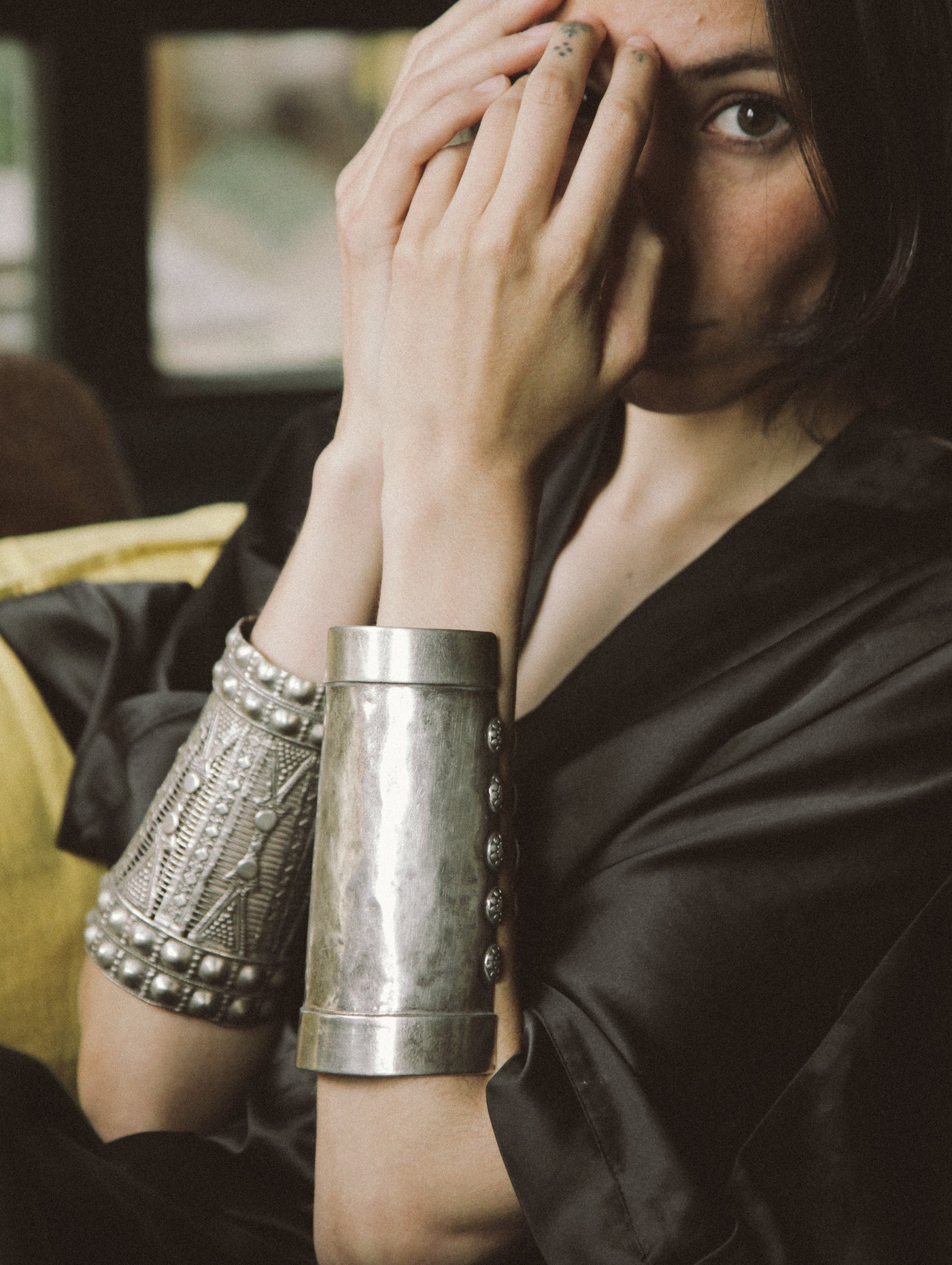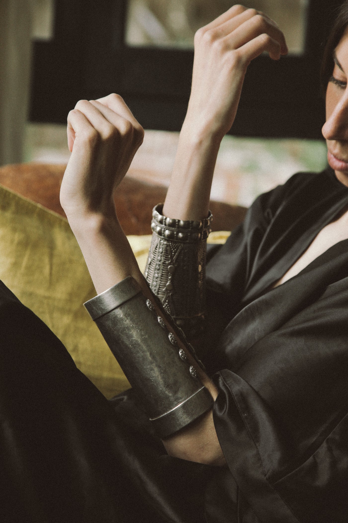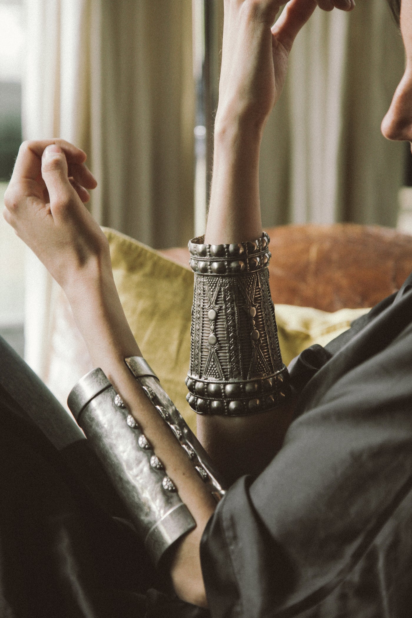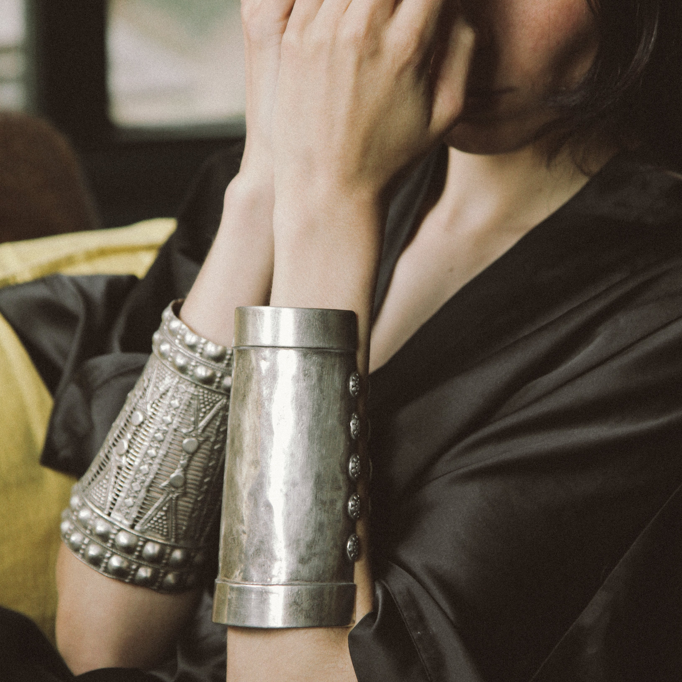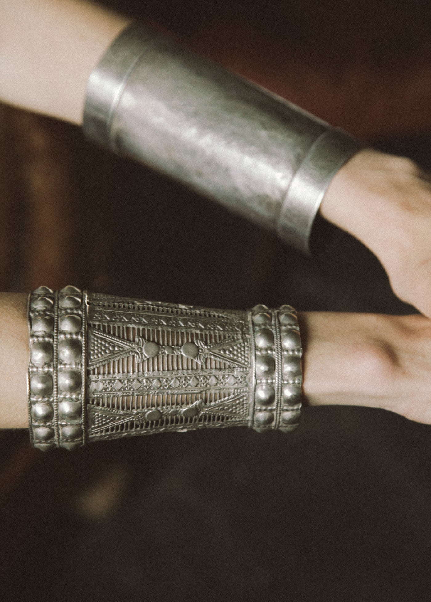 Bracelete antigo da etnia Kuchi, do Afeganistão, feito à mão com prata (normalmente proveniente da fundição de moedas) e técnica de martelado. Estas peças não eram apenas ornamentais, mas também serviam como armadura leve para proteger os pulsos. Pode ser aberto/fechado ligeiramente.